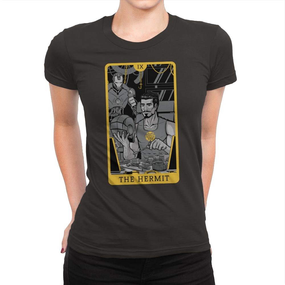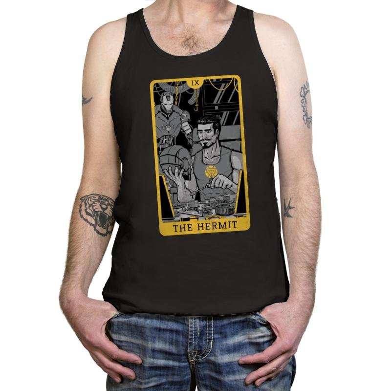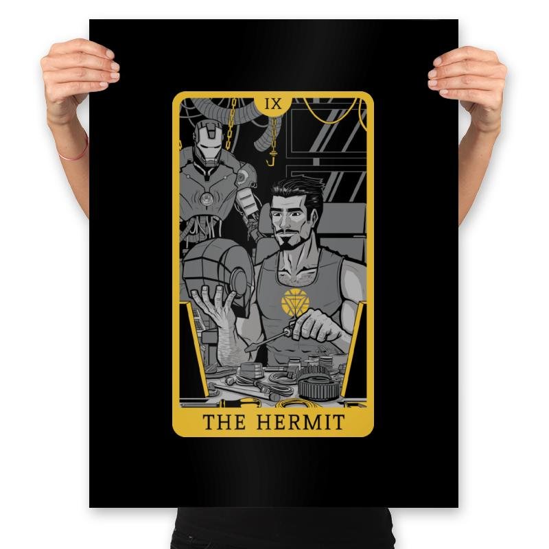The Hermit takes a unique approach to a classic tarot card design, featuring a character deeply immersed in their work. Inspired by the figure of The Hermit, this design showcases a beloved character, clad in a tank top, working intently on their creations. Surrounded by tools and machines, they embody introspection, focus, and innovation. The monochromatic style, accented by golden tones, gives the design a sleek, modern edge that resonates with fans who appreciate a blend of mysticism and technology.