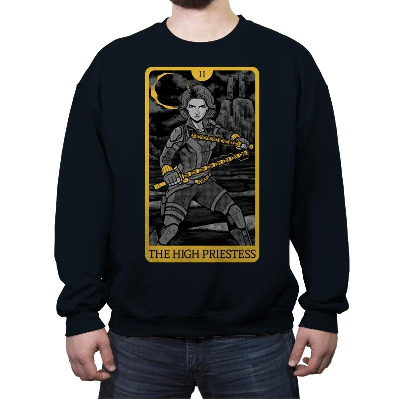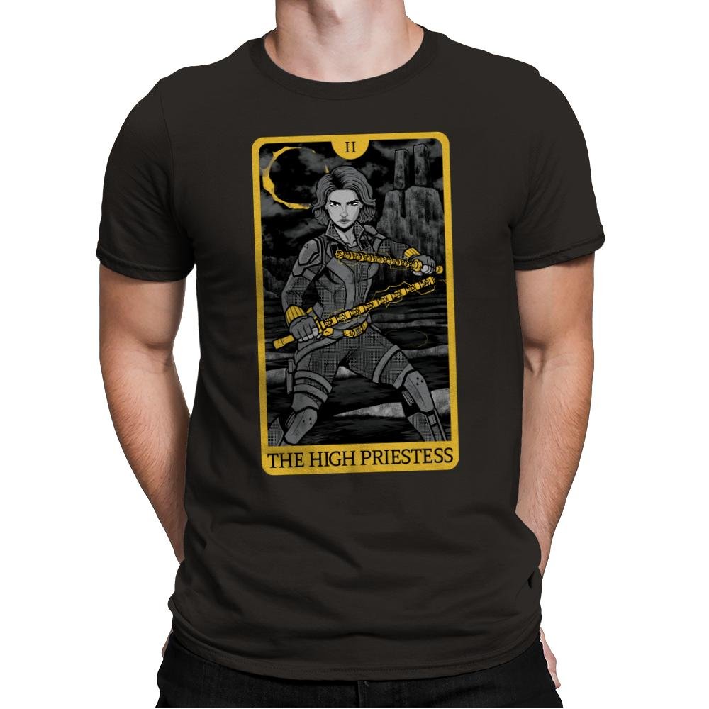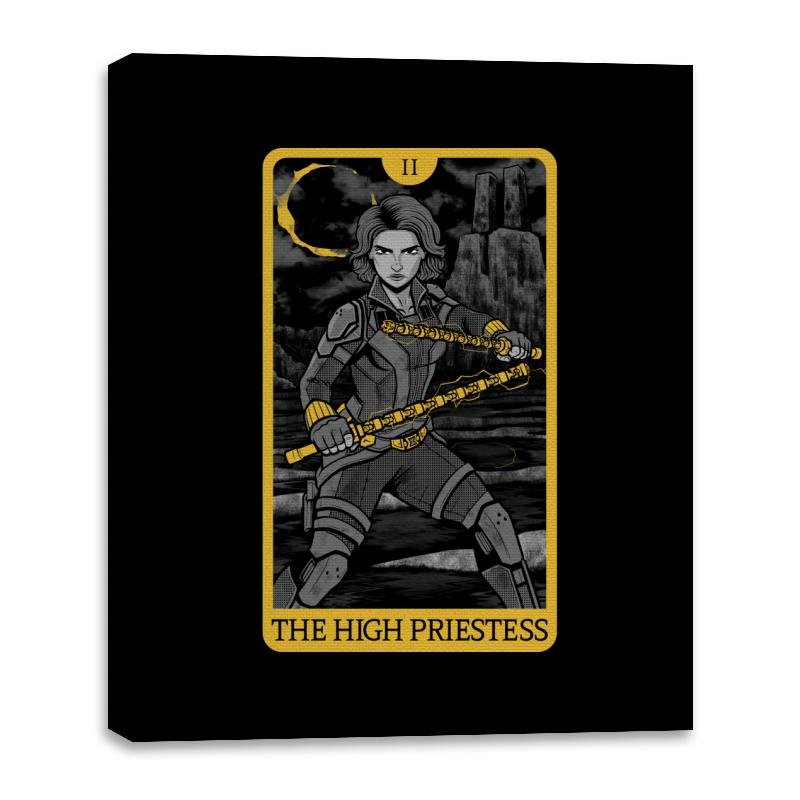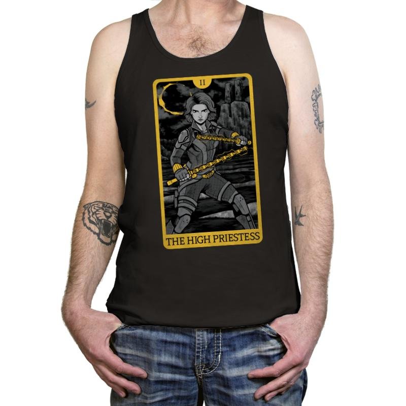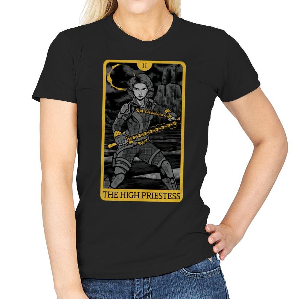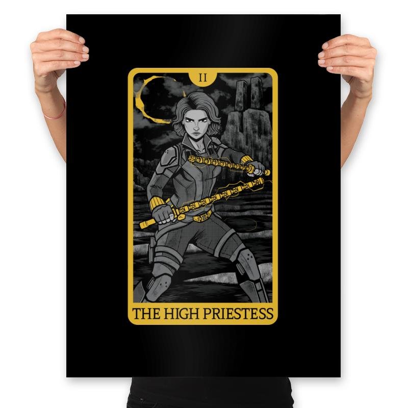 This design reframes a covert super spy as the tarot card of intuition and hidden knowledge. The figure stands poised with electrified batons ready, set against a barren cliffside and crescent moon. The palette stays mostly grayscale with gold outlines and accents, echoing traditional tarot decks while keeping modern tactical details. Fans will immediately recognize the mashup and understand why this particular archetype suits a character who operates through instinct and secrecy.