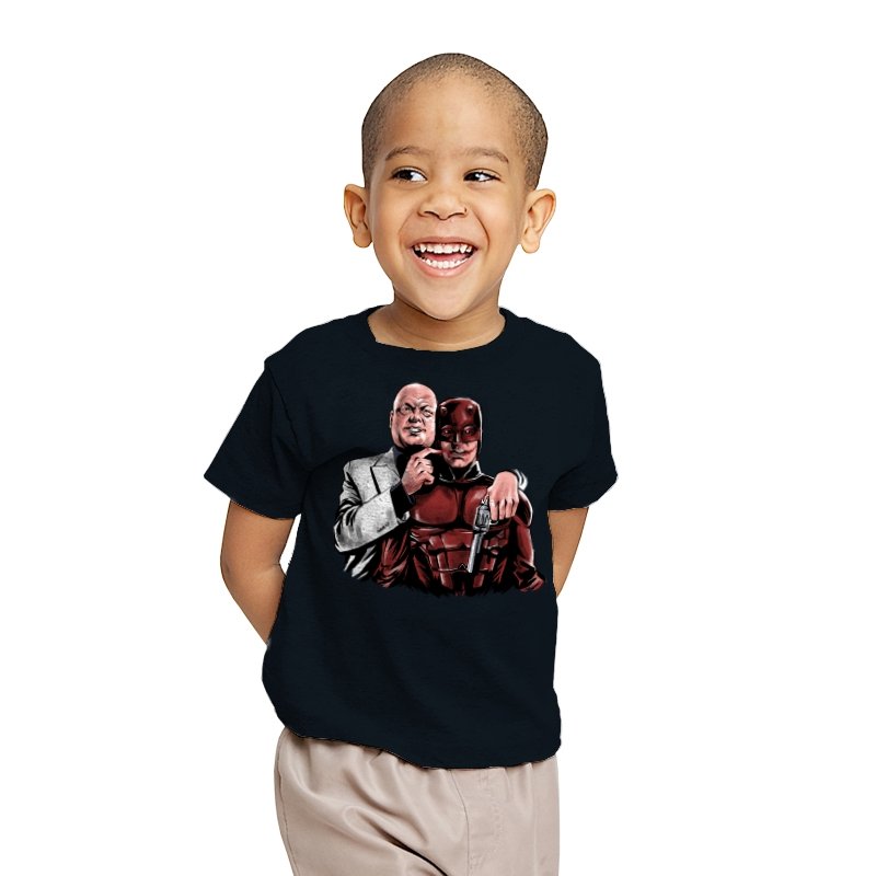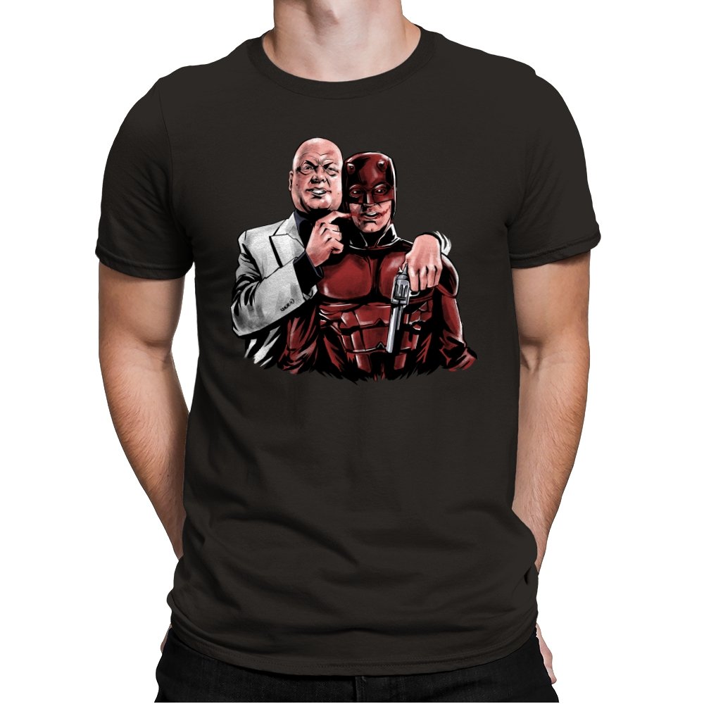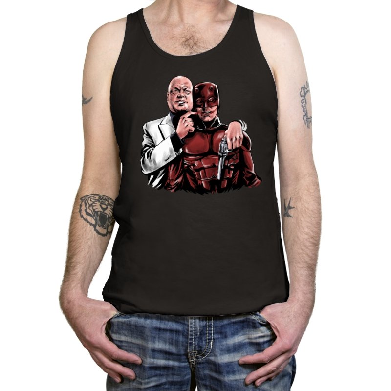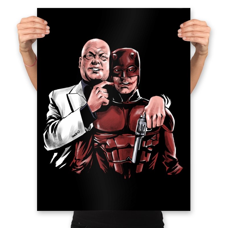This design plays with the uneasy relationship between brute power and street justice. A towering crime boss stands behind a battered vigilante, half control and half mockery, with a grip that says the joke is never really funny. The image leans into moral tension rather than hero worship, showing how thin the line is between protector and pawn. It feels like a single panel ripped from a darker storyline where nobody wins clean.