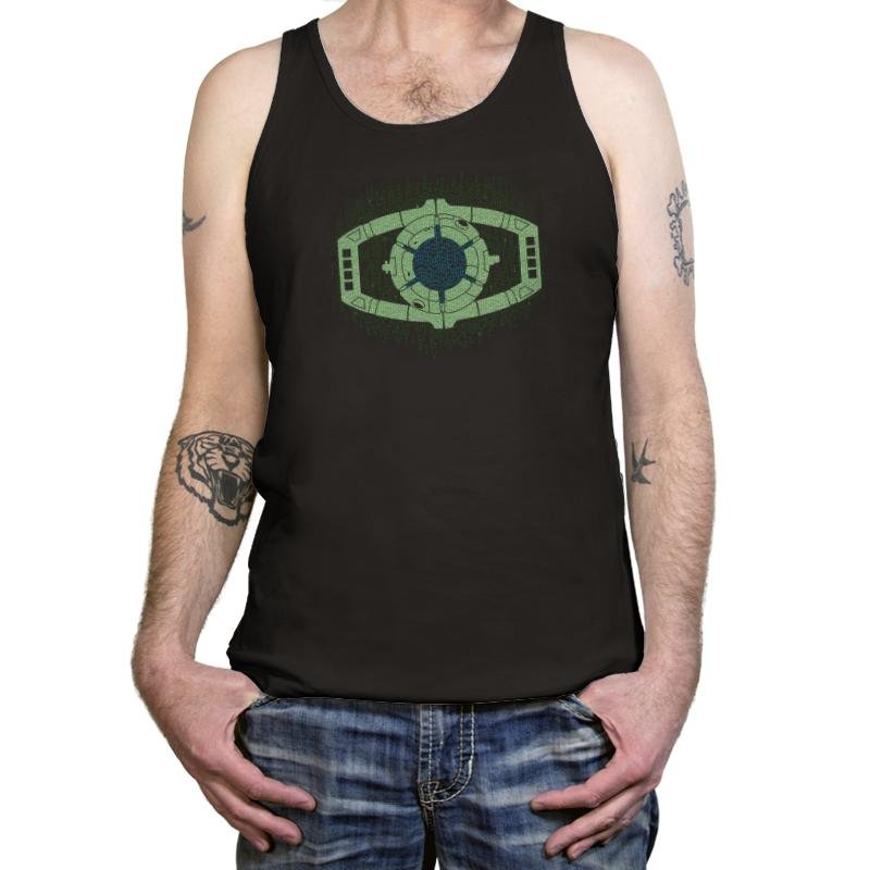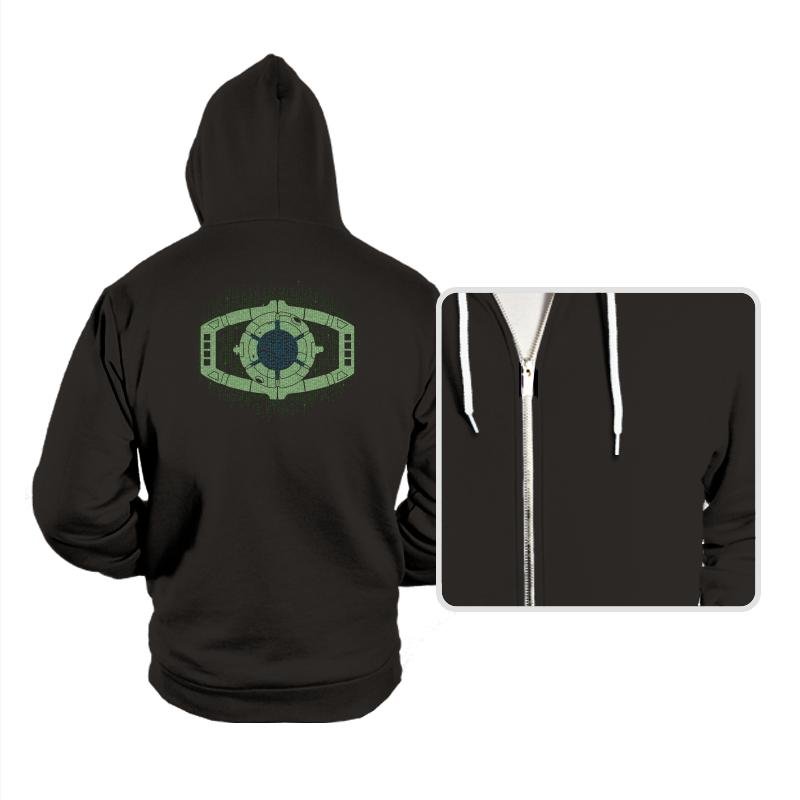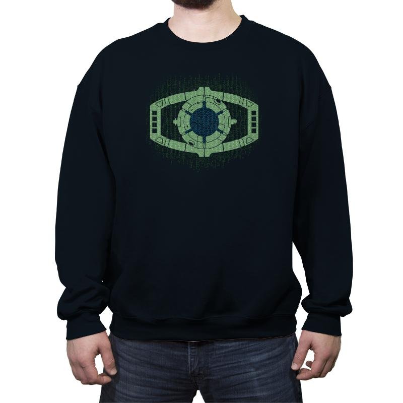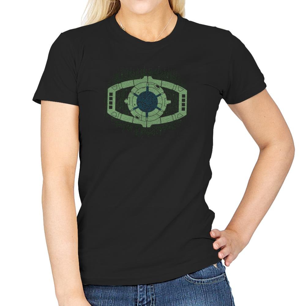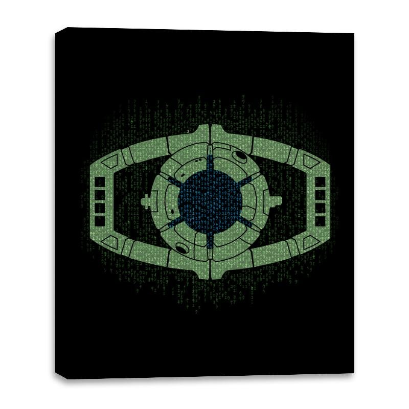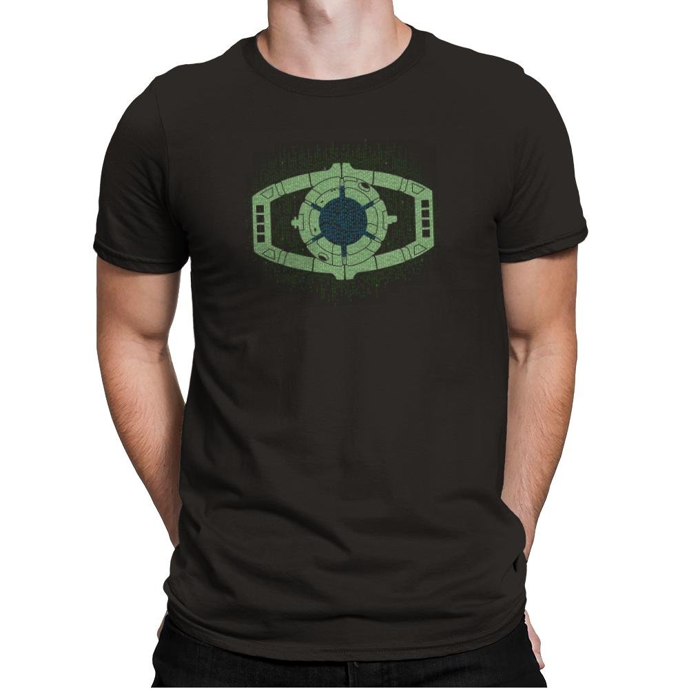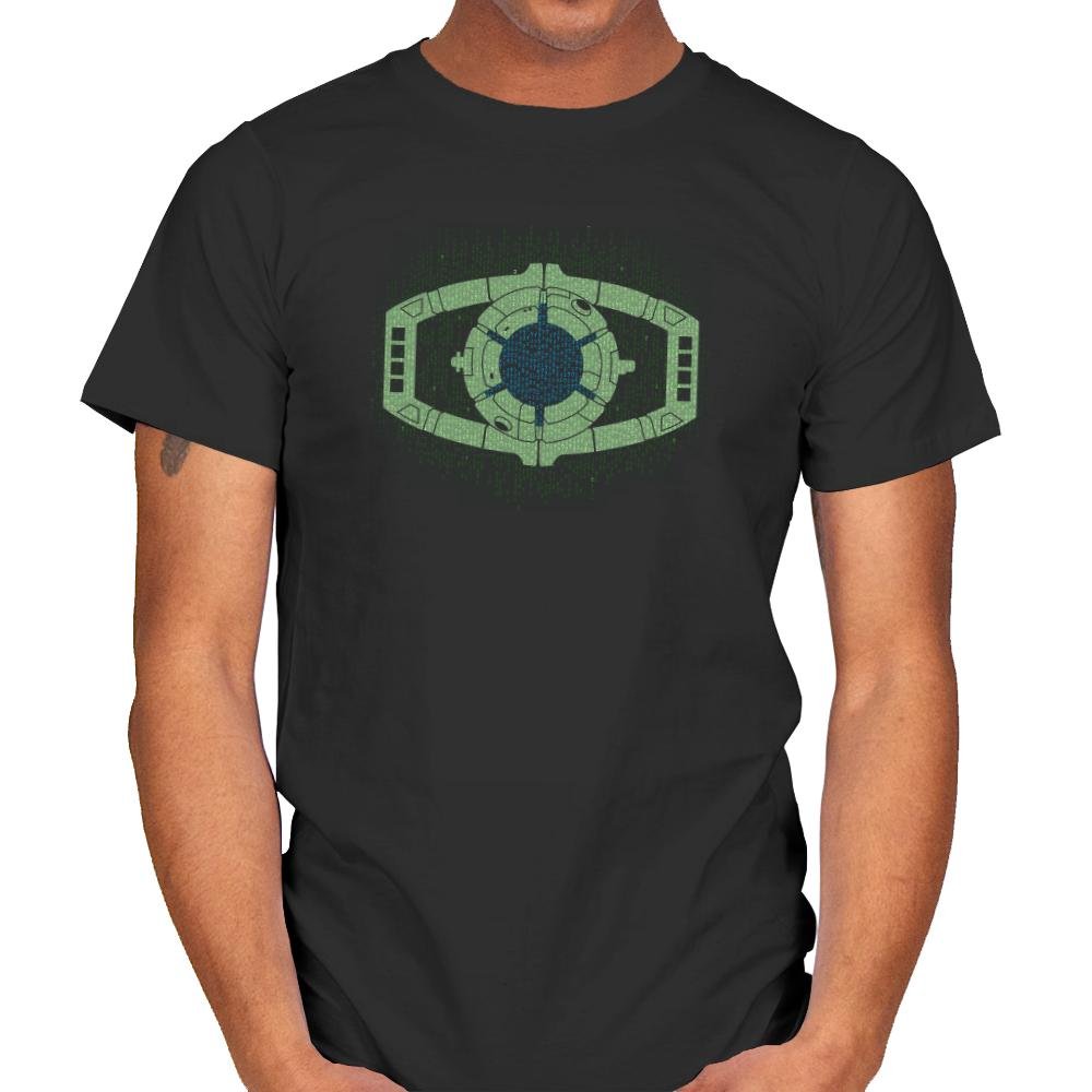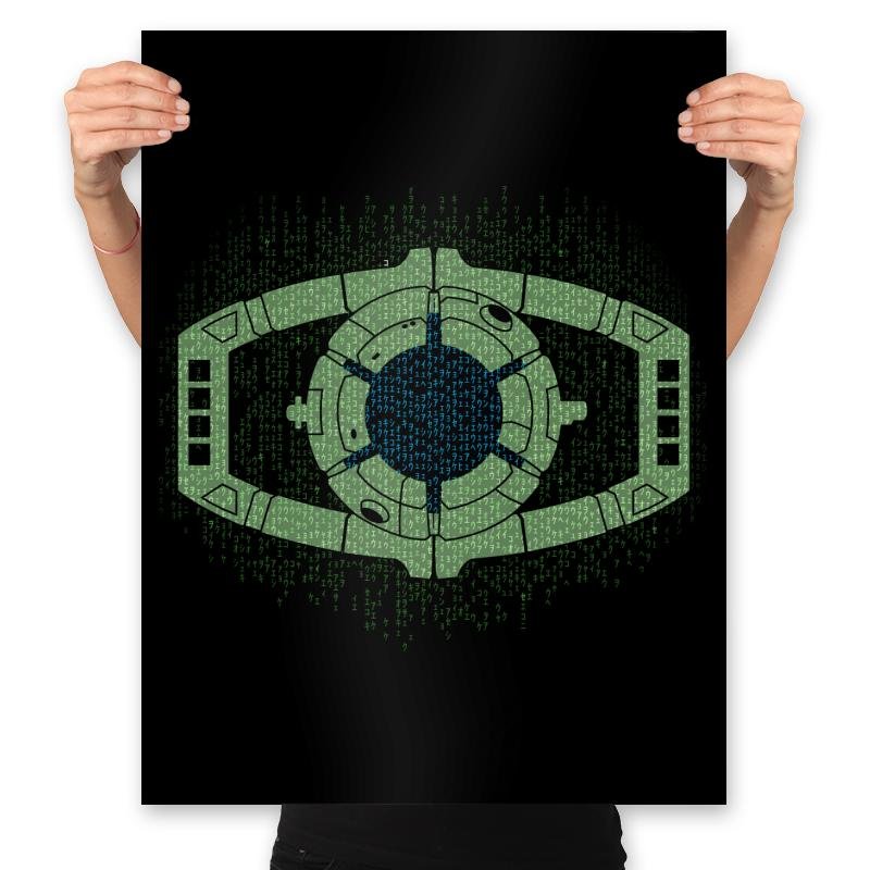 This design centers on a familiar alien device, reworked as a glowing mechanical eye floating inside a curtain of falling code. The symmetry, circuitry, and green-on-black palette collapse two sci-fi languages into a single symbol that feels instantly readable. It looks like surveillance, control, and transformation all at once, rendered with quiet precision. If you know both worlds, the overlap is obvious.