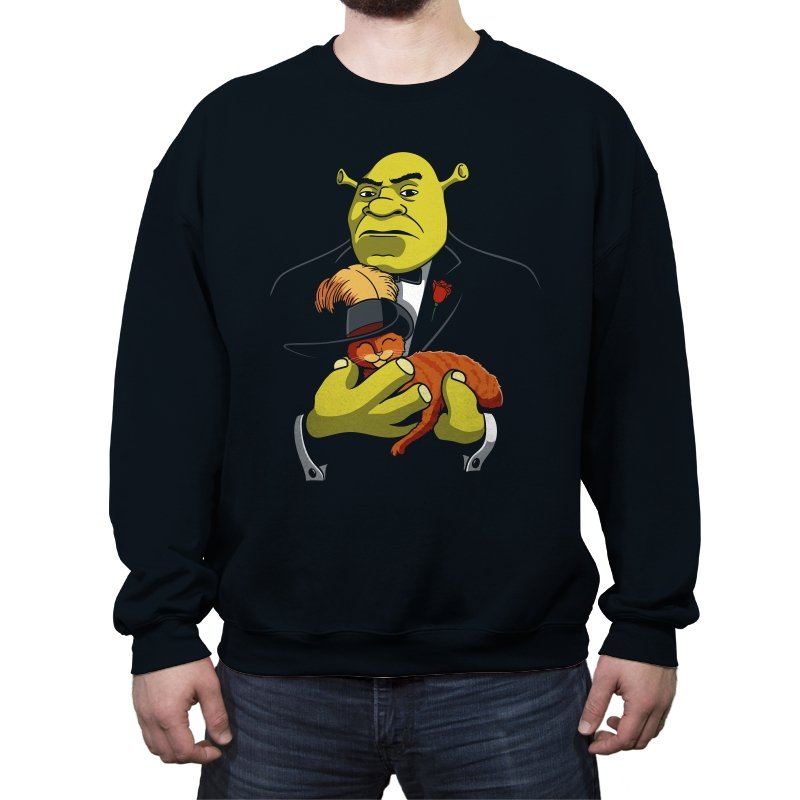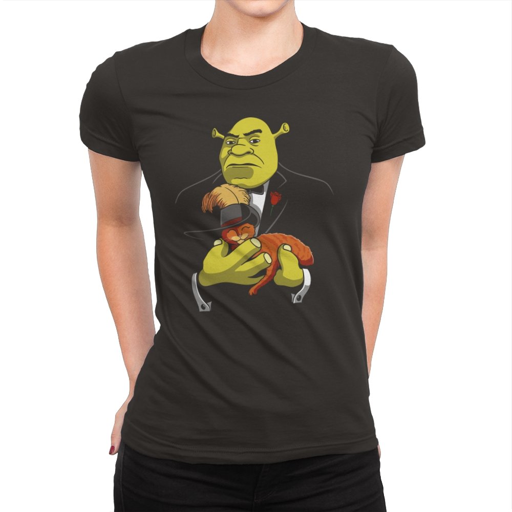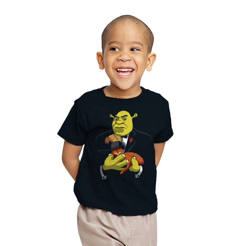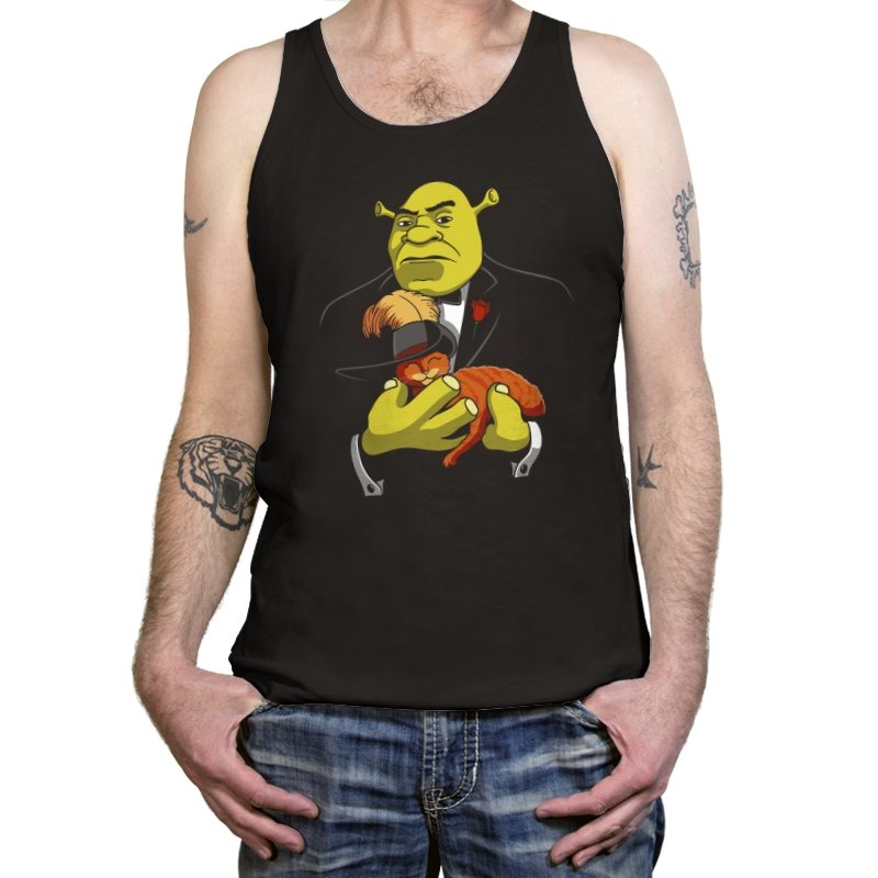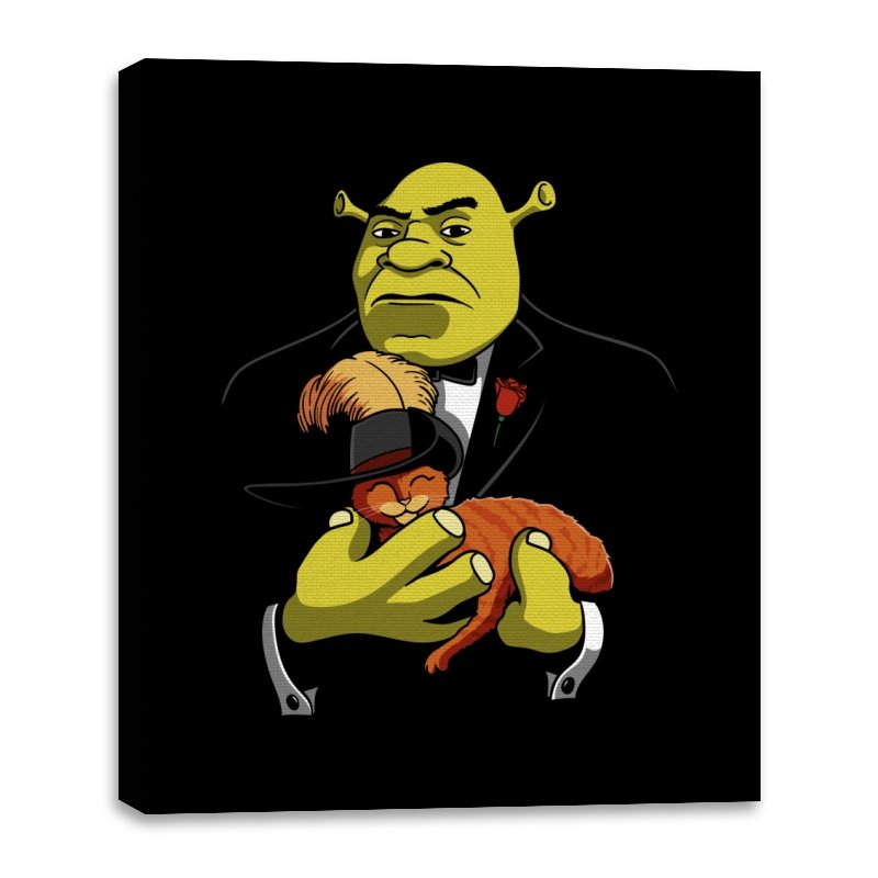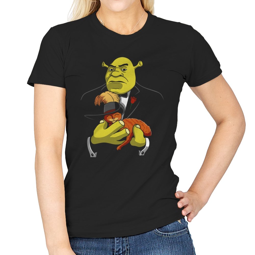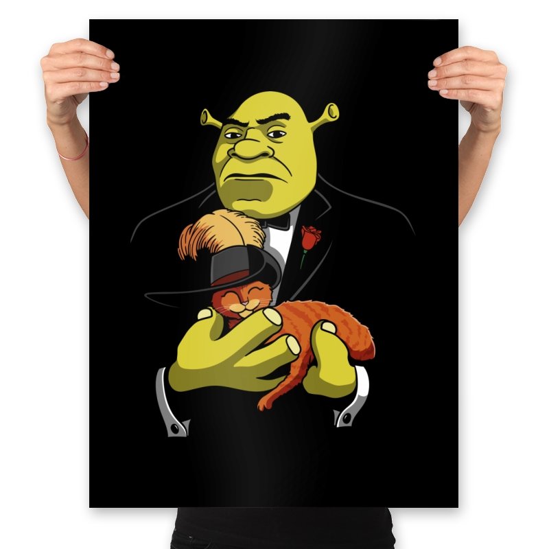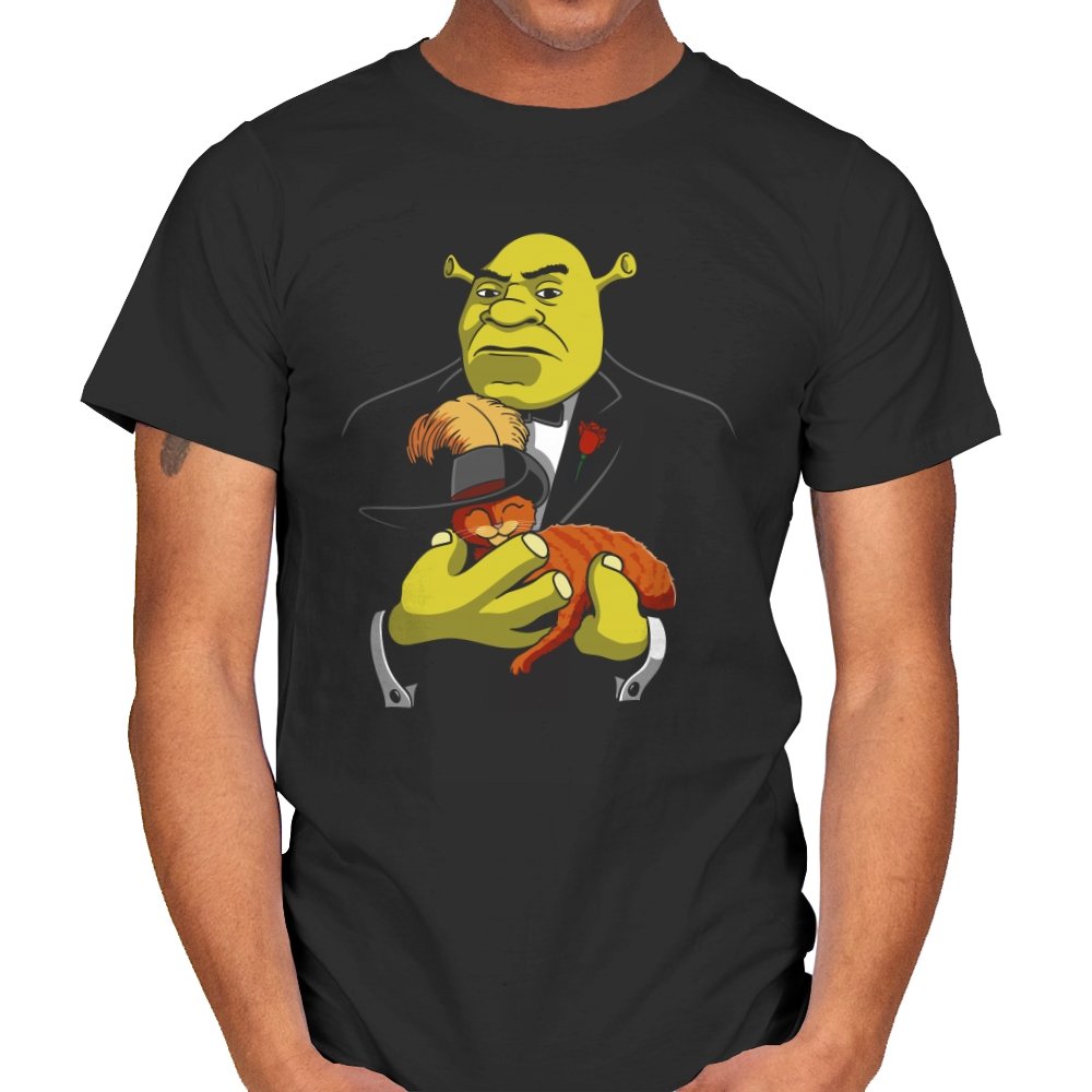 This design blends a classic mob boss composition with a swamp green patriarch, dressed in a tux and holding court with unsettling calm. The pose, lighting, and framing borrow from iconic crime cinema, but the fantasy twist reframes the power fantasy through irony instead of menace. The contrast between refined authority and ogre bluntness is the entire joke. It lands hardest for people who recognize the visual language instantly.