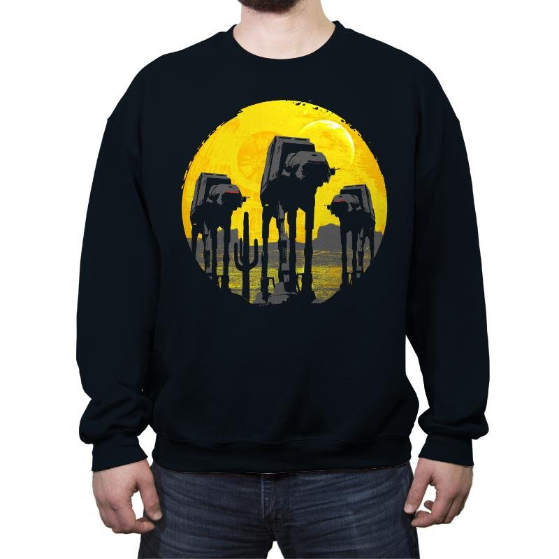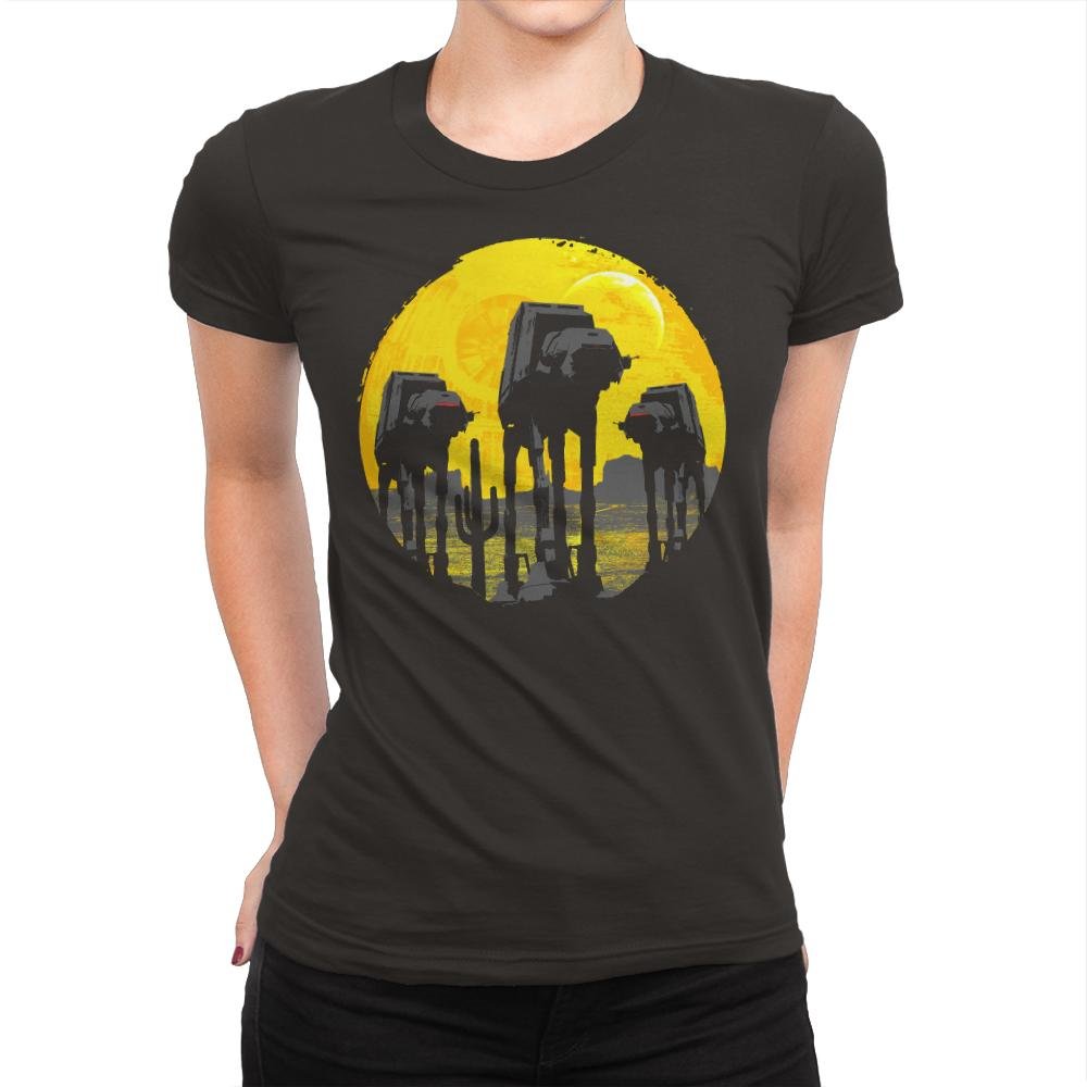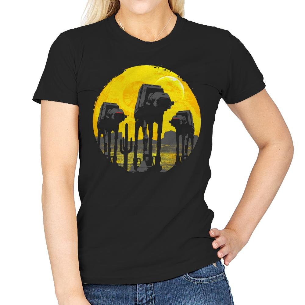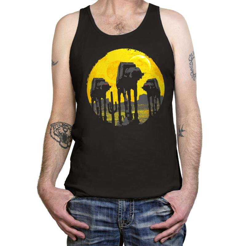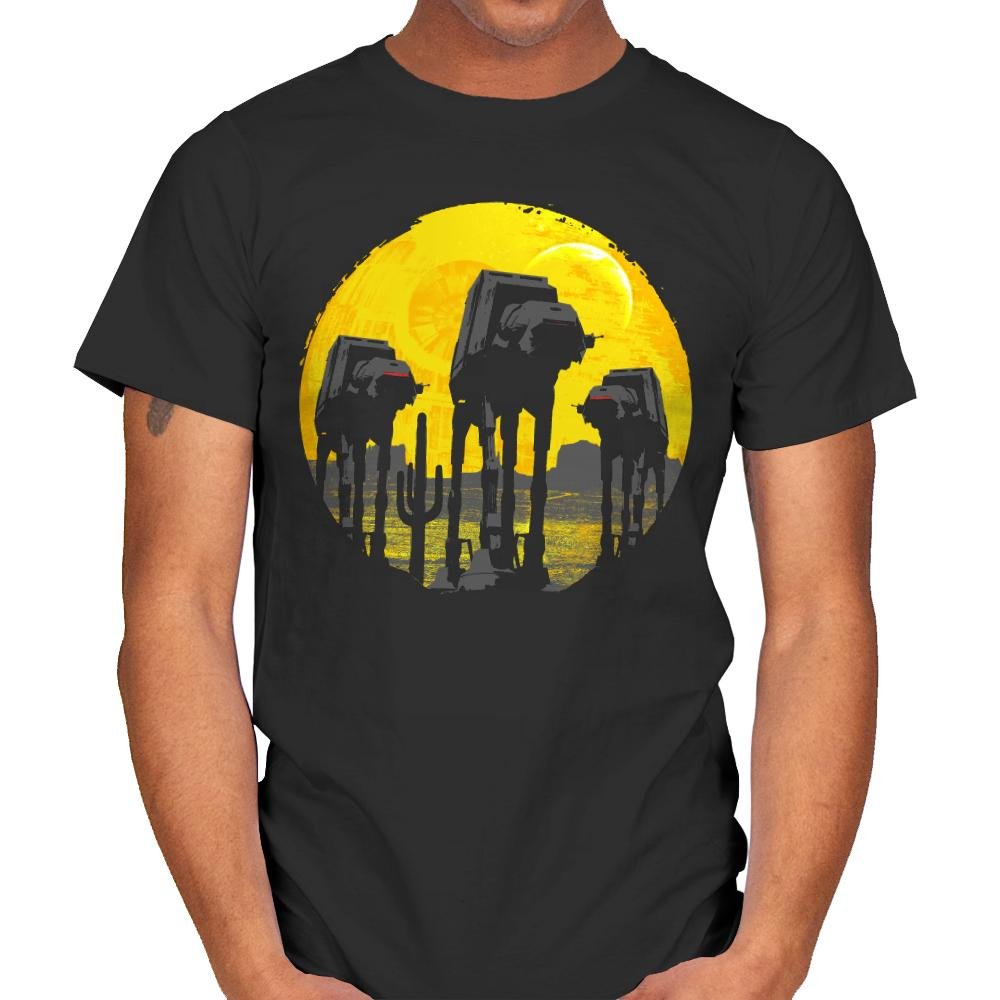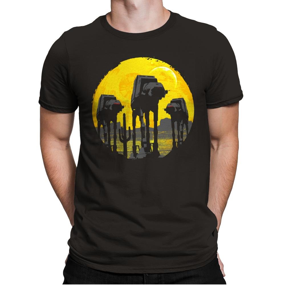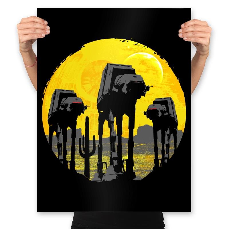 This design silhouettes the Empire’s four-legged assault vehicles against a massive yellow moon, borrowing the composition style from classic Western and horror movie posters. The walkers advance like gunslingers at high noon, their reflections rippling in water below while the golden backdrop creates maximum dramatic tension. It transforms military hardware into something that belongs on a vintage cinema one-sheet, complete with that foreboding sense that nothing good is about to happen.
