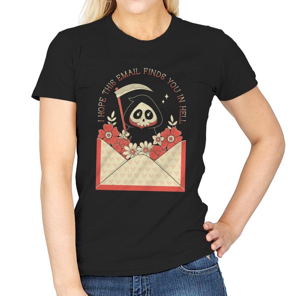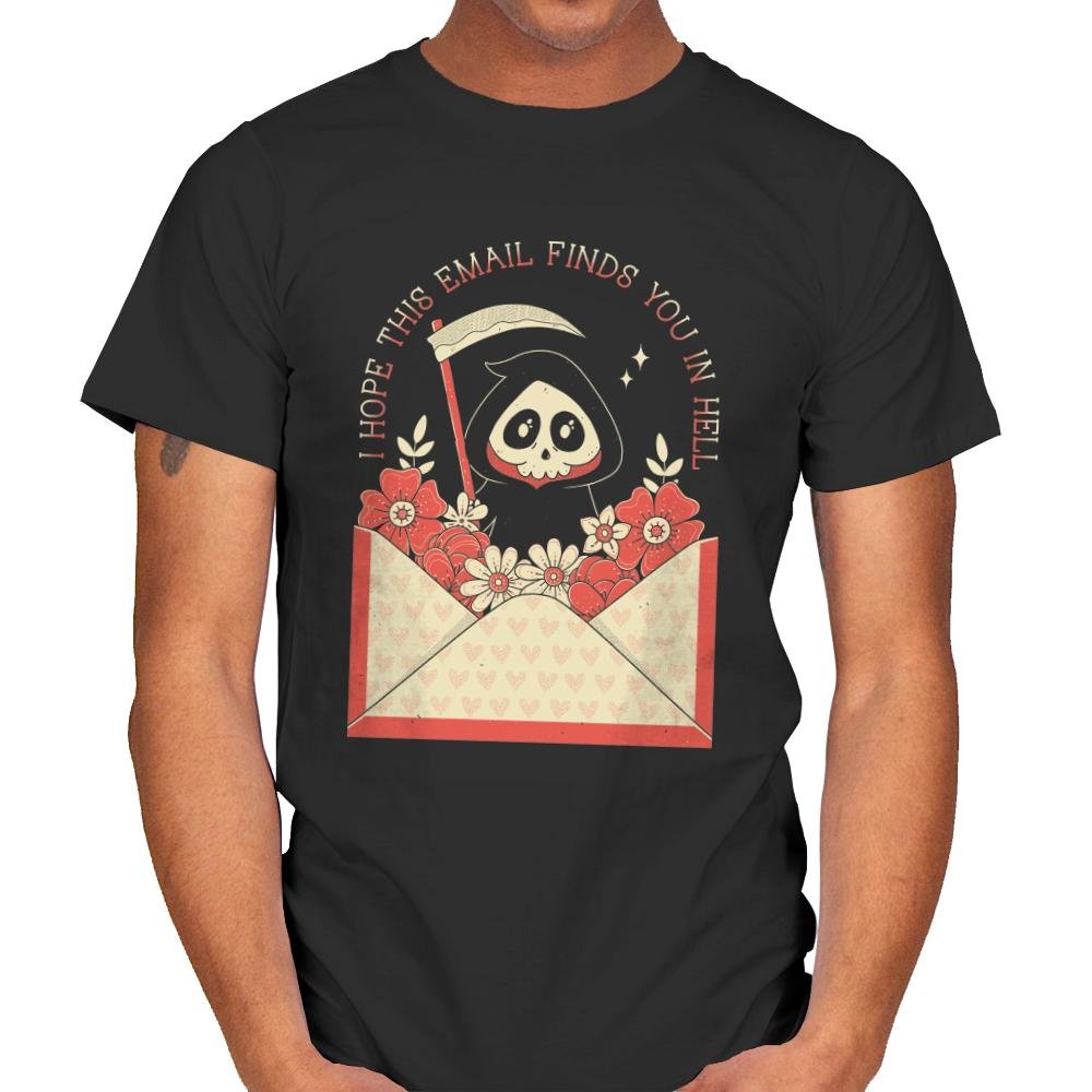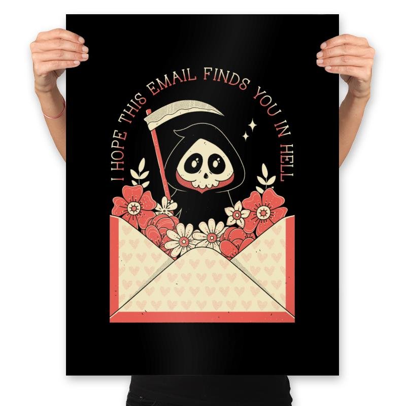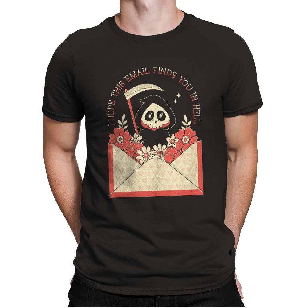 This design turns a familiar workday phrase into something gently ominous. A hooded little reaper peeks out of an open envelope overflowing with flowers, scythe tucked casually at the side, as if delivering bad news with good stationery. Soft pinks and warm reds keep the scene charming while the message lands with dry inevitability. Fans who get it recognize the feeling before opening their inbox.