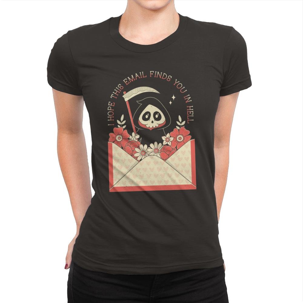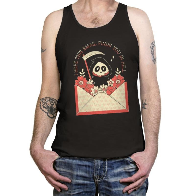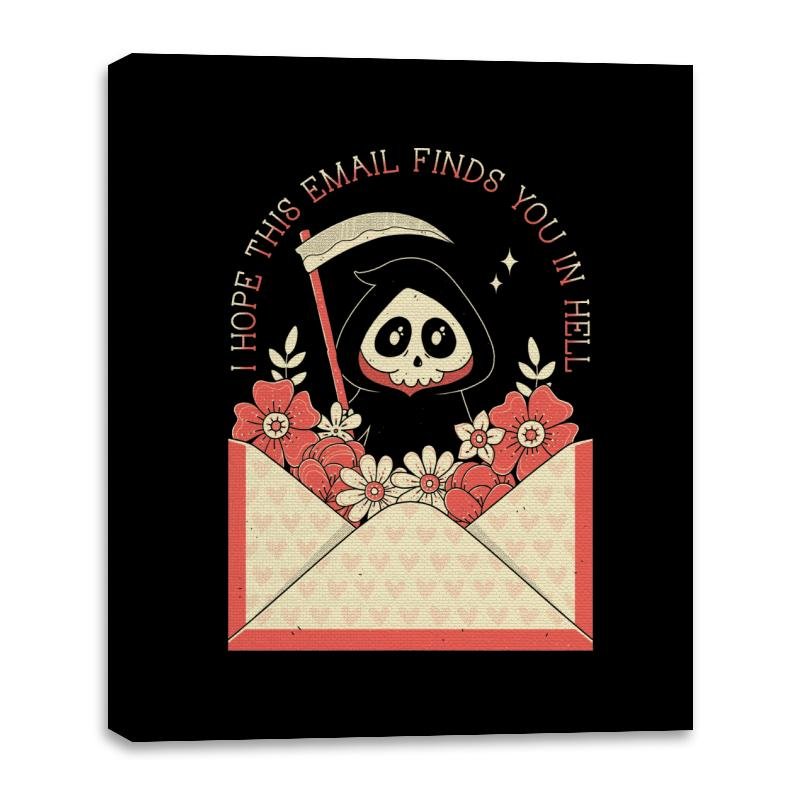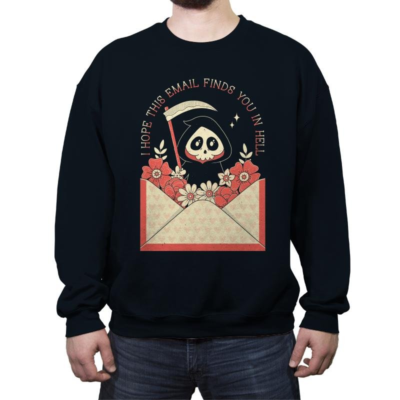 This design turns a familiar workday phrase into something gently ominous. A hooded little reaper peeks out of an open envelope overflowing with flowers, scythe tucked casually at the side, as if delivering bad news with good stationery. Soft pinks and warm reds keep the scene charming while the message lands with dry inevitability. Fans who get it recognize the feeling before opening their inbox.