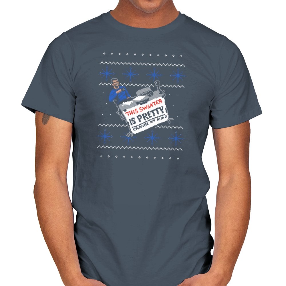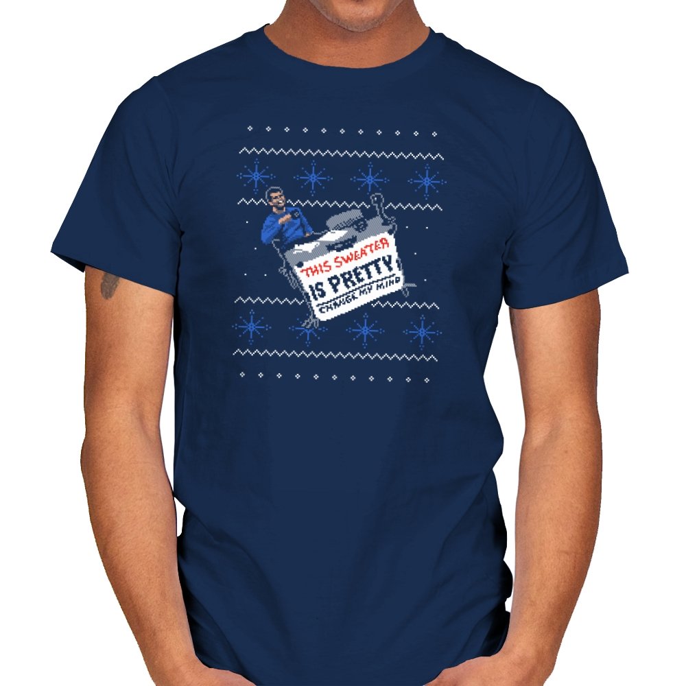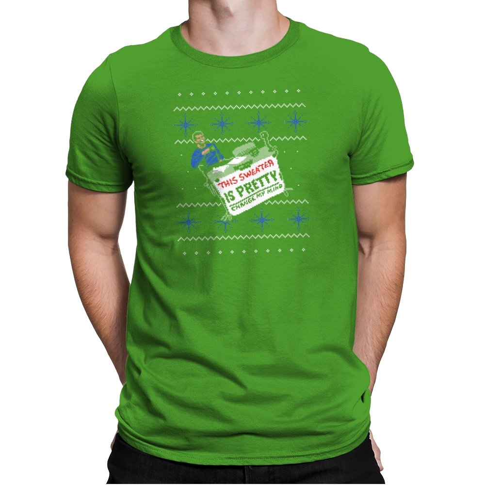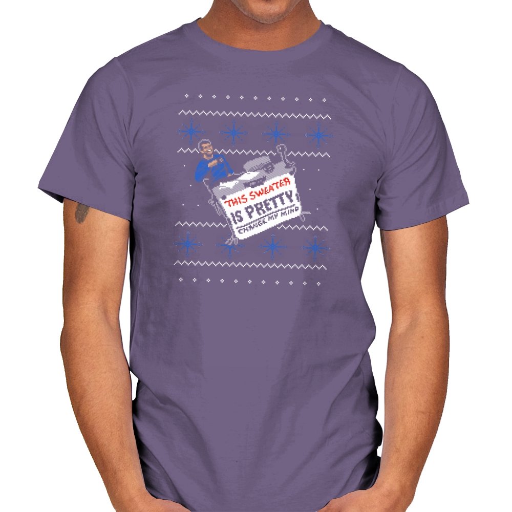 This ugly holiday design channels a viral internet meme into a perfect sweater showdown. A character, dressed in blue, strikes an over-the-top pose, tossing a festive holiday sweater with a phrase that’s bold and unrelenting. The juxtaposition of the kitschy sweater and the serious “change my mind” attitude creates a humorous tension. This design is the perfect blend of meme culture and holiday absurdity, making it a stand-out piece for anyone who embraces ironic, internet-driven humor.