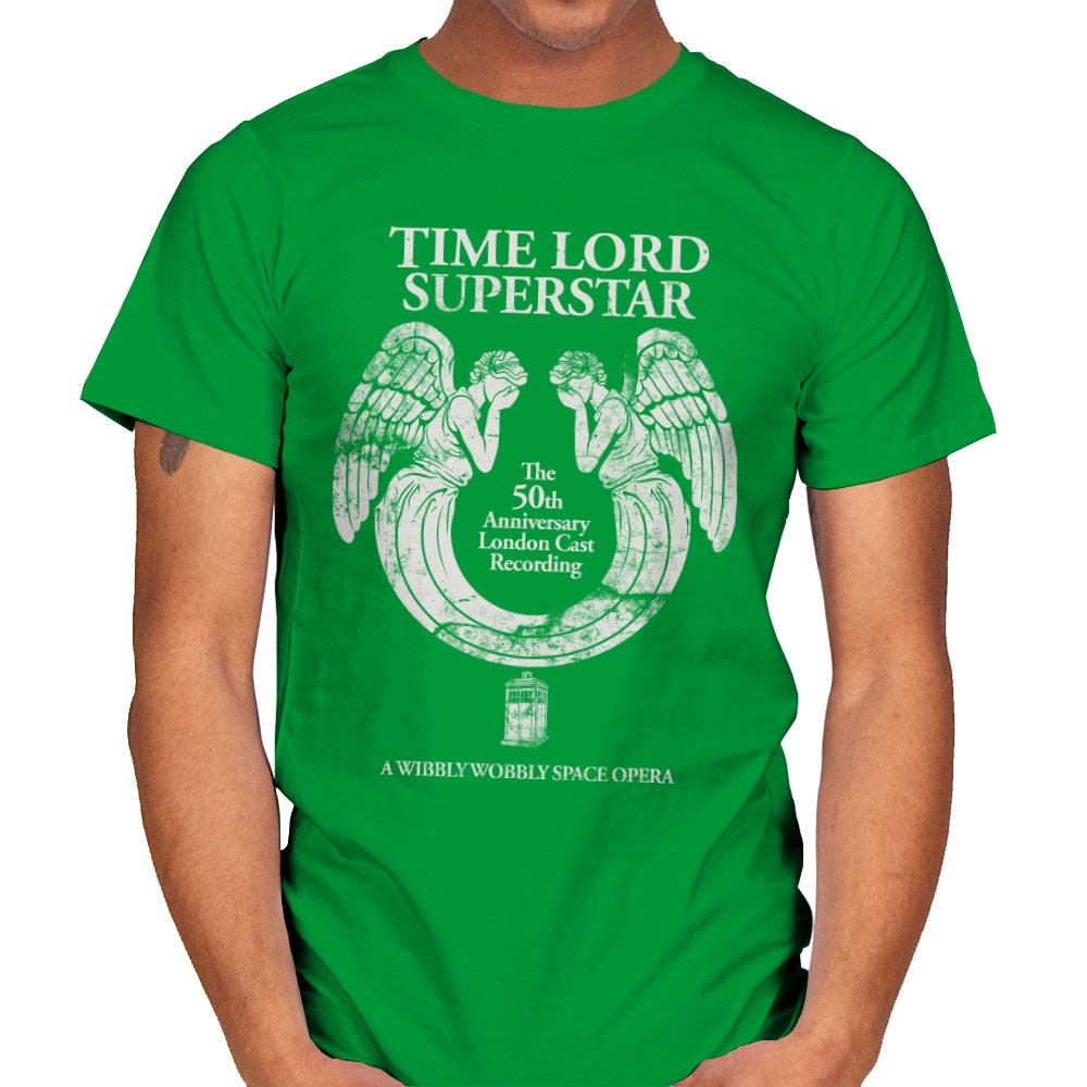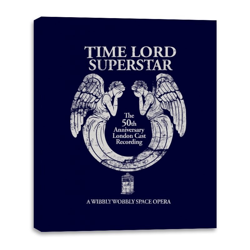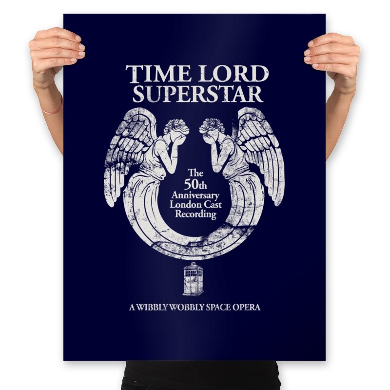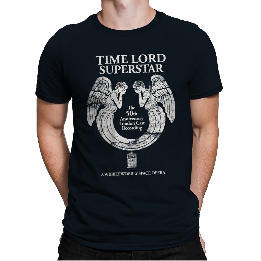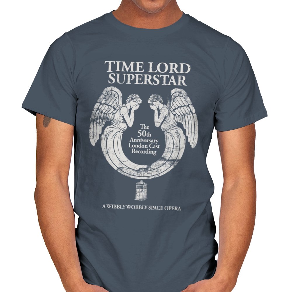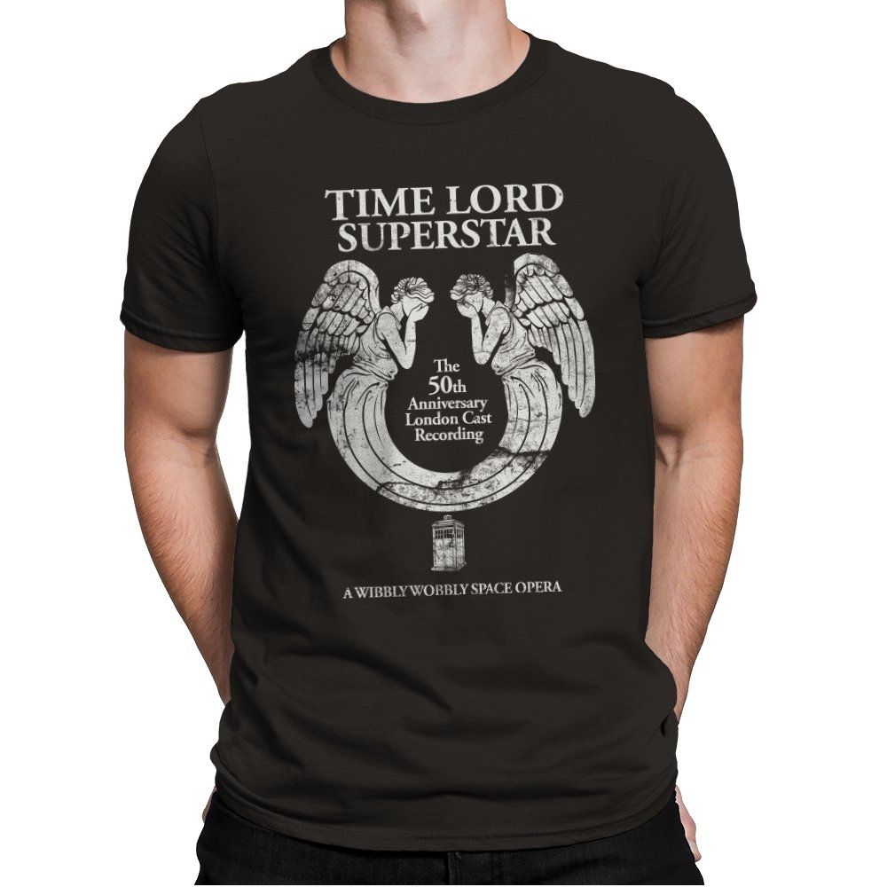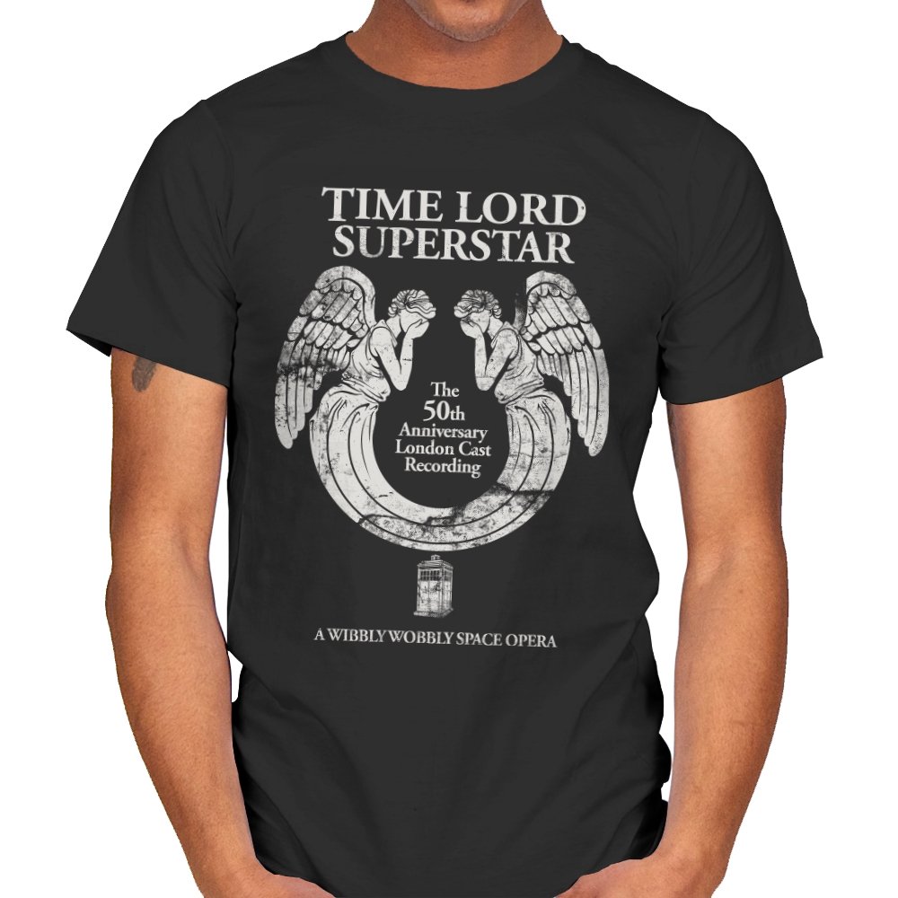 This design treats time travel like a classic rock opera sleeve, complete with symmetrical figures, aged line work, and ceremonial balance. The angels frame the center like guardians of a long running myth, while the typography leans into anniversary recording energy rather than modern polish. It feels archival, as if pulled from a dusty crate between prog records and sci-fi soundtracks. Fans who get it will recognize the joke in taking something cosmic and giving it vinyl era gravitas.