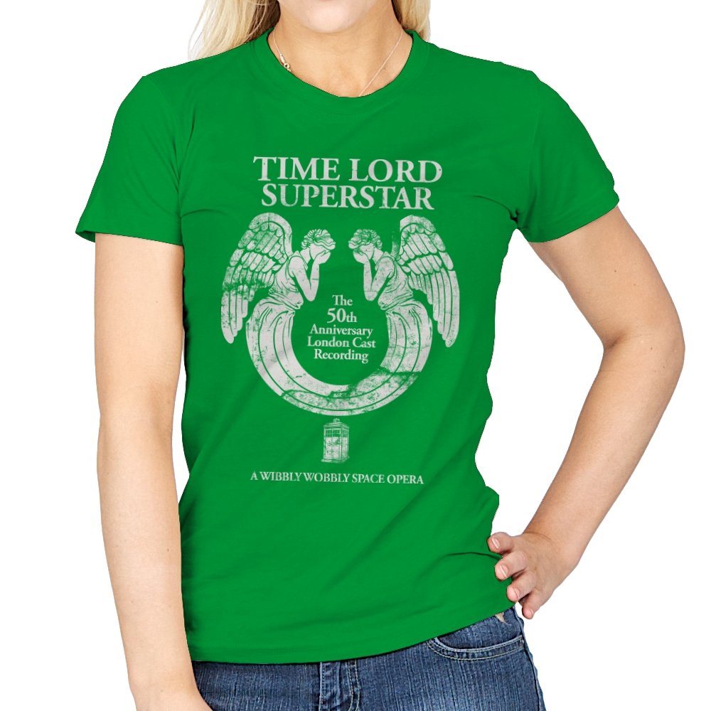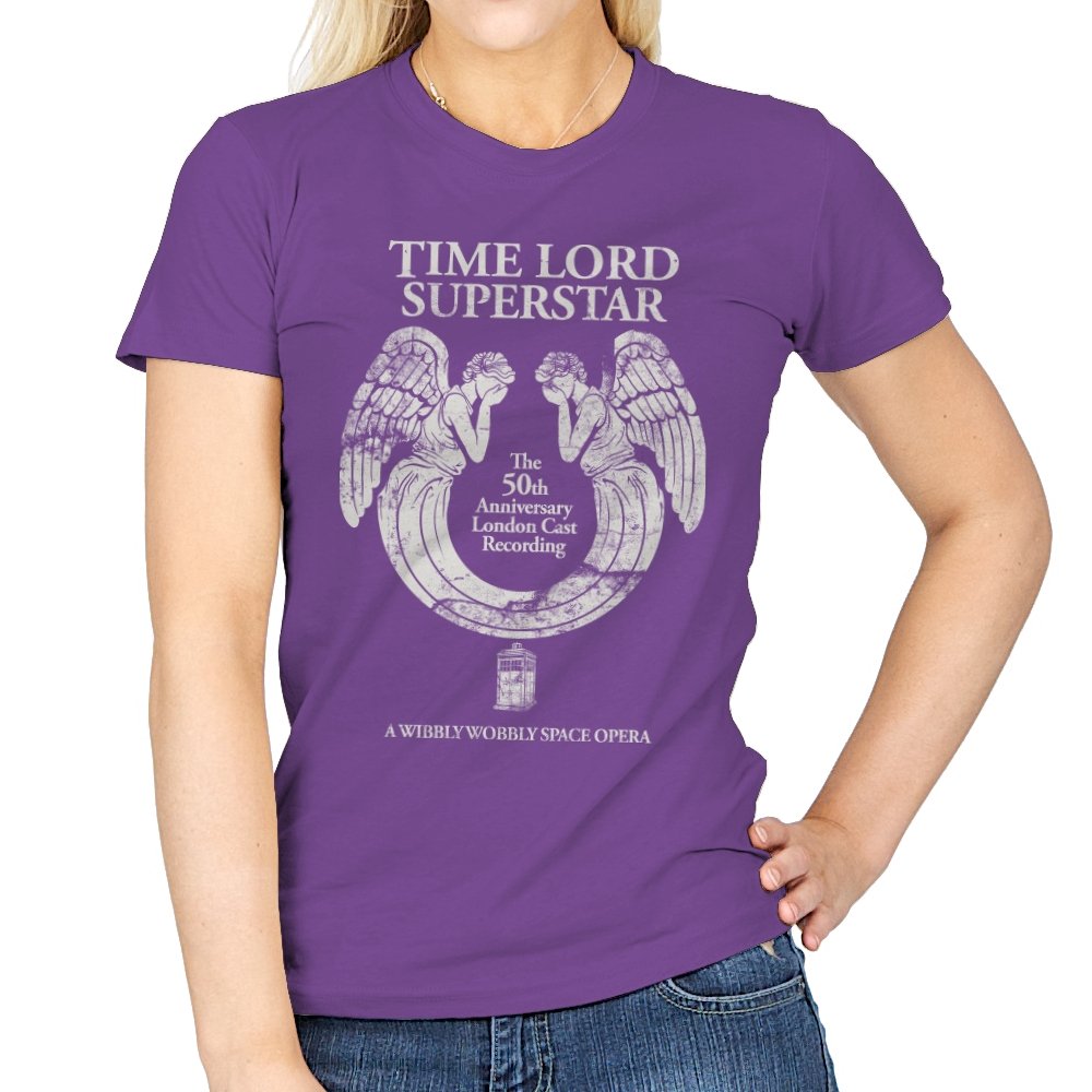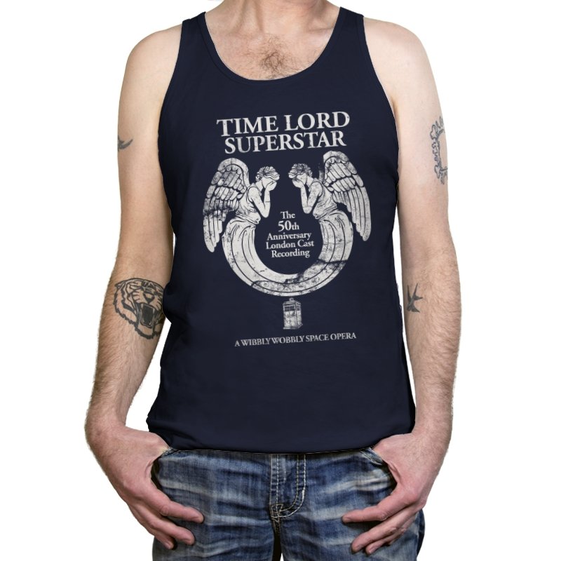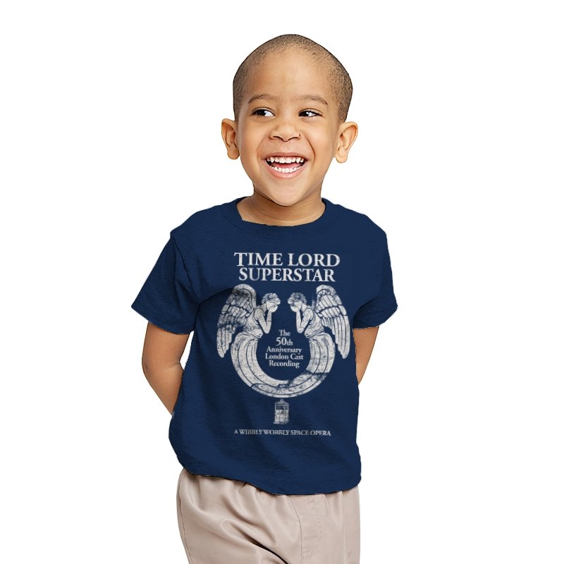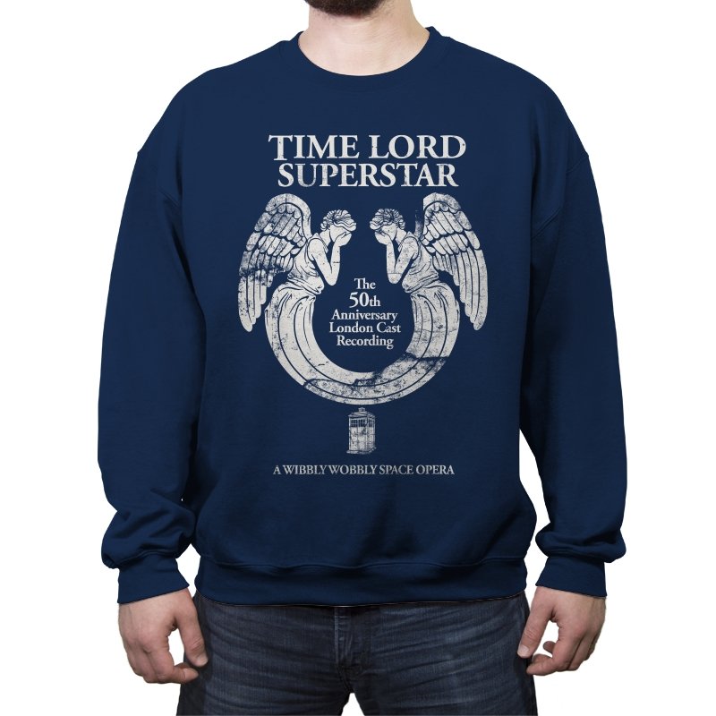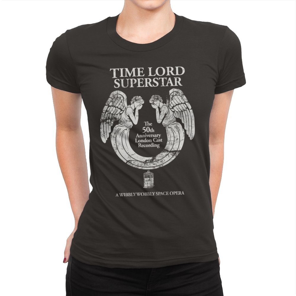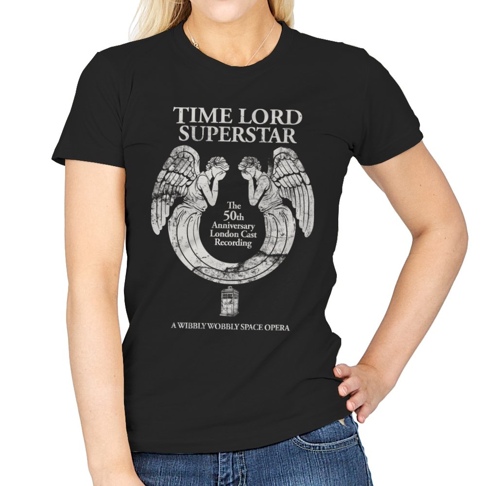 This design treats time travel like a classic rock opera sleeve, complete with symmetrical figures, aged line work, and ceremonial balance. The angels frame the center like guardians of a long running myth, while the typography leans into anniversary recording energy rather than modern polish. It feels archival, as if pulled from a dusty crate between prog records and sci-fi soundtracks. Fans who get it will recognize the joke in taking something cosmic and giving it vinyl era gravitas.