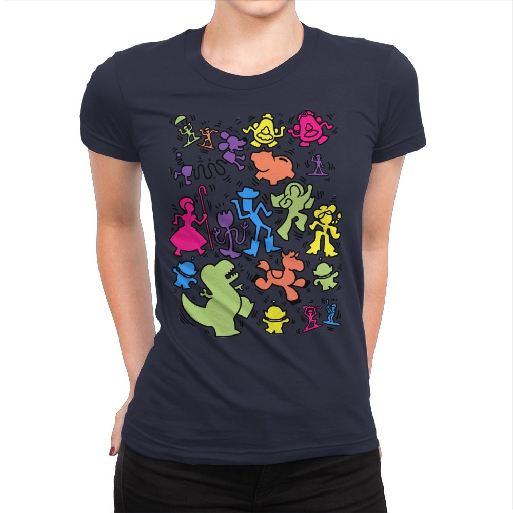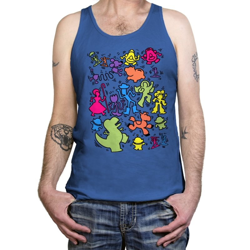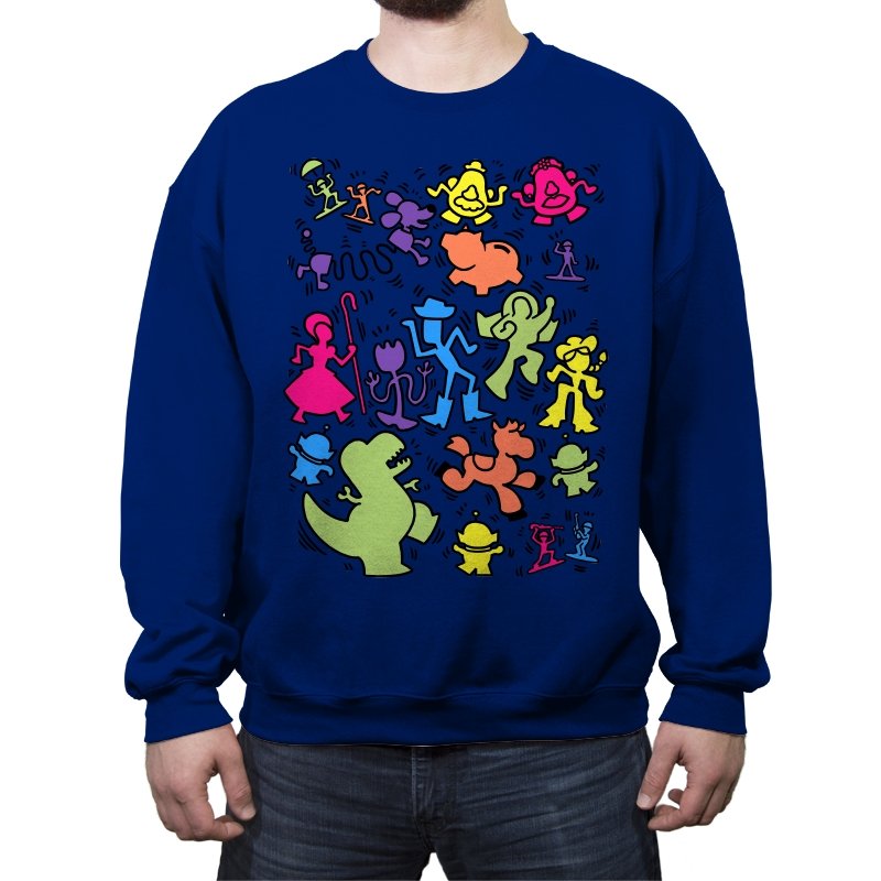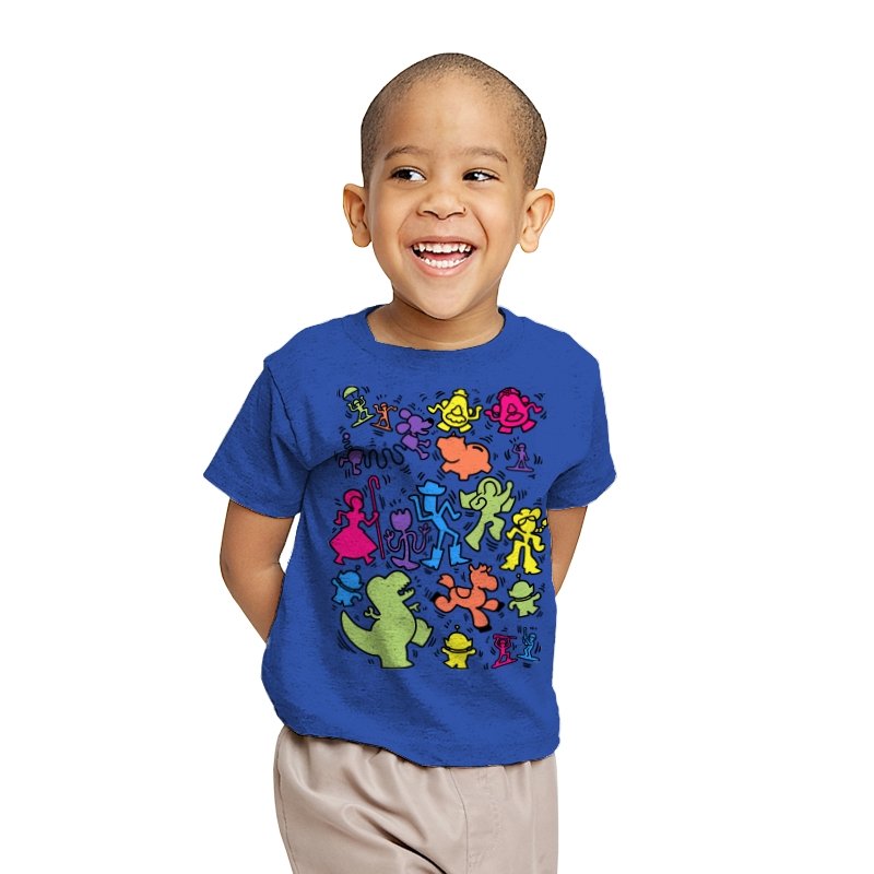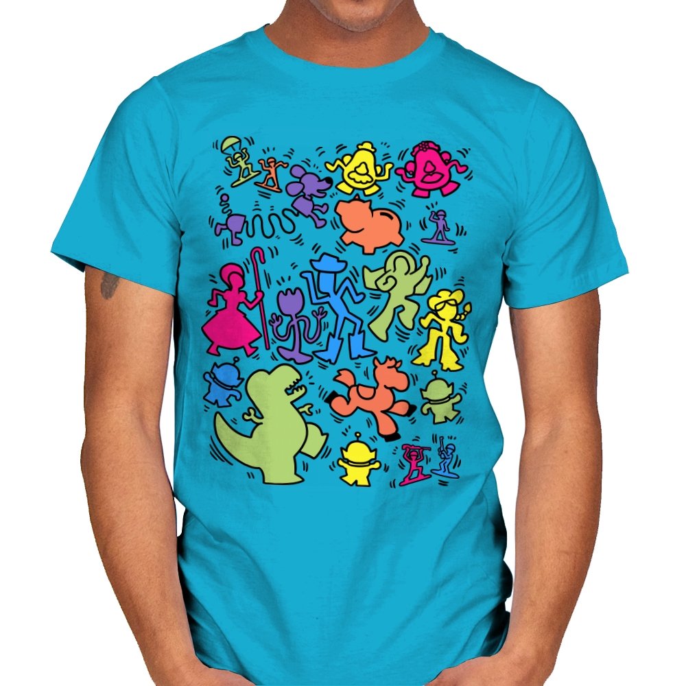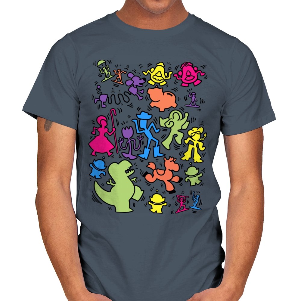 This design feels like a page torn from a kid’s imagination and redrawn with intent. Loose, bouncy figures scatter across the space, each one mid motion, outlined in thick lines and filled with bright, unapologetic color. It borrows the energy of classic toy packaging and Saturday morning visuals, but filters it through an art school lens. The chaos is playful, not random, and every shape feels placed by someone who knows the language.