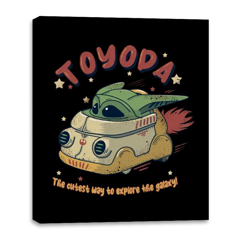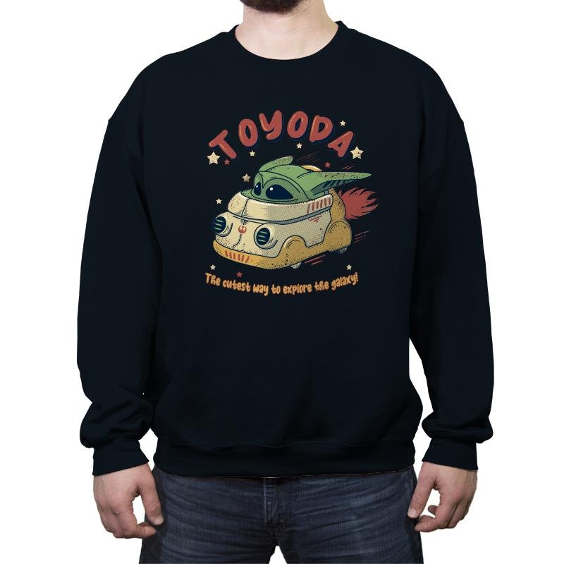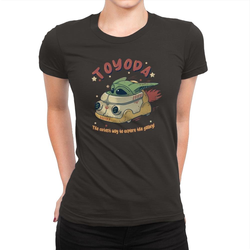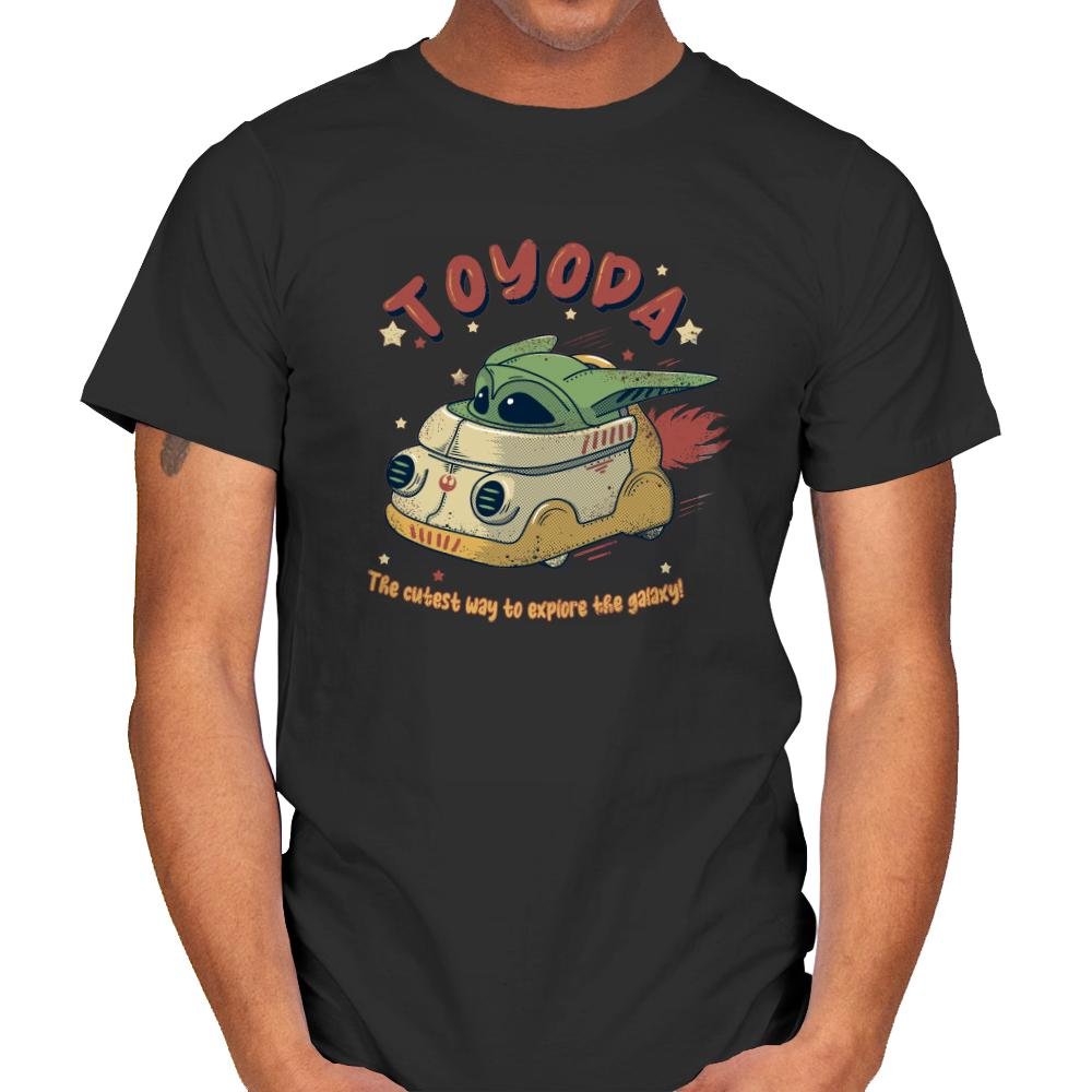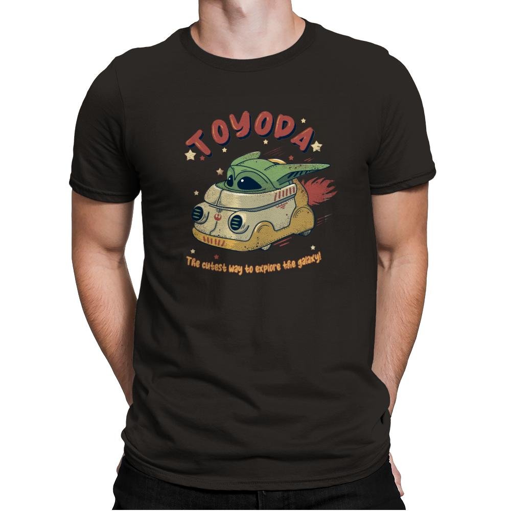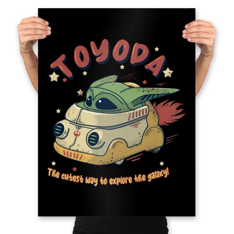A tiny green space kid zips across the stars in a toy sized hover van that looks suspiciously like a retro camper mixed with a sci fi escape pod. The hand drawn typography at the top twists a familiar car brand into something cuter, while the line below promises the most adorable method of intergalactic travel. Exhaust flames shoot from the back as the driver smiles with that calm confidence fans know well. It feels like a vintage toy box illustration from a galaxy far away.
