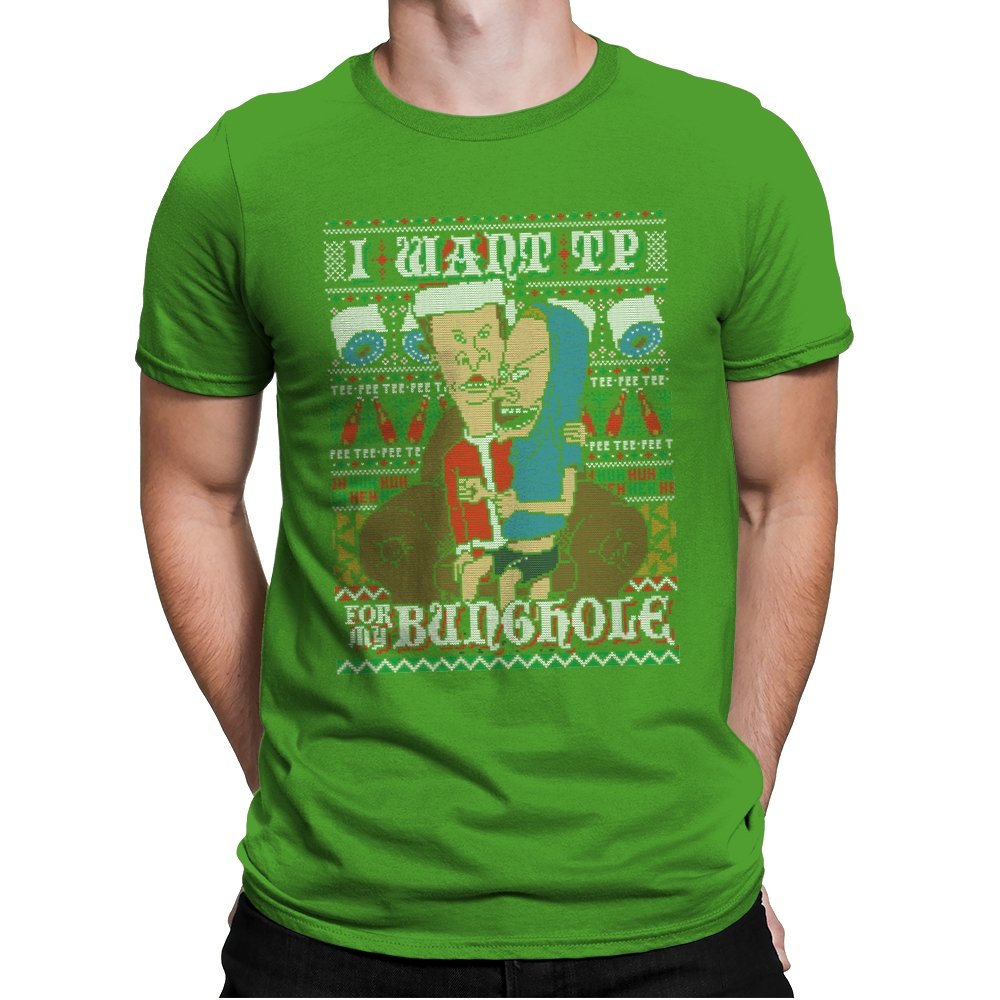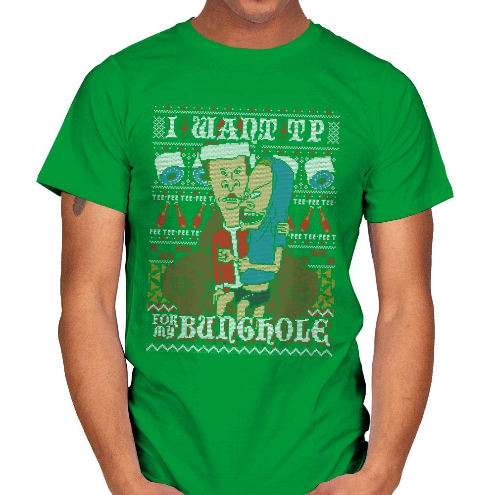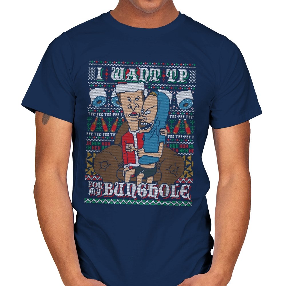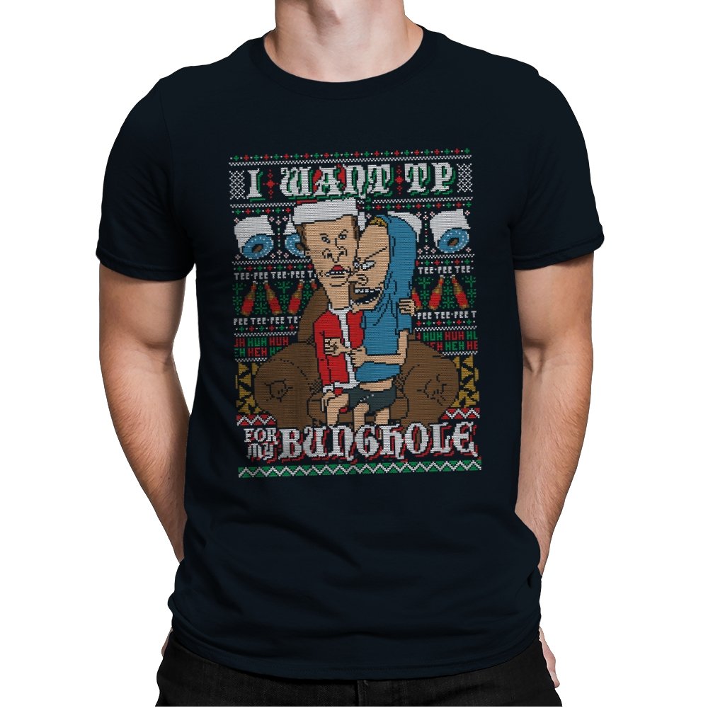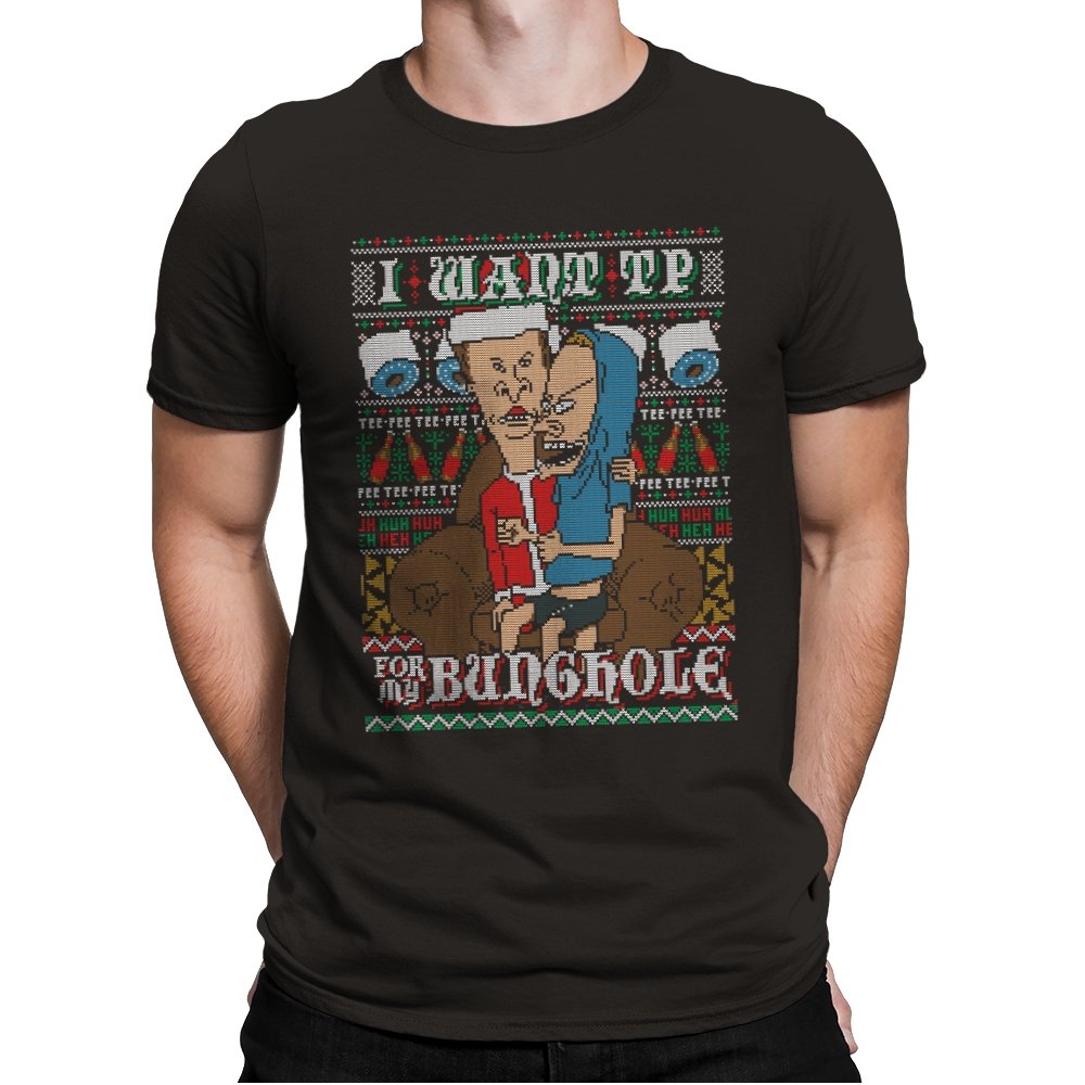 This design recreates a notorious cartoon gag in the style of an ugly holiday sweater. Two familiar slackers slump on a couch, eyes glazed, while one demands paper products with unhinged conviction. The background knits together rolls of TP, zigzag patterns, and repeating nonsense chants that fans will recognize instantly. The humor lands because it sticks to the original absurdity without softening the edge.