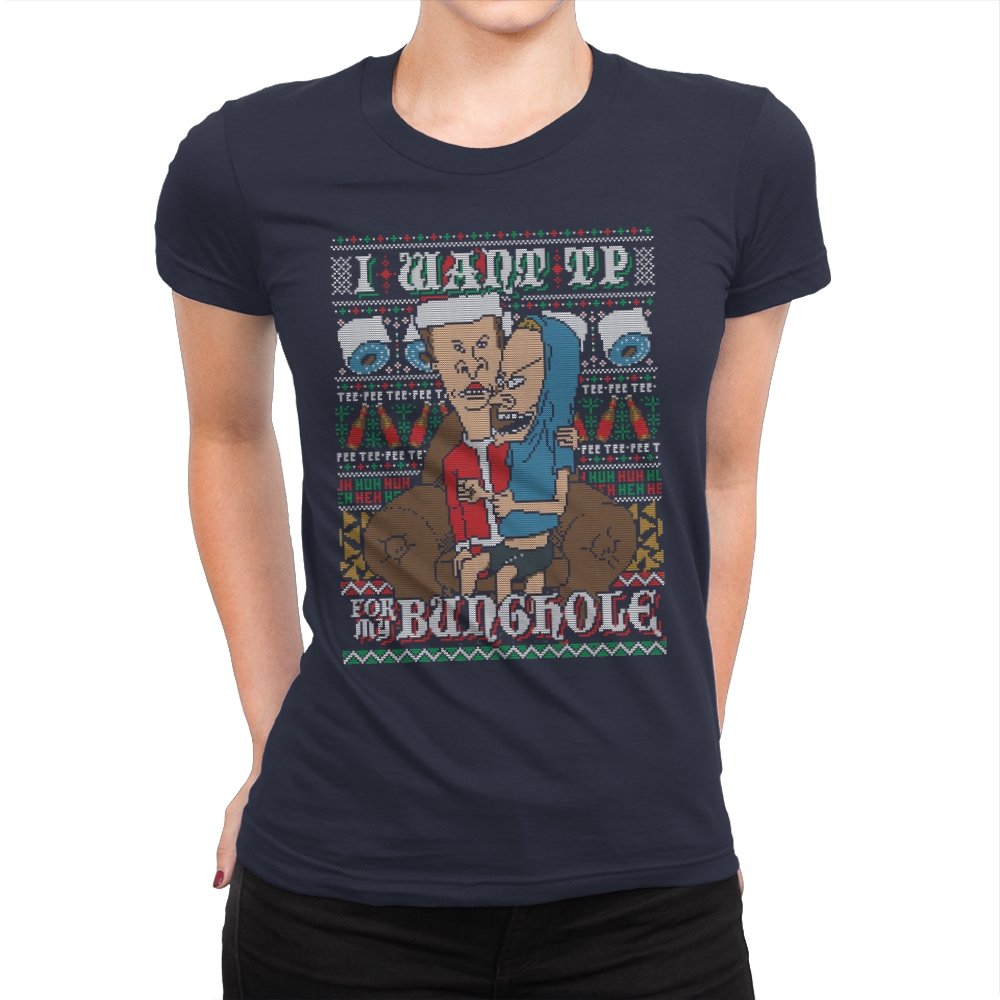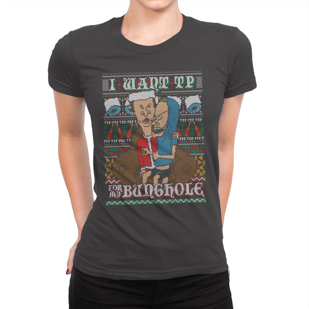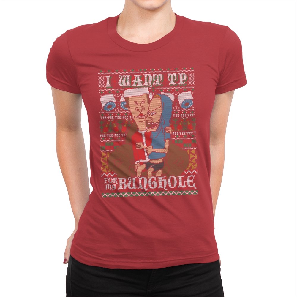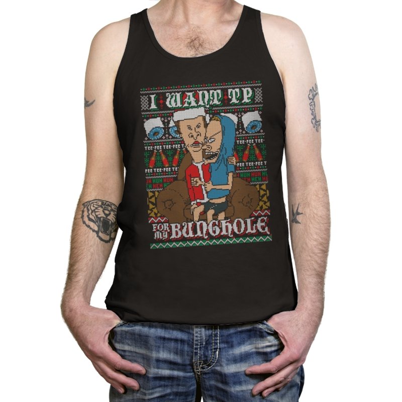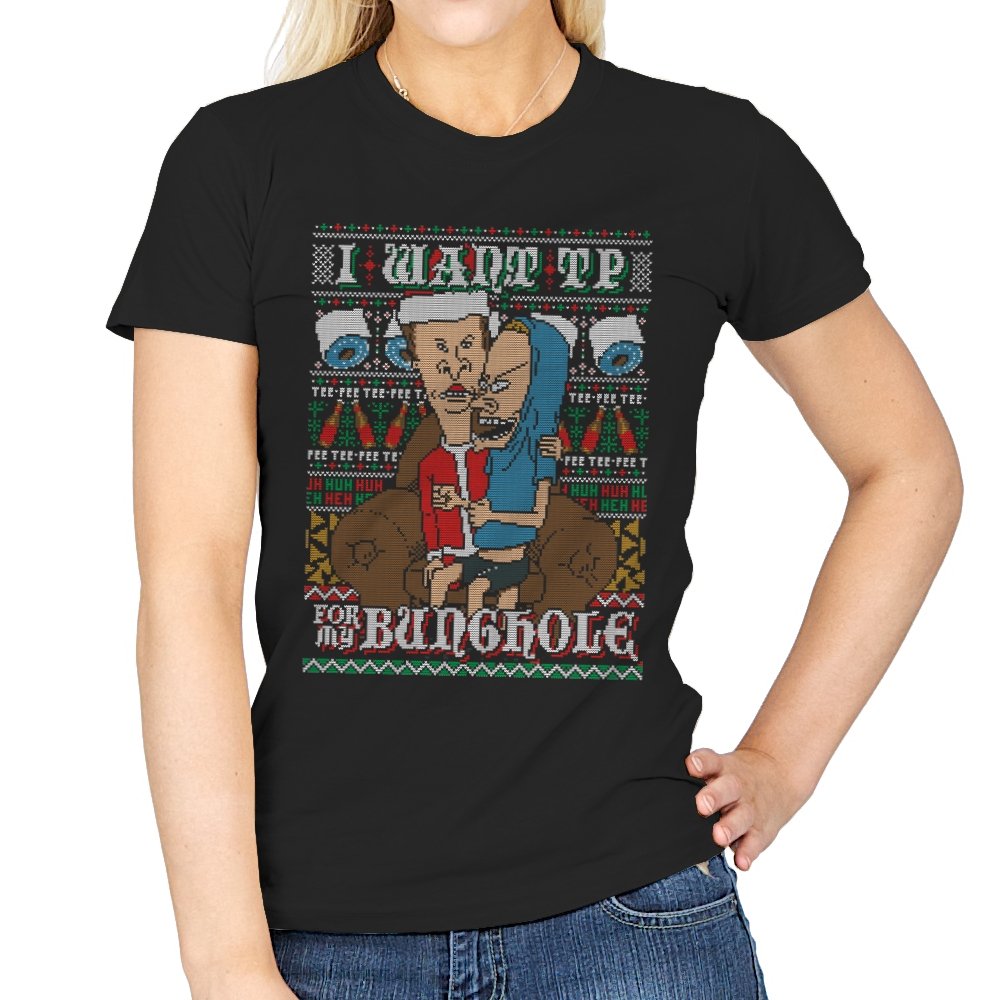 This design recreates a notorious cartoon gag in the style of an ugly holiday sweater. Two familiar slackers slump on a couch, eyes glazed, while one demands paper products with unhinged conviction. The background knits together rolls of TP, zigzag patterns, and repeating nonsense chants that fans will recognize instantly. The humor lands because it sticks to the original absurdity without softening the edge.