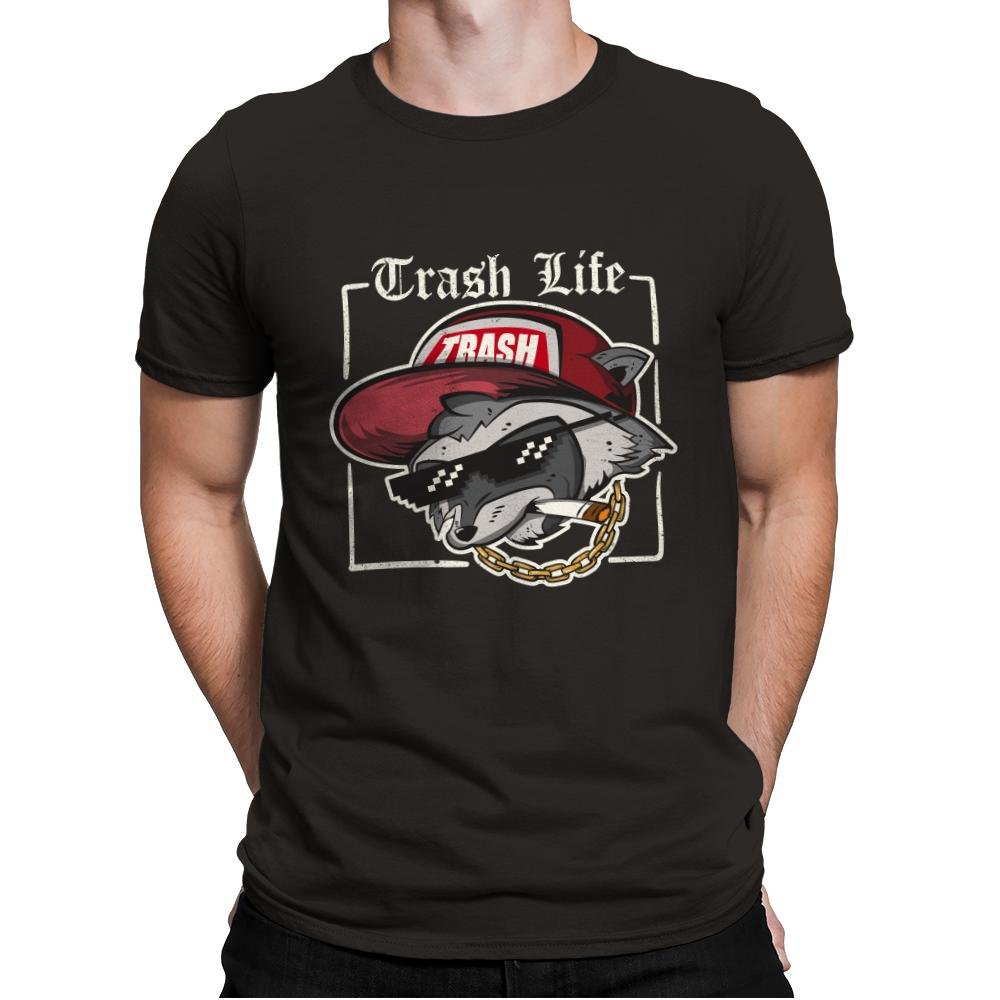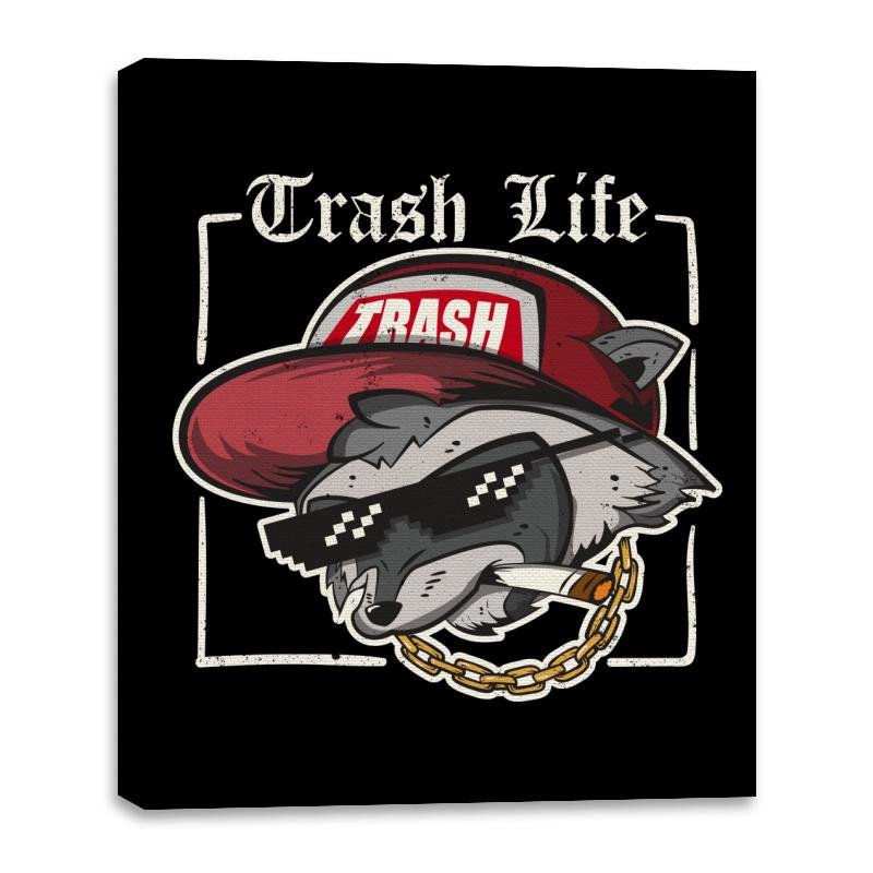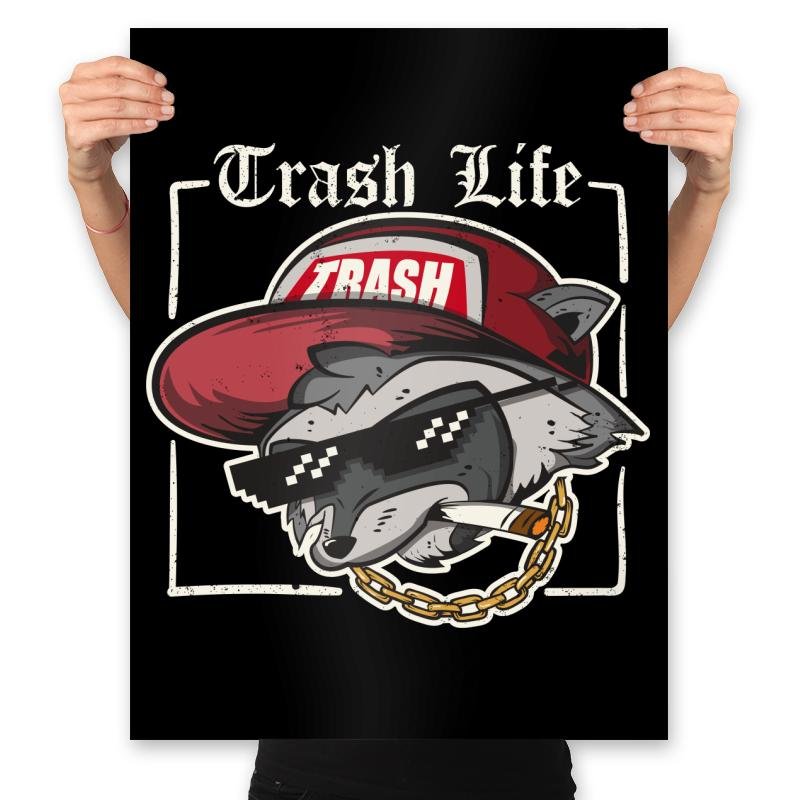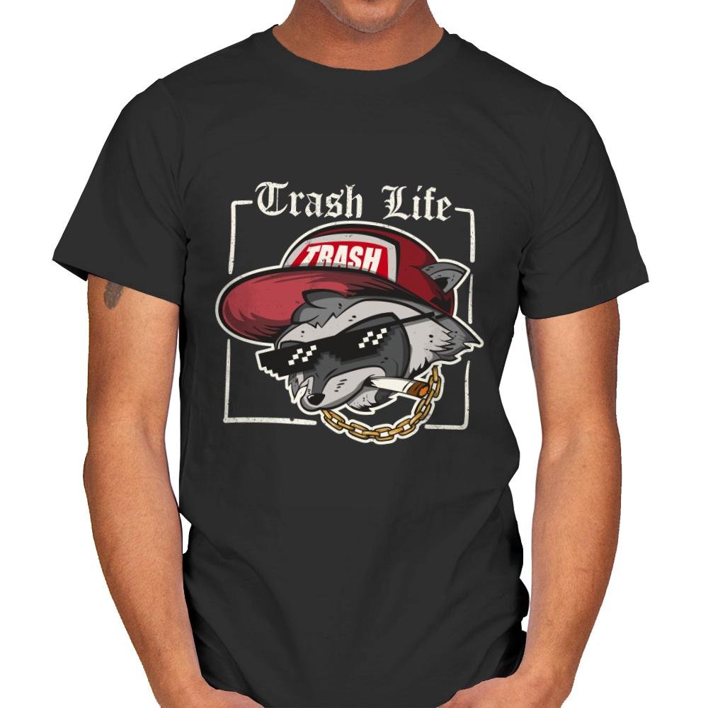A smug raccoon rocks a snapback labeled TRASH, pixel shades, a chunky chain, and a cigarette like it was born for alleyway stardom. The gothic lettering above frames the whole thing as a lifestyle brand for critters who raid bins at 3 a.m. The art leans into internet meme culture blended with biker patch design and suburban wildlife documentary. Fans will instantly read the joke in treating a dumpster bandit as a style icon.