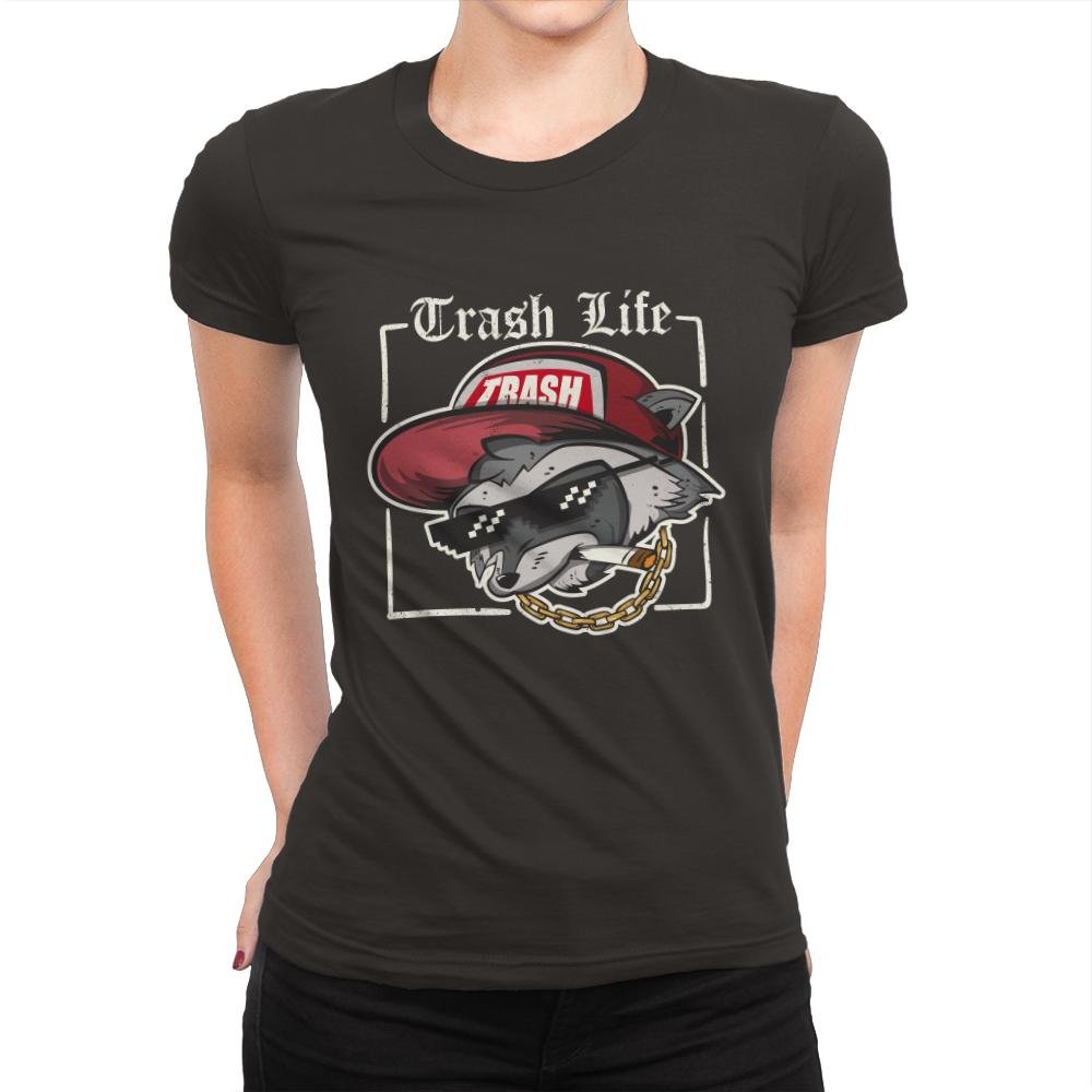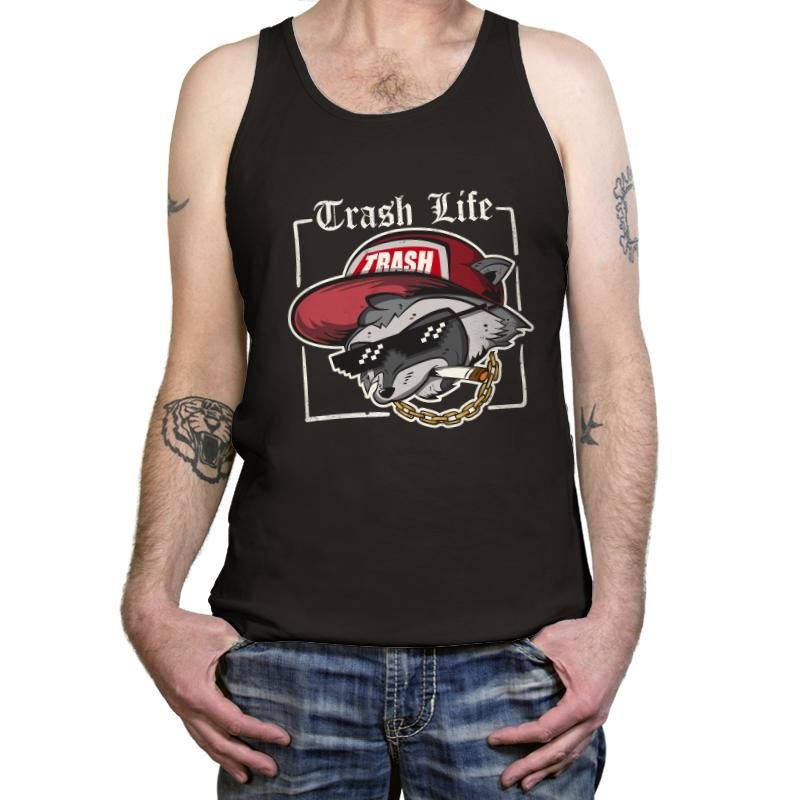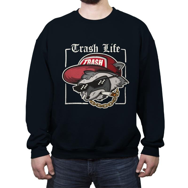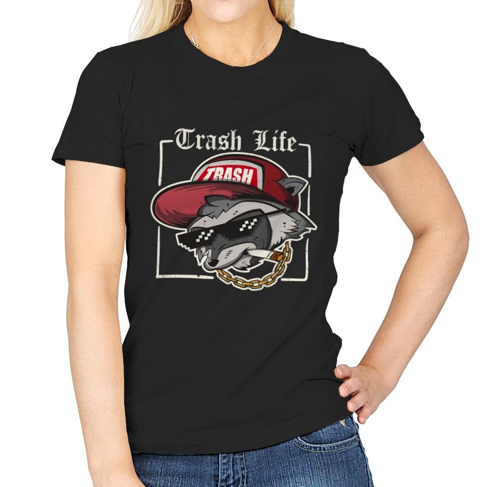 A smug raccoon rocks a snapback labeled TRASH, pixel shades, a chunky chain, and a cigarette like it was born for alleyway stardom. The gothic lettering above frames the whole thing as a lifestyle brand for critters who raid bins at 3 a.m. The art leans into internet meme culture blended with biker patch design and suburban wildlife documentary. Fans will instantly read the joke in treating a dumpster bandit as a style icon.