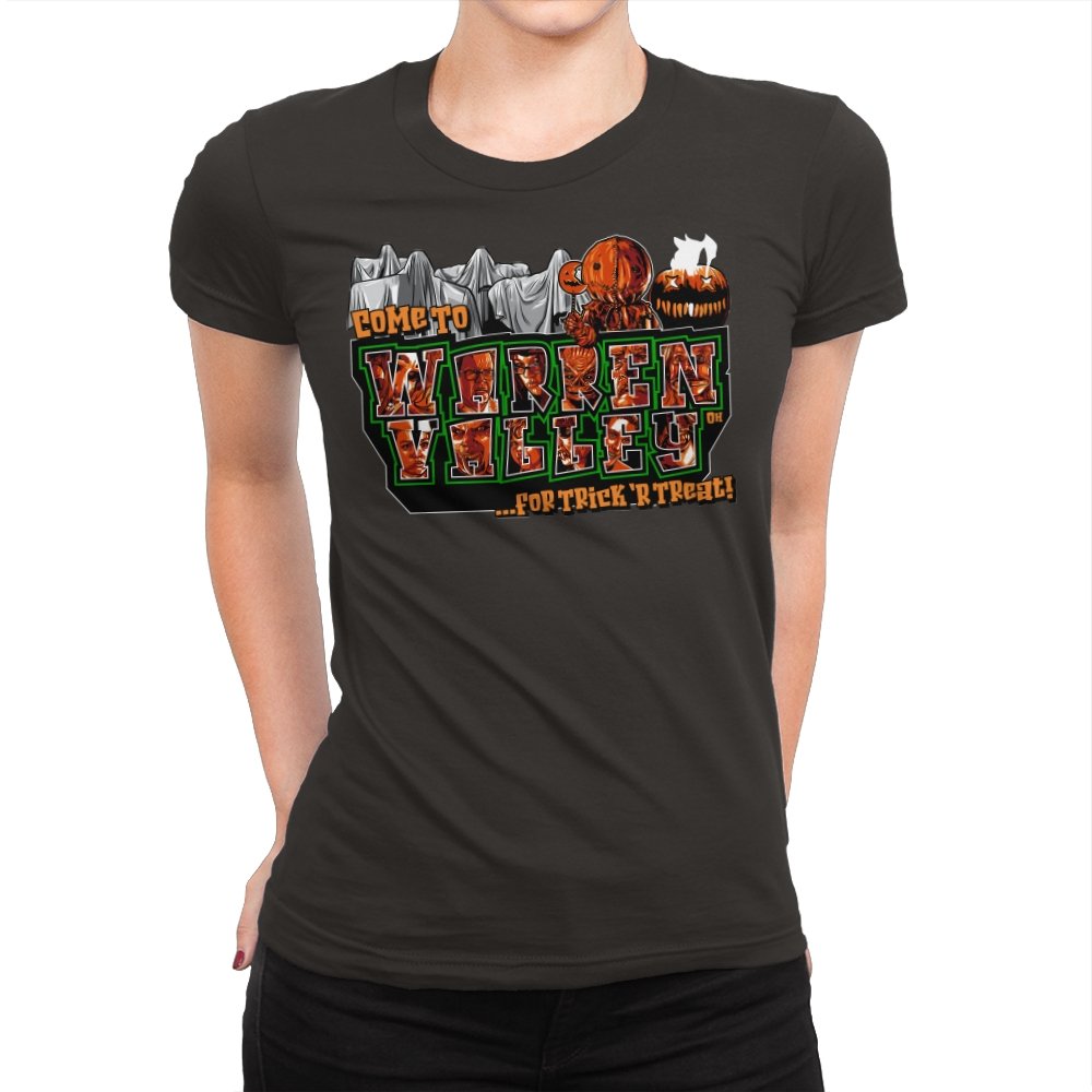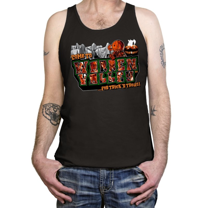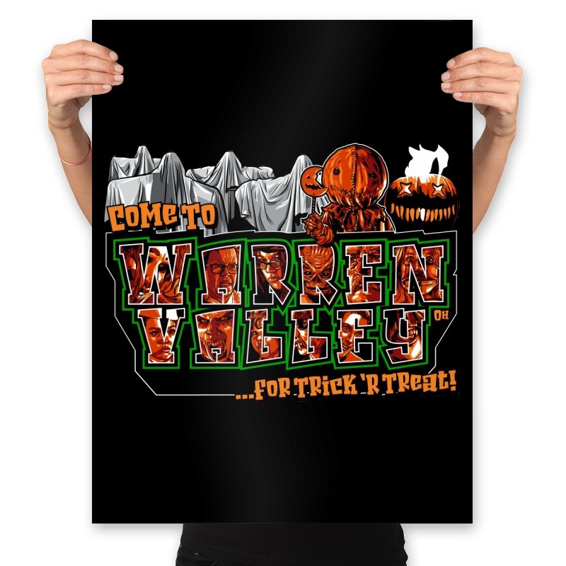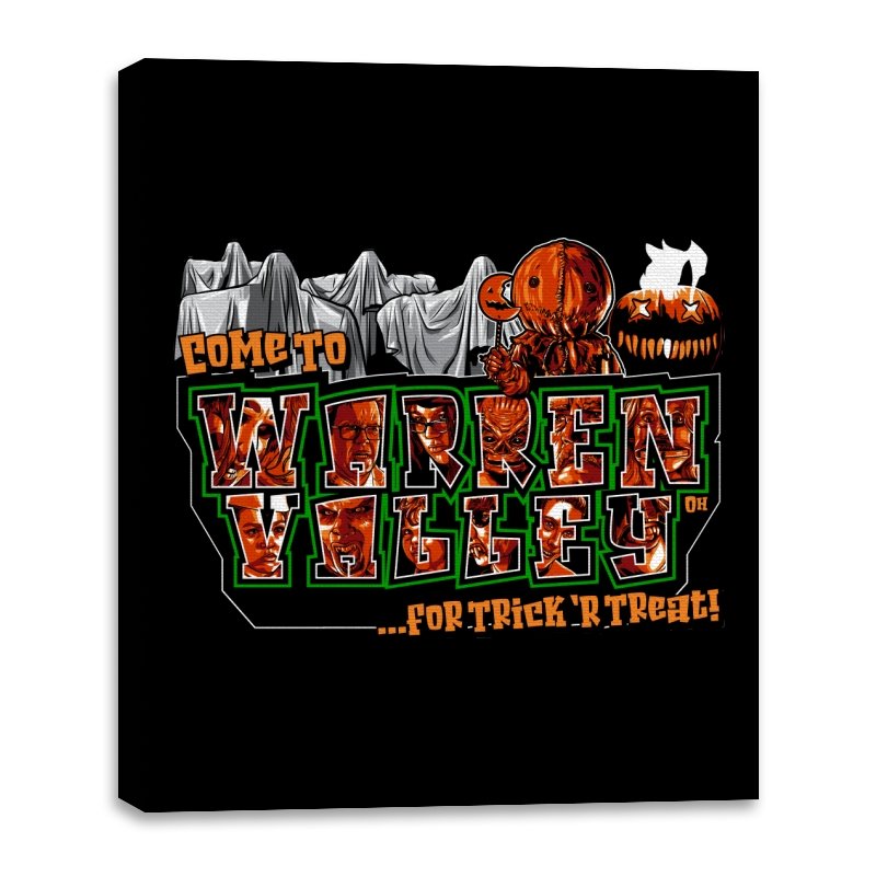 This design feels like a tourism ad for the most cursed Halloween destination in Ohio. The letters spell out the town name in chunky marquee type, each one filled with snapshots of costumed locals, late night mischief, and that burlap headed trickster who enforces the old rules. In the background sit bedsheet ghosts and a grinning jack o’ lantern, like the town’s chamber of commerce insisted on a family friendly shoot and ended up with something much stranger. If you know the reference, you can almost hear the crunch of leaves and distant laughter turning sour.