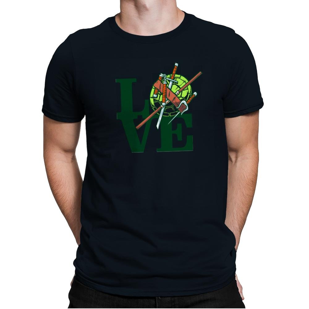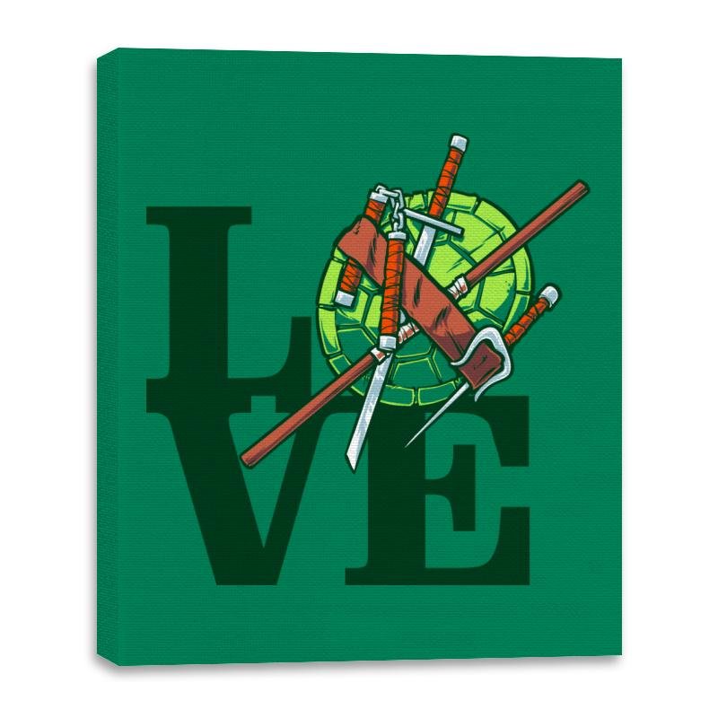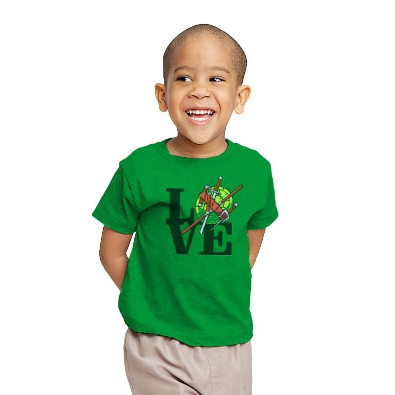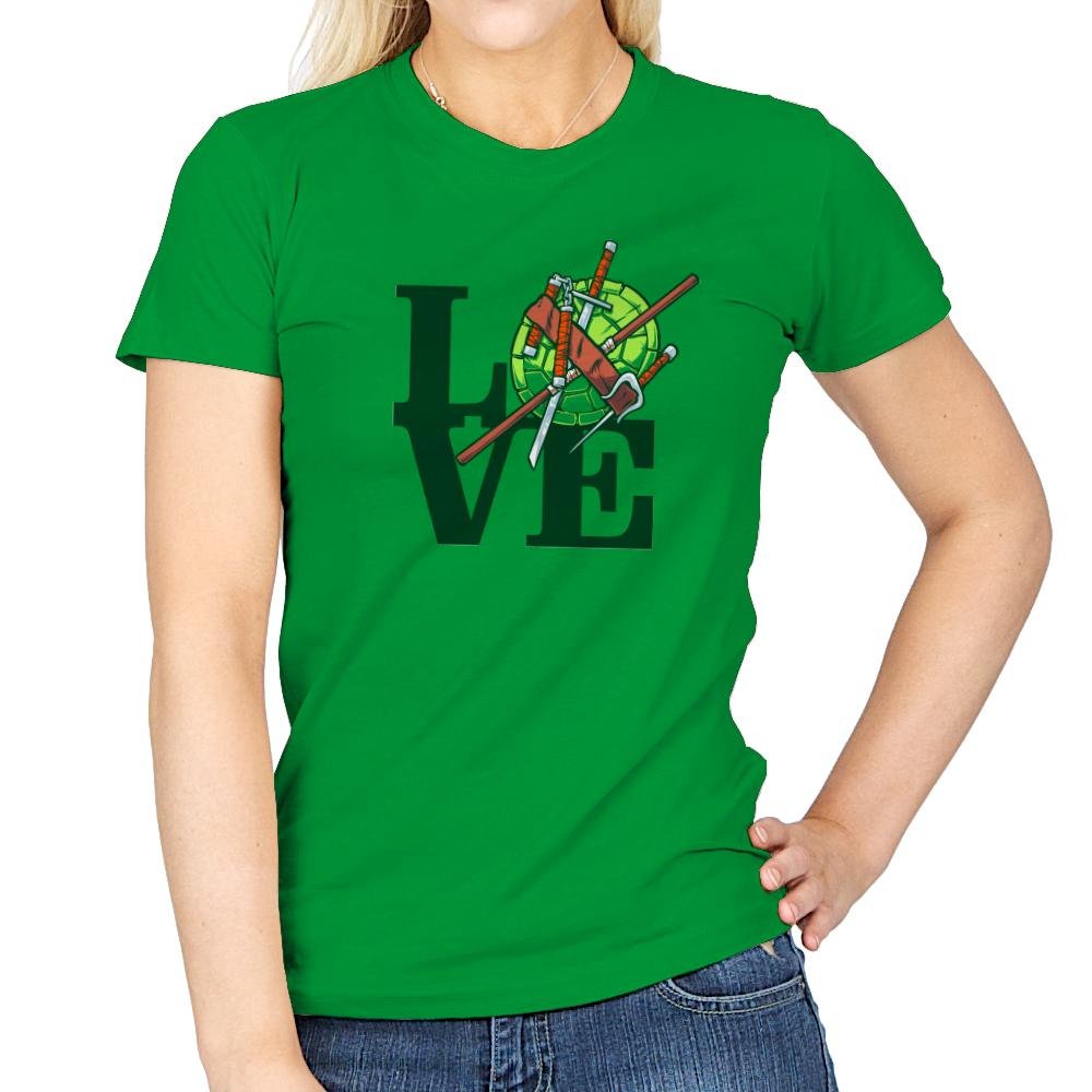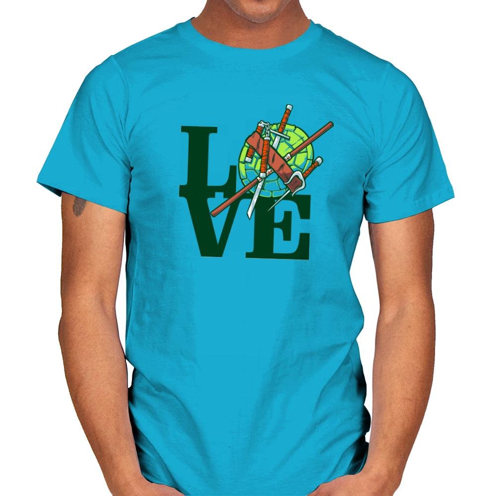 This design spells out a familiar four letter word using a turtle shell for the O and a pile of unmistakable gear for the V. Each weapon hints at a different personality from a certain quartet raised on pizza and rooftop warfare. The green field behind it all reinforces the shared theme without naming names. Fans do not need it spelled out.