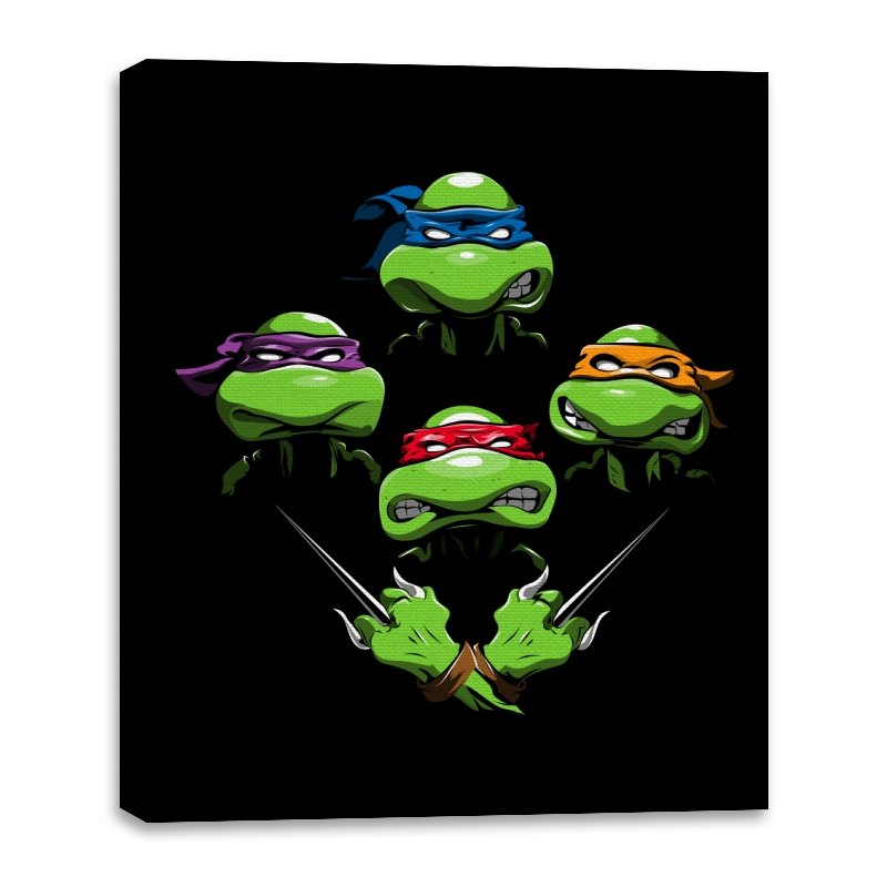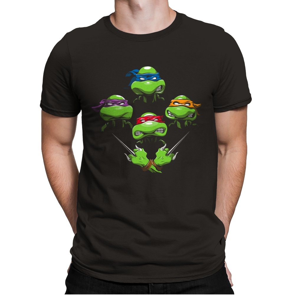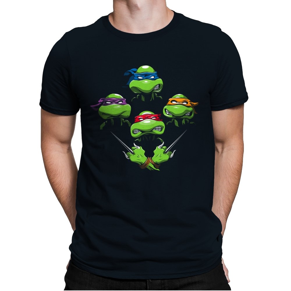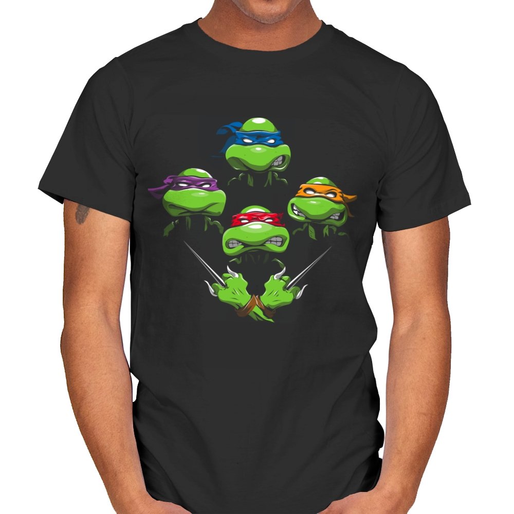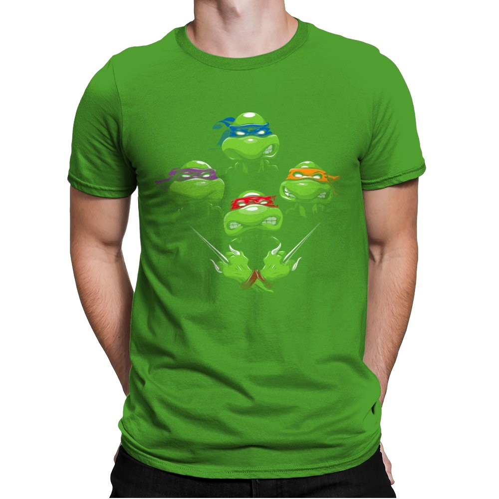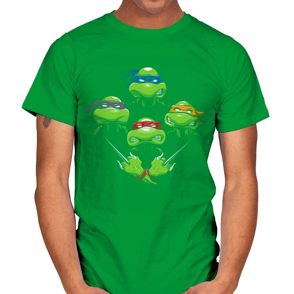 This design pulls together four familiar faces in a tight, symmetrical layout that instantly reads as a tribute for fans who grew up on late nights and reruns. Each masked head floats with its own attitude, unified by a shared glare and crossed blades below, forming a visual rhythm that mirrors a classic rock poster structure. The colors are clean and intentional, letting each personality stand apart while still feeling like part of the same crew. If you recognize the reference, you do not need it explained.
