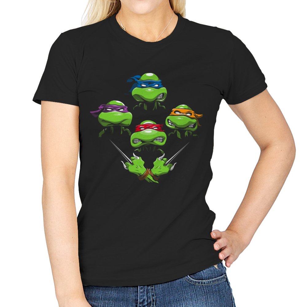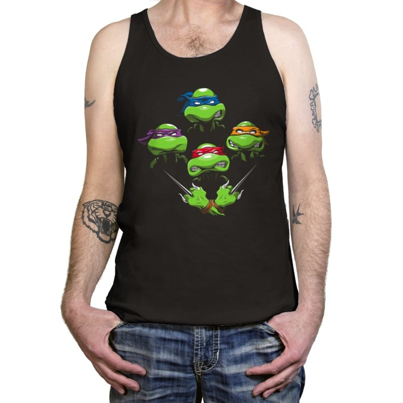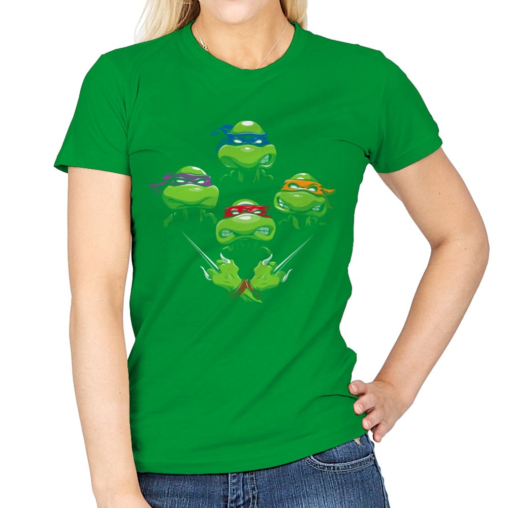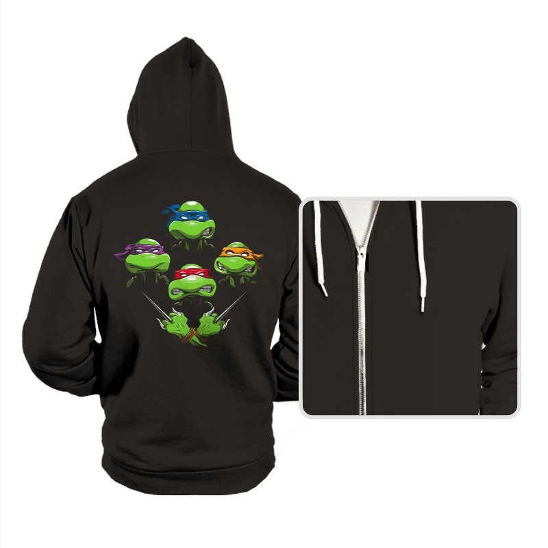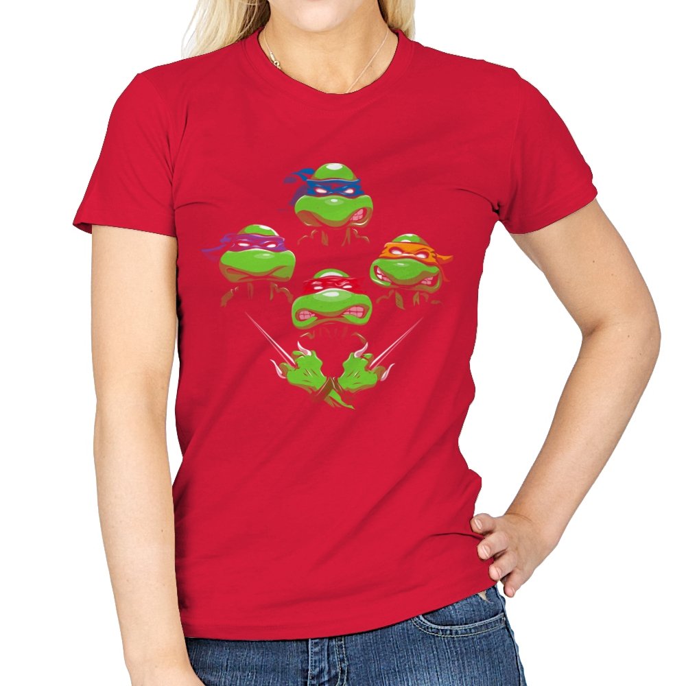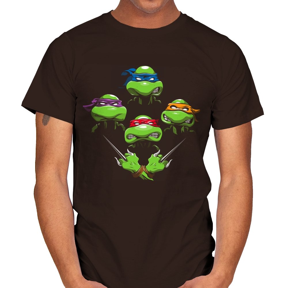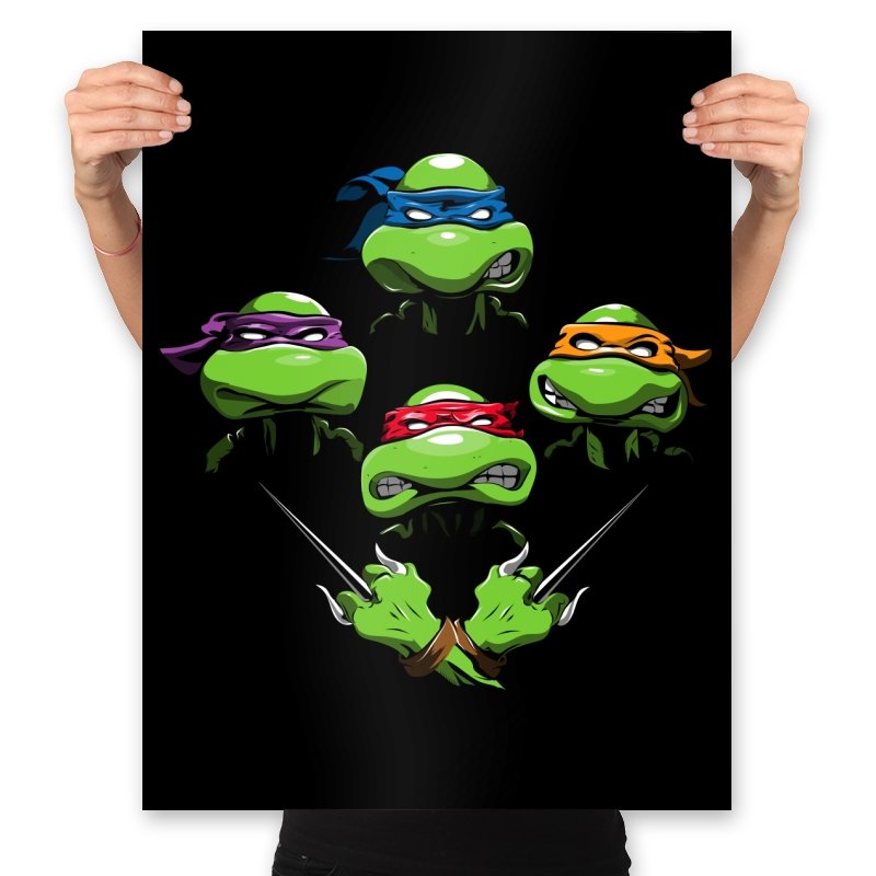 This design pulls together four familiar faces in a tight, symmetrical layout that instantly reads as a tribute for fans who grew up on late nights and reruns. Each masked head floats with its own attitude, unified by a shared glare and crossed blades below, forming a visual rhythm that mirrors a classic rock poster structure. The colors are clean and intentional, letting each personality stand apart while still feeling like part of the same crew. If you recognize the reference, you do not need it explained.
