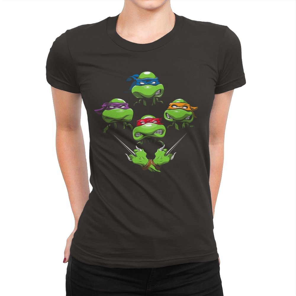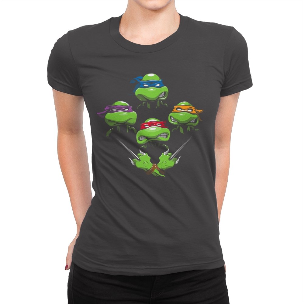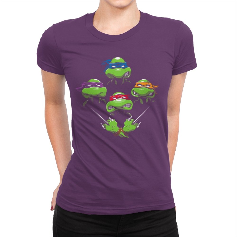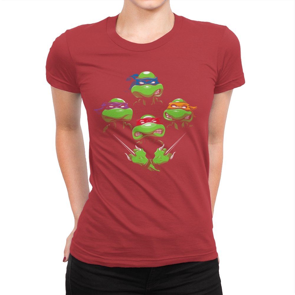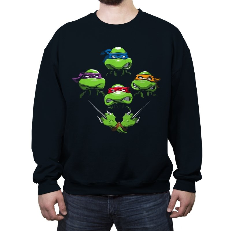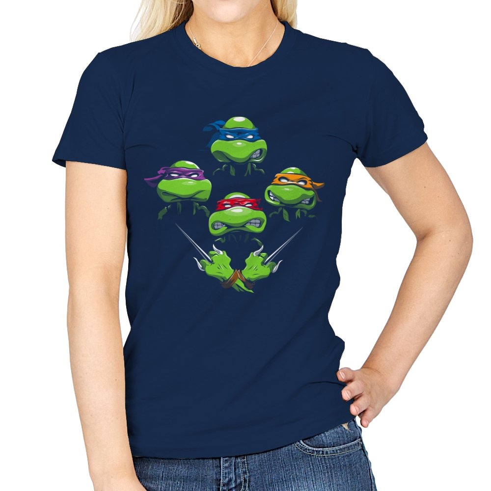 This design pulls together four familiar faces in a tight, symmetrical layout that instantly reads as a tribute for fans who grew up on late nights and reruns. Each masked head floats with its own attitude, unified by a shared glare and crossed blades below, forming a visual rhythm that mirrors a classic rock poster structure. The colors are clean and intentional, letting each personality stand apart while still feeling like part of the same crew. If you recognize the reference, you do not need it explained.