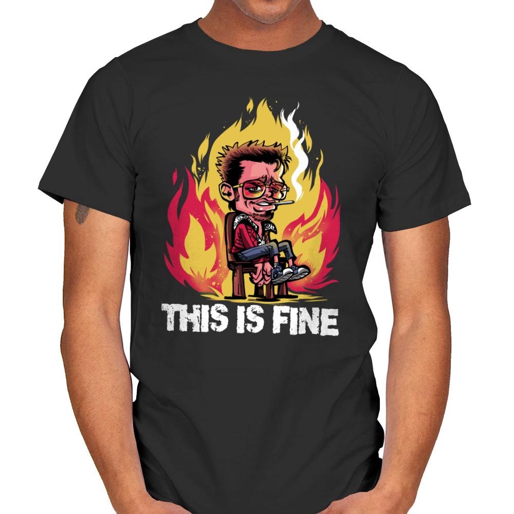 This design twists a familiar internet meltdown into something sharper and more self-aware. A smug, burned-out figure sits calmly in a chair while everything behind him goes up in flames. The exaggerated grin and stylized fire turn collapse into performance. If you know the reference, the humor lands somewhere between satire and resignation.