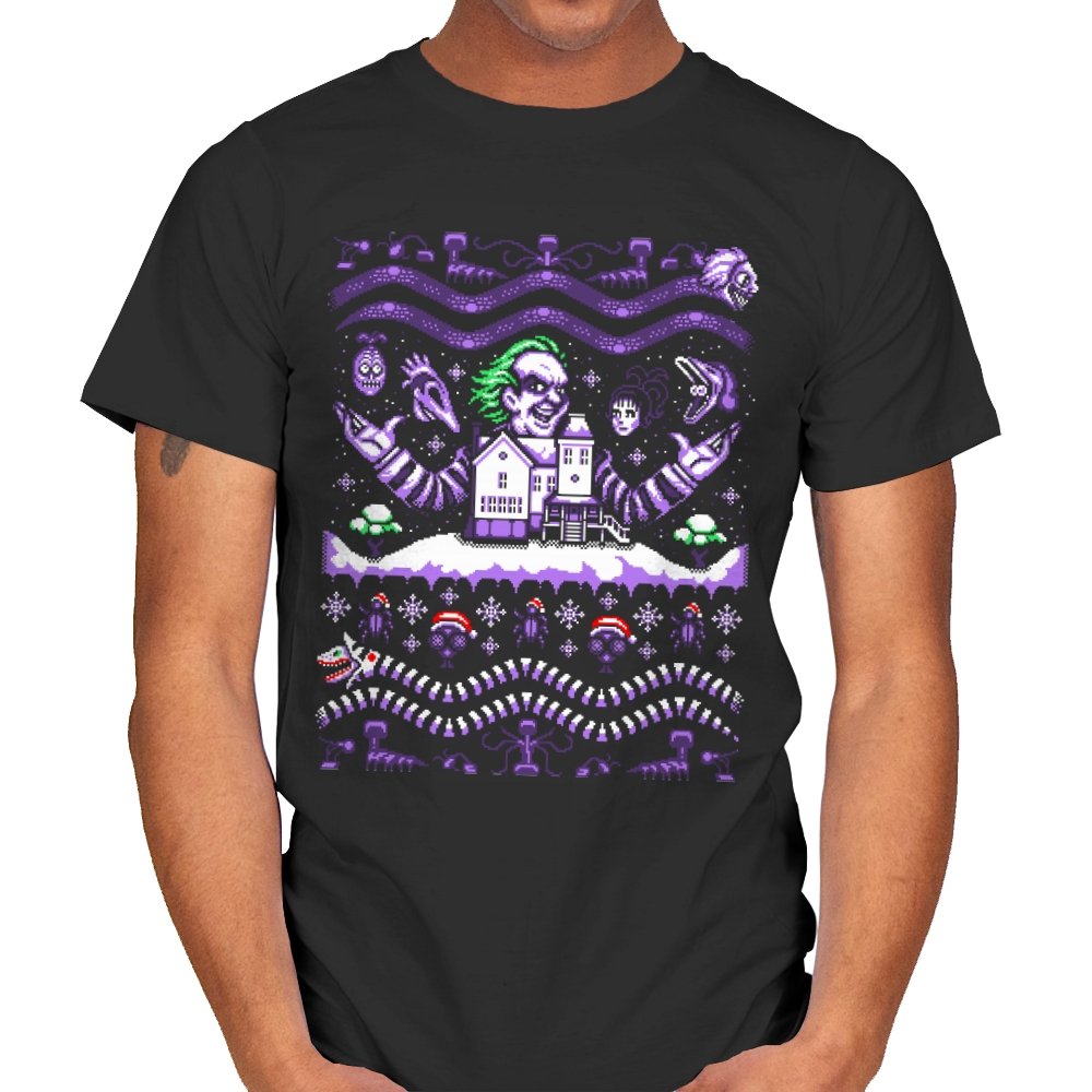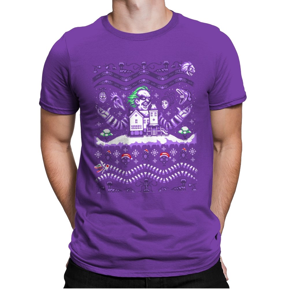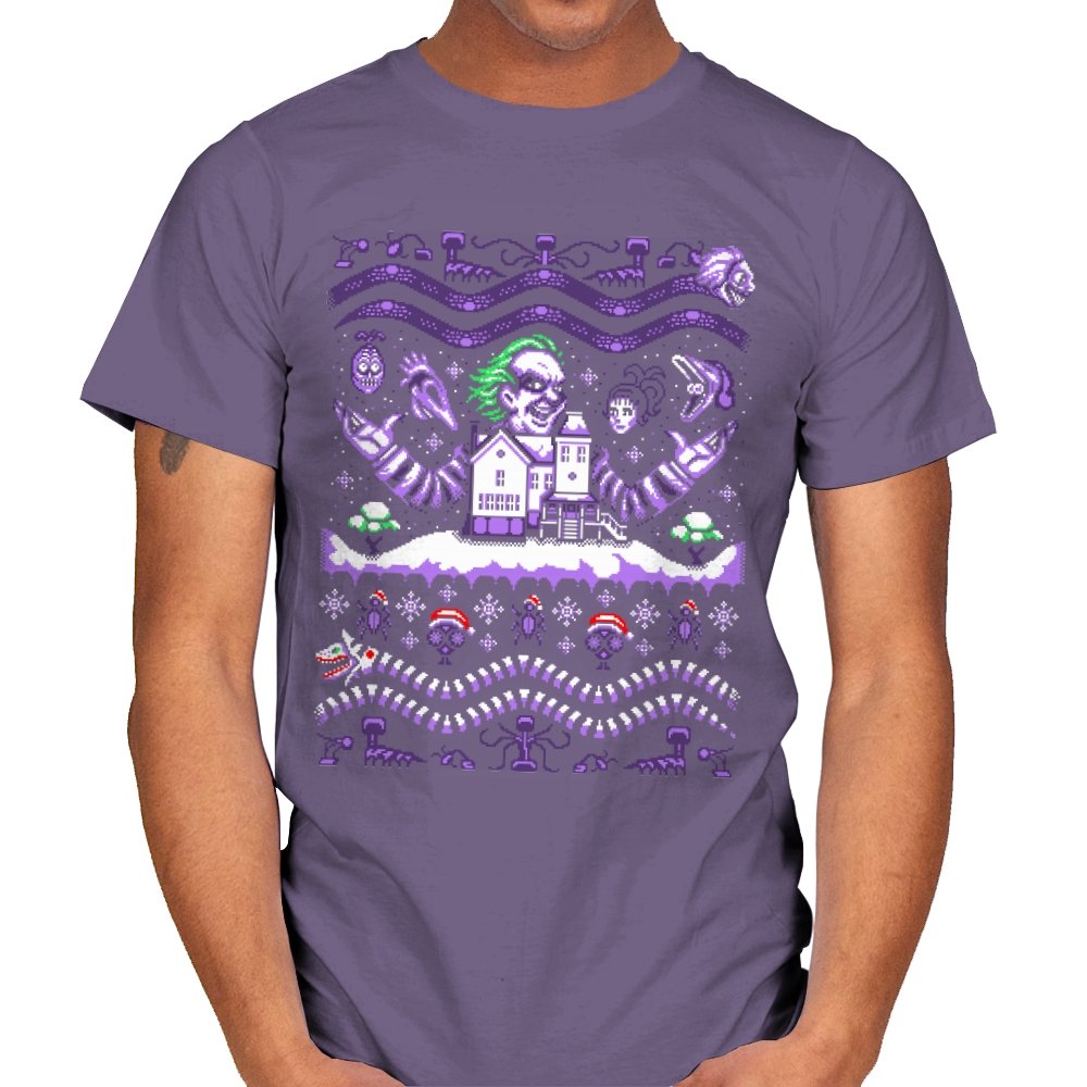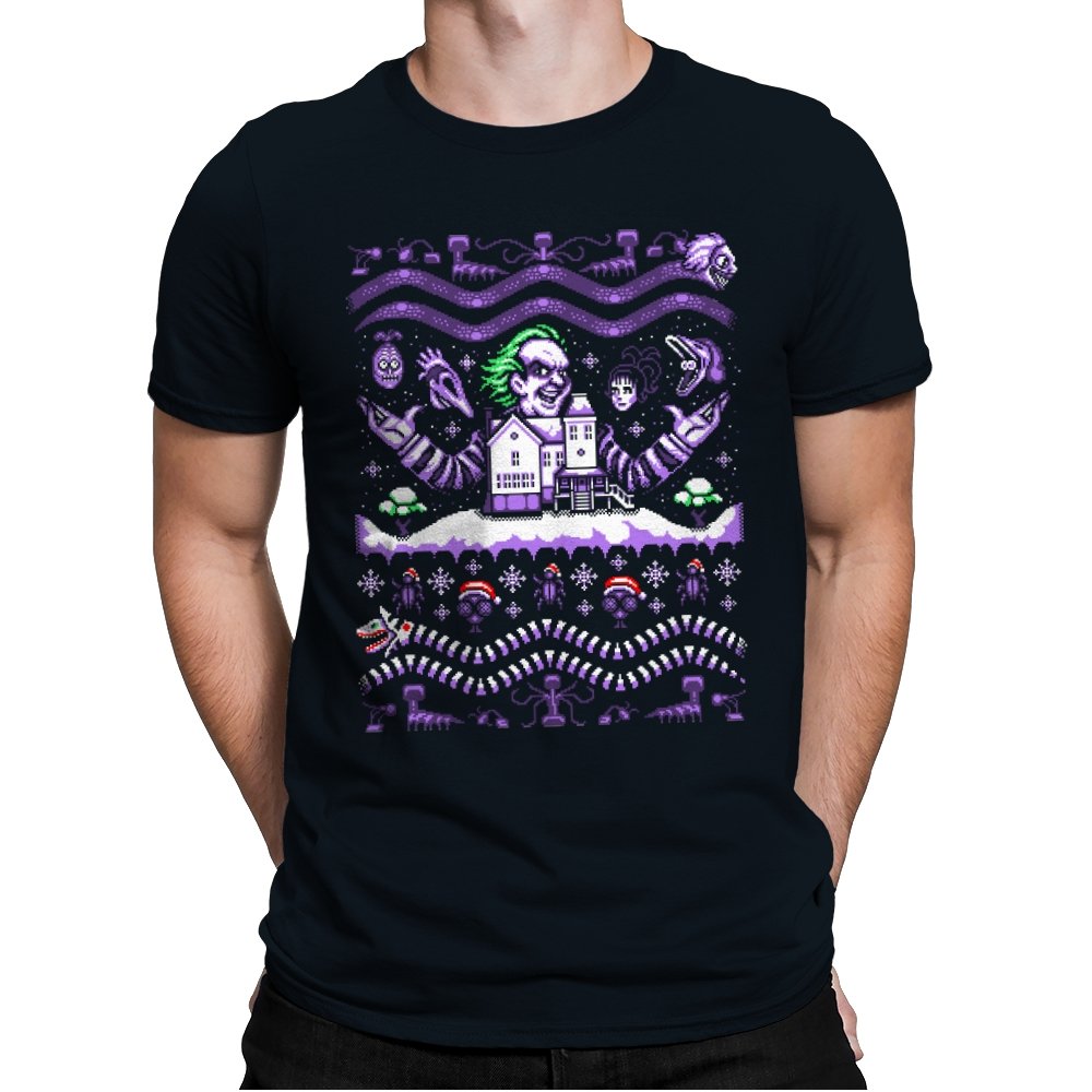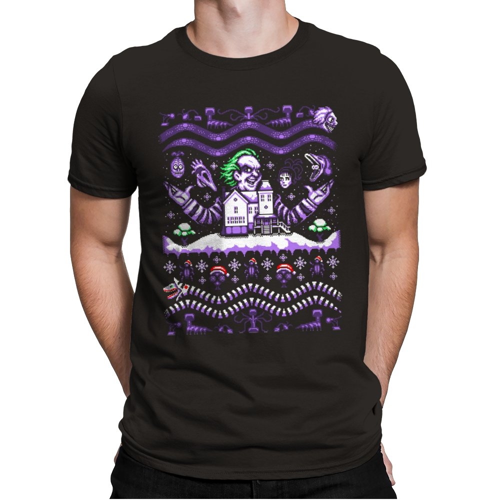 This design drags a certain chaotic bio exorcist into ugly holiday sweater territory. Faux knit stitches show him looming over a snow covered house with purple and green curls billowing out, flanked by floating masks and spectral faces. Sandworms coil beneath the scene while stitched snowflakes, bones, and grim little icons stack into sweater patterns. Anyone who has seen the movie will clock the grin, the stripes, and the manic stage presence in an instant.