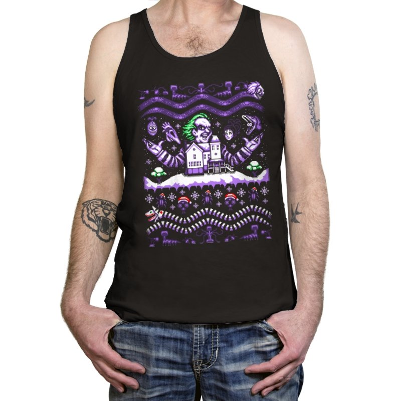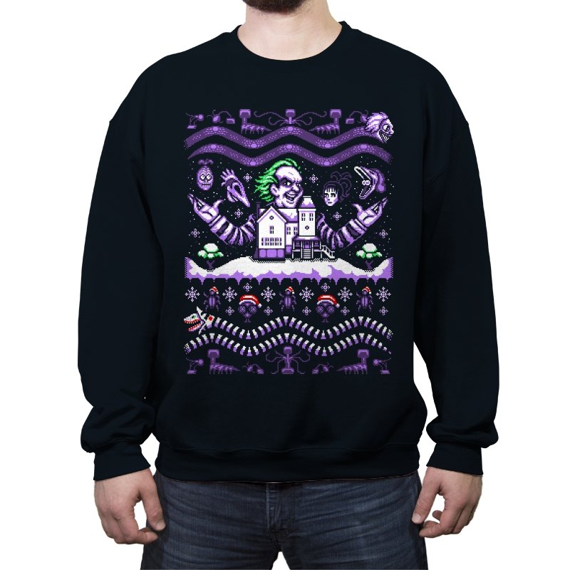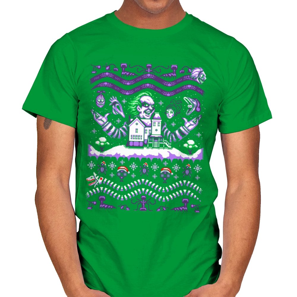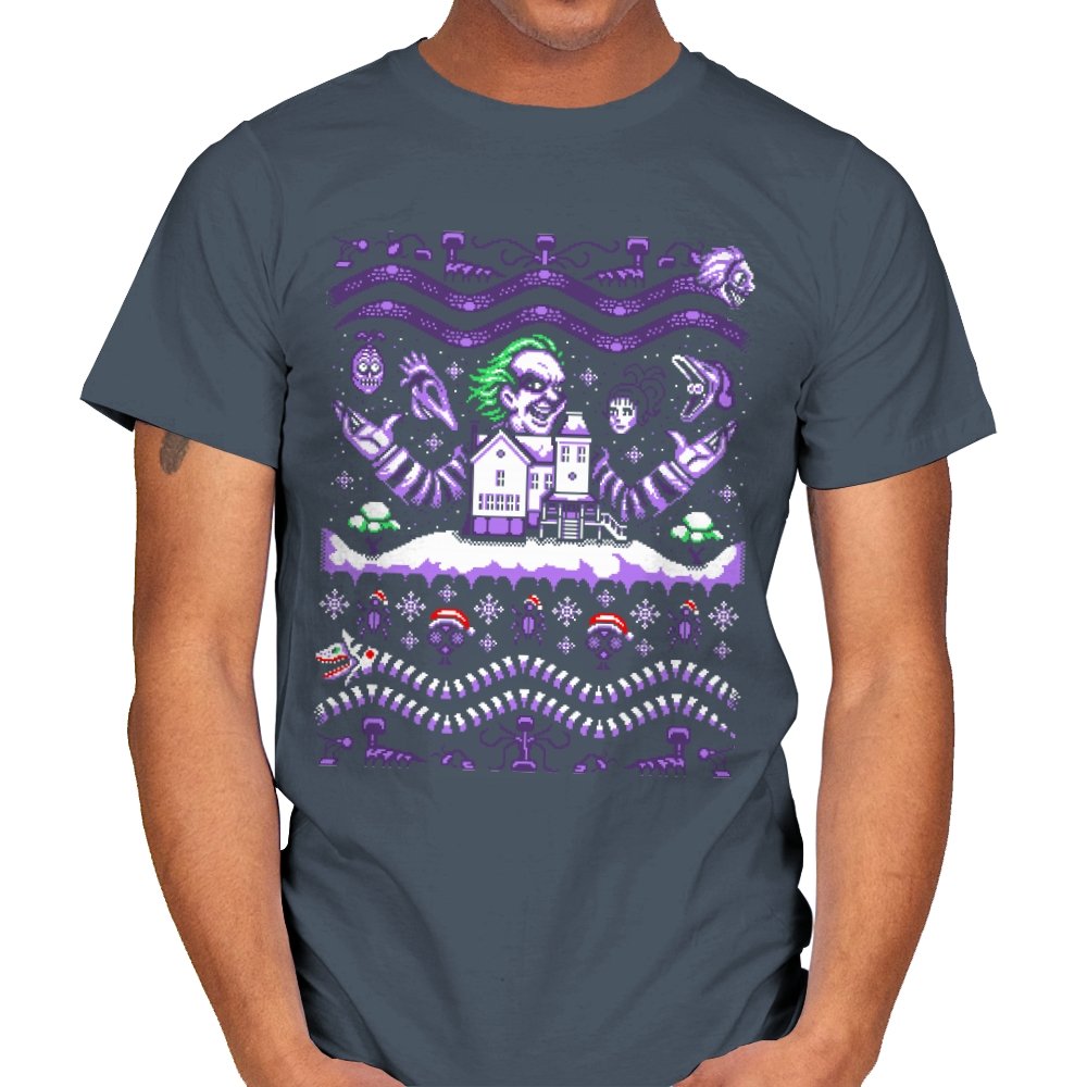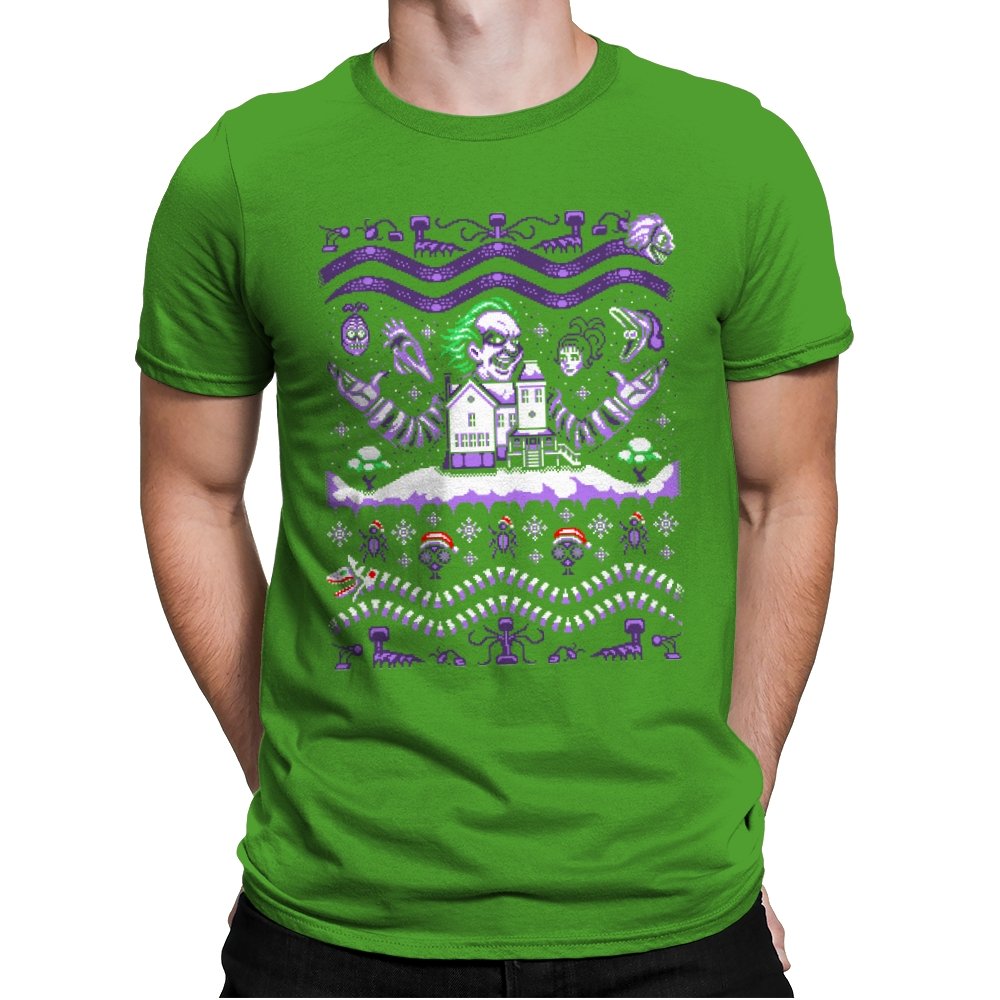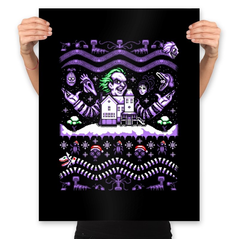 This design drags a certain chaotic bio exorcist into ugly holiday sweater territory. Faux knit stitches show him looming over a snow covered house with purple and green curls billowing out, flanked by floating masks and spectral faces. Sandworms coil beneath the scene while stitched snowflakes, bones, and grim little icons stack into sweater patterns. Anyone who has seen the movie will clock the grin, the stripes, and the manic stage presence in an instant.