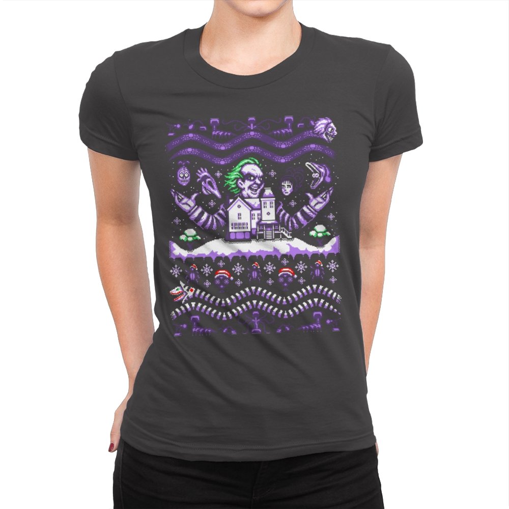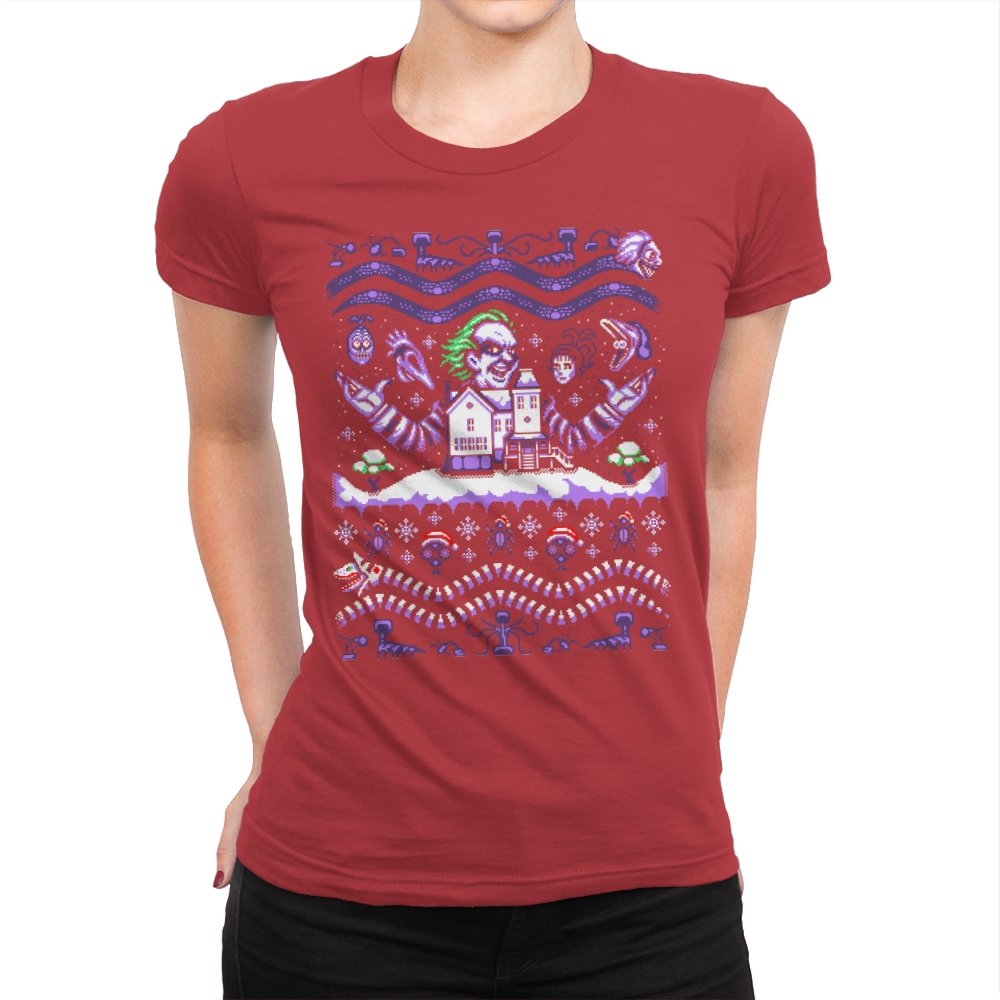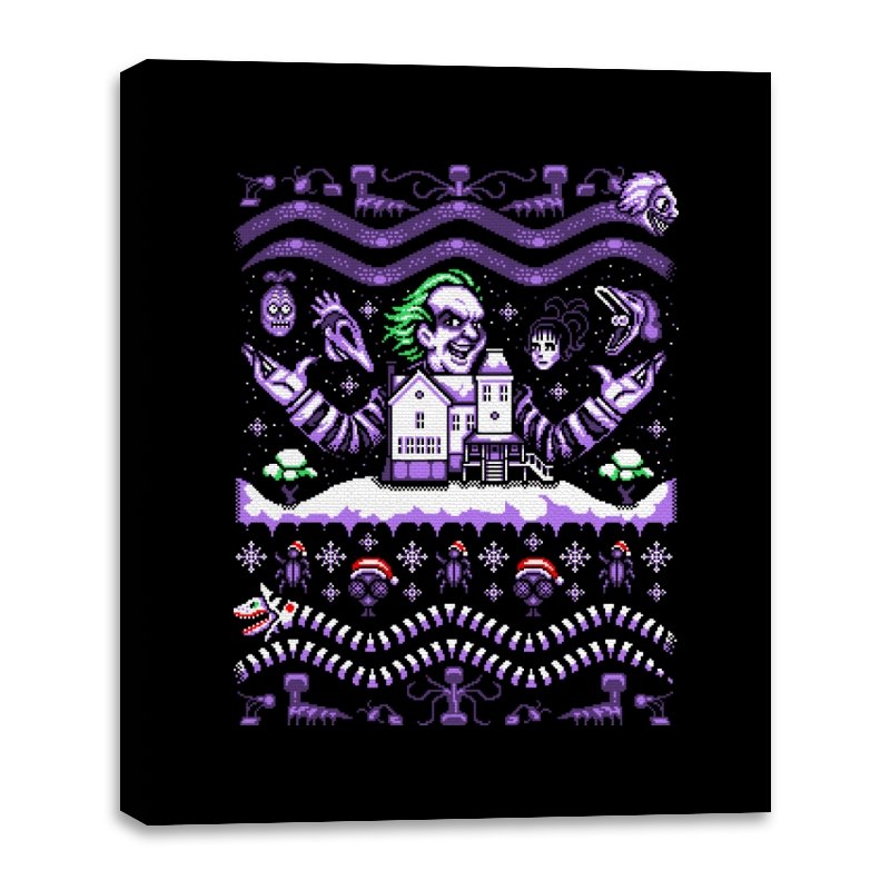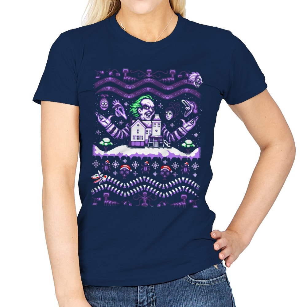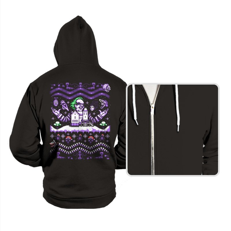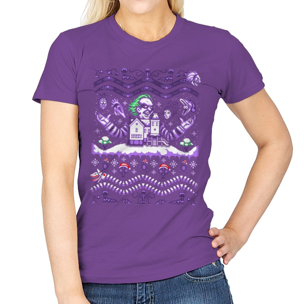 This design drags a certain chaotic bio exorcist into ugly holiday sweater territory. Faux knit stitches show him looming over a snow covered house with purple and green curls billowing out, flanked by floating masks and spectral faces. Sandworms coil beneath the scene while stitched snowflakes, bones, and grim little icons stack into sweater patterns. Anyone who has seen the movie will clock the grin, the stripes, and the manic stage presence in an instant.