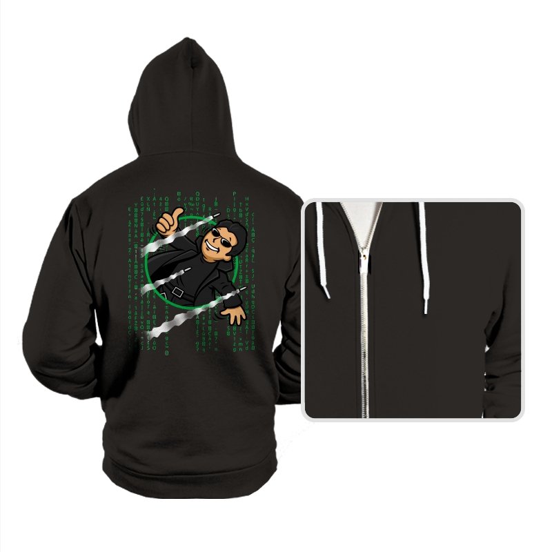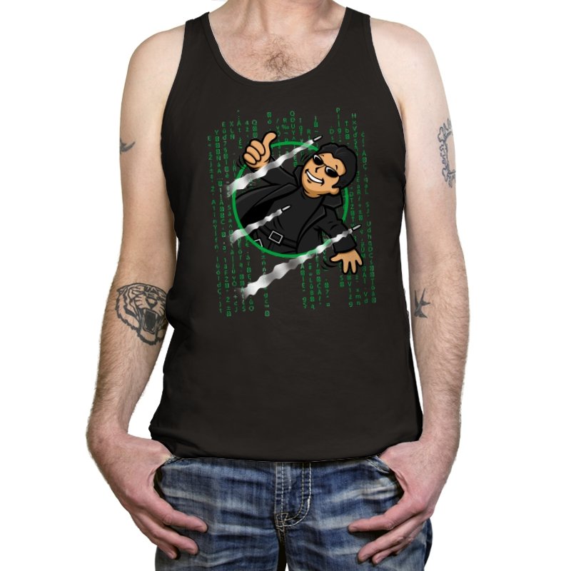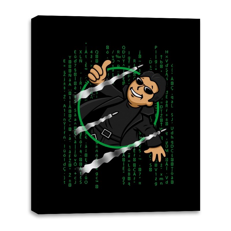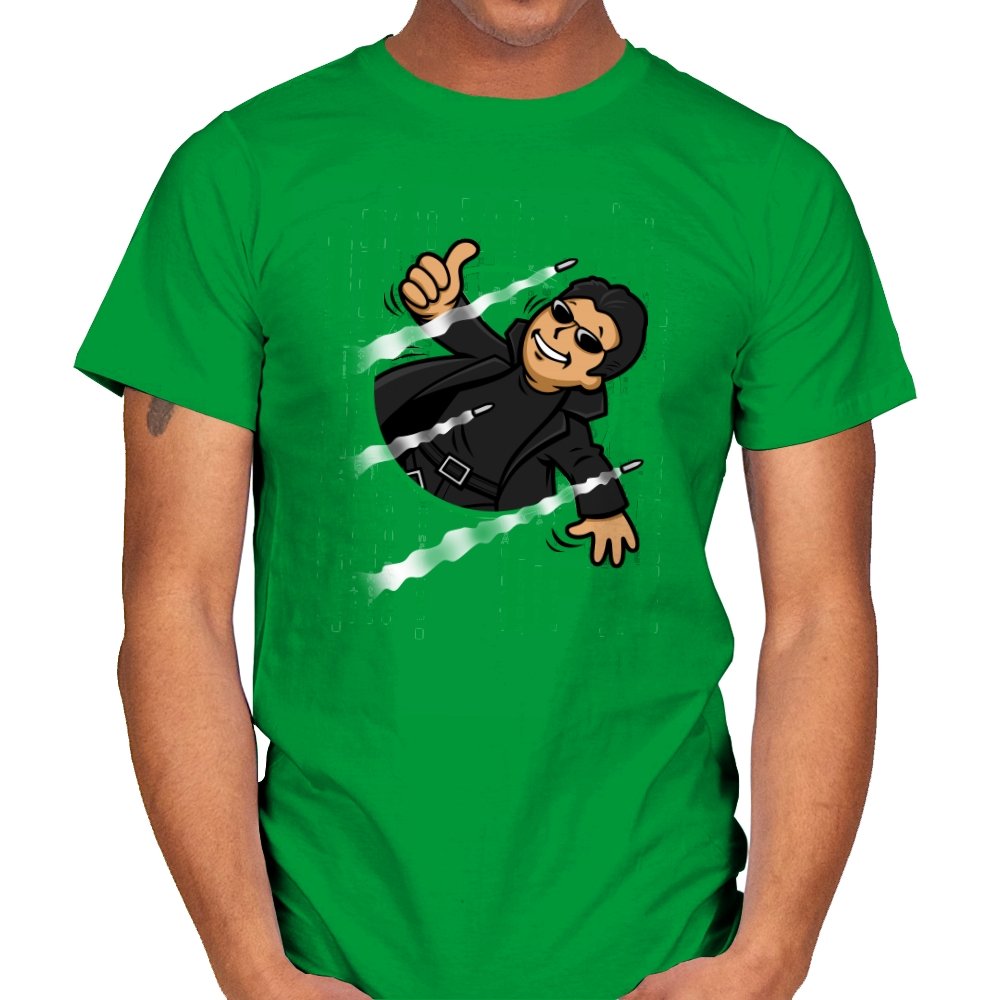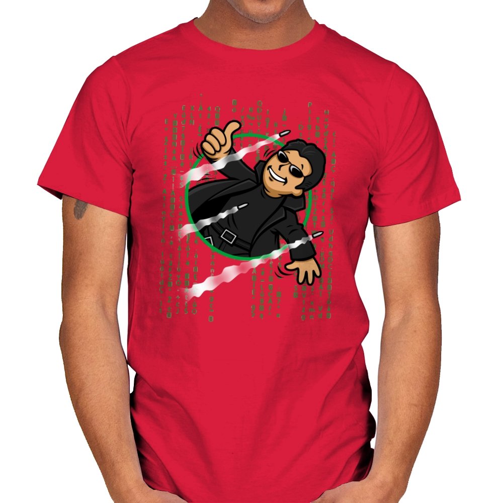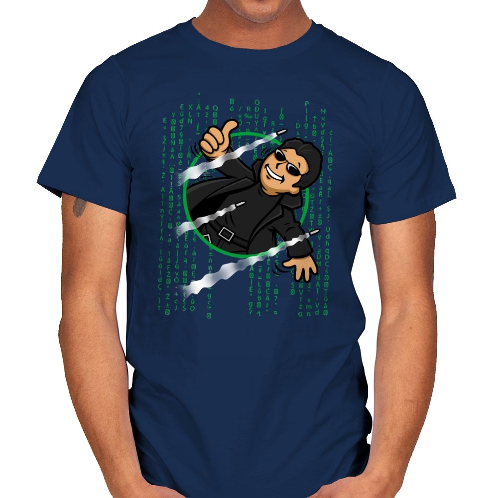Vault Neo fuses cyberpunk reality bending with a cheerful wasteland mascot. The design shows a smiling hero in black coat and shades bursting through streams of green code that peel open like rips in the simulation. The contrast between stoic action cinema and upbeat cartoon style is the whole joke, and fans catch both sides without explanation. The code backdrop completes the reference for anyone who ever wondered if the world runs on glitches and charm.