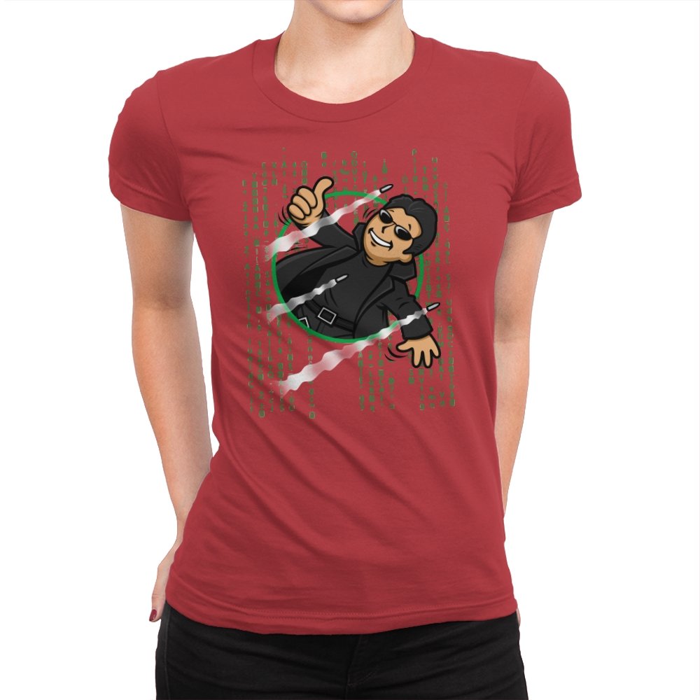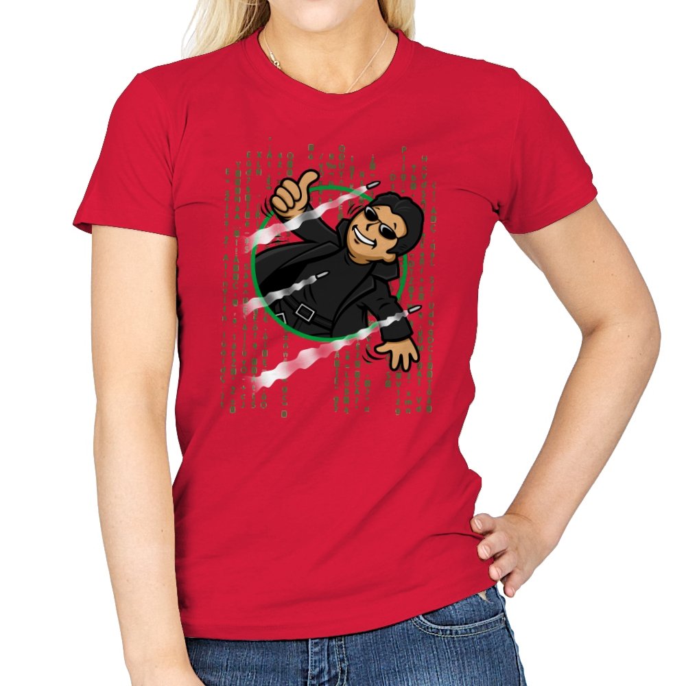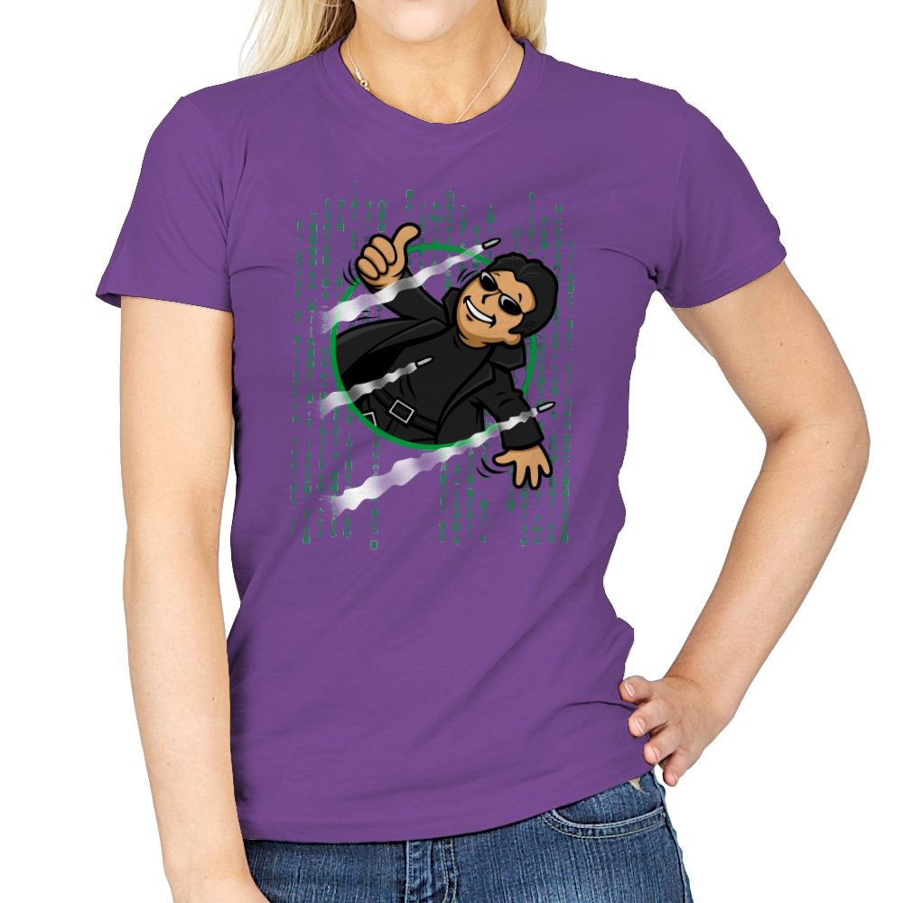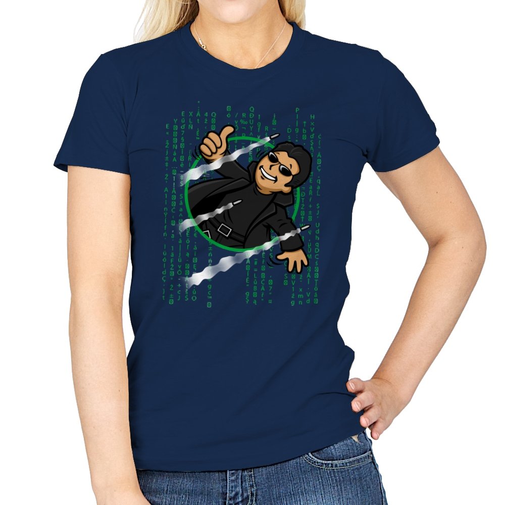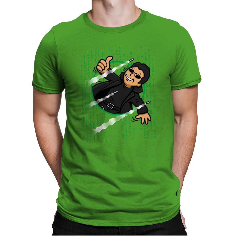 Vault Neo fuses cyberpunk reality bending with a cheerful wasteland mascot. The design shows a smiling hero in black coat and shades bursting through streams of green code that peel open like rips in the simulation. The contrast between stoic action cinema and upbeat cartoon style is the whole joke, and fans catch both sides without explanation. The code backdrop completes the reference for anyone who ever wondered if the world runs on glitches and charm.