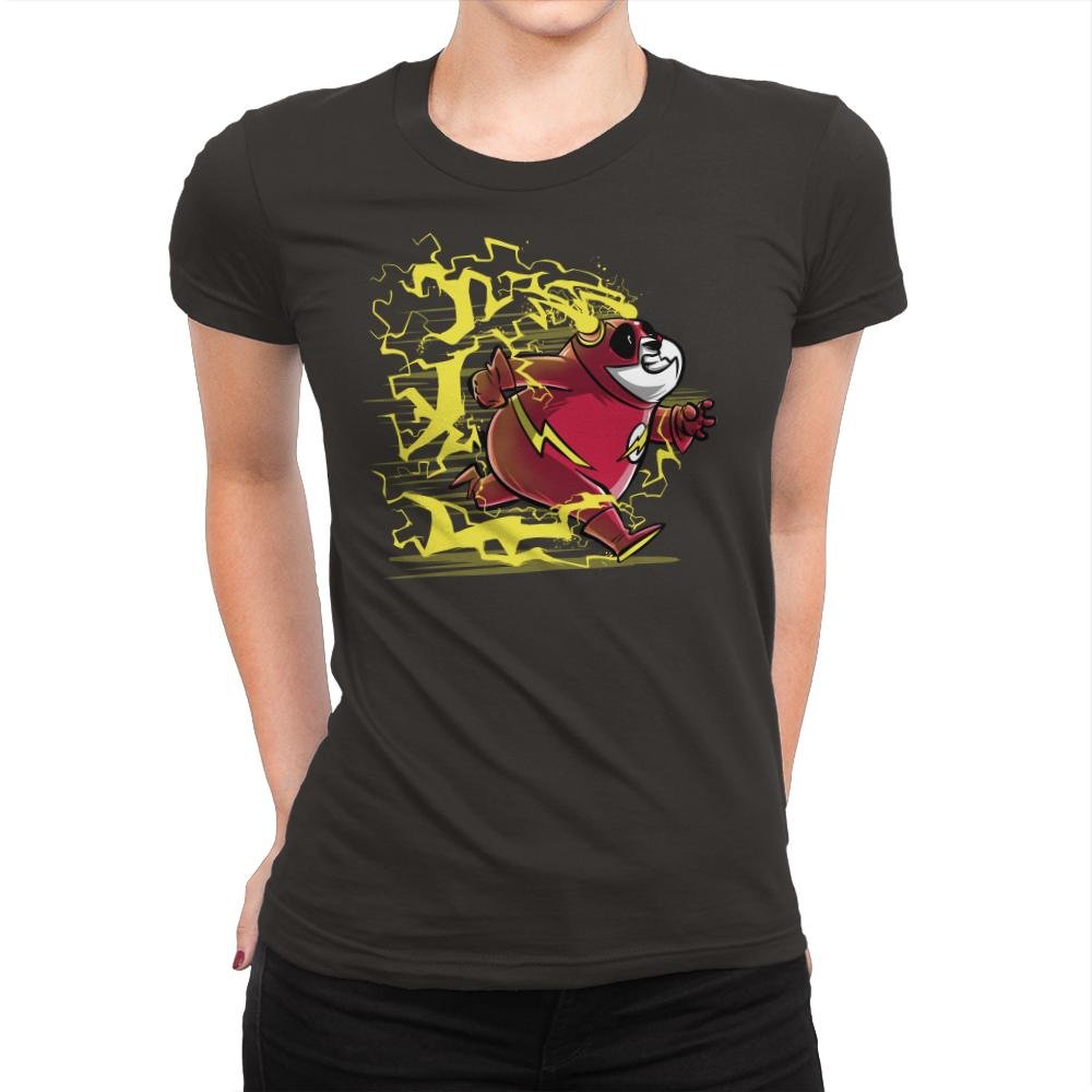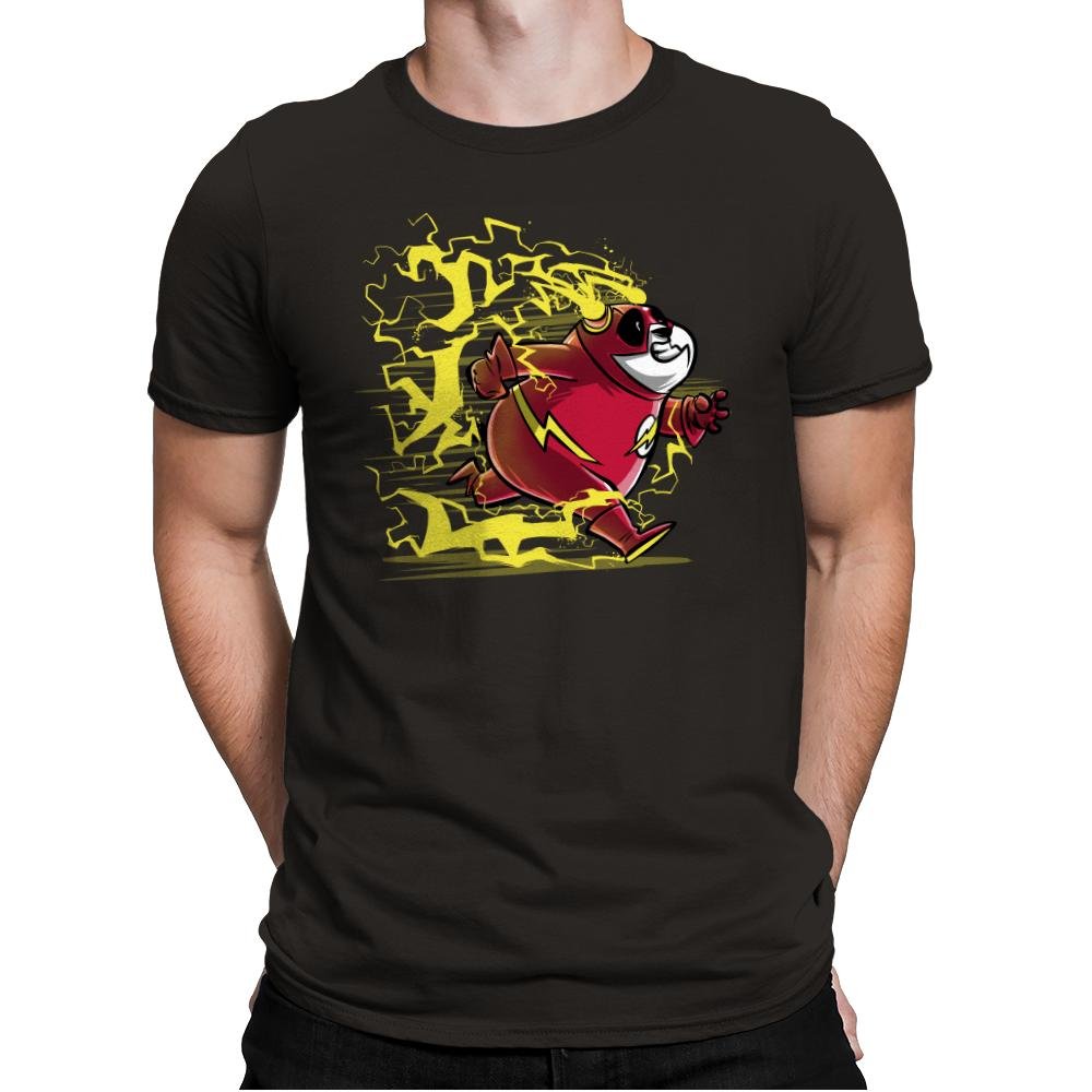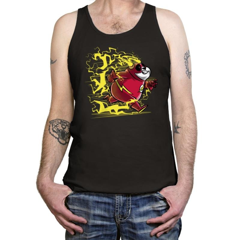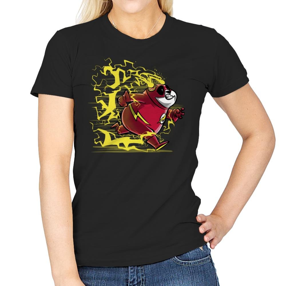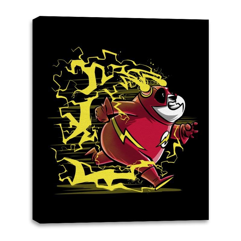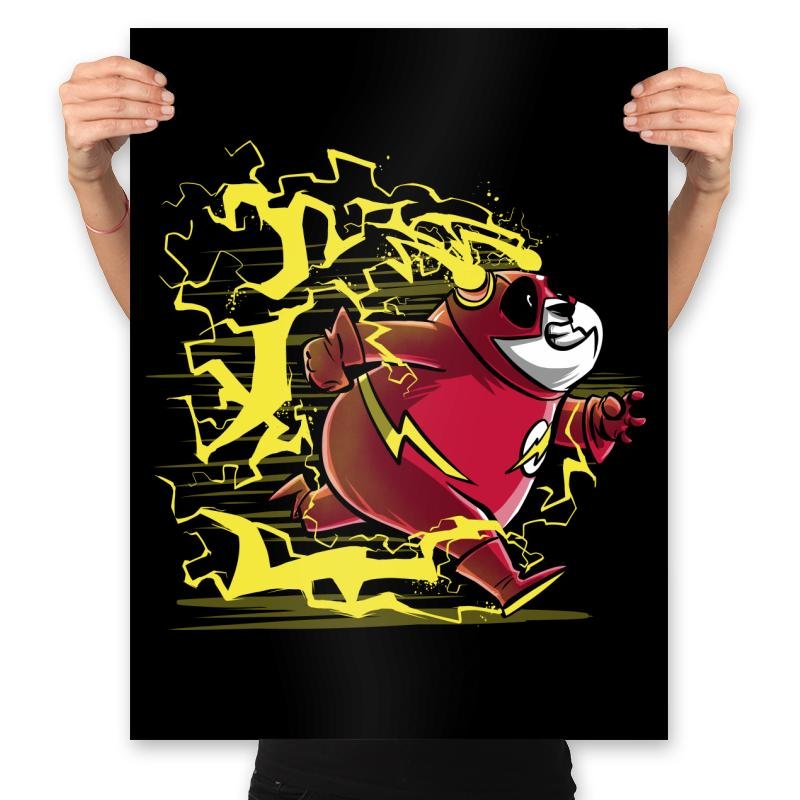 A grinning panda tears across the scene in a bright red supersuit while yellow lightning crackles around each step. The costume details and ear lightning bolts make the reference obvious to anyone who grew up flipping through comic issues or watching animated hero shows after school. The chunky linework and stretched action pose give the character a sense of ridiculous speed that suits a round bear better than it should. It is a love letter to mascots, metahumans, and the idea that even the slowest animals can break the sound barrier if they believe hard enough.