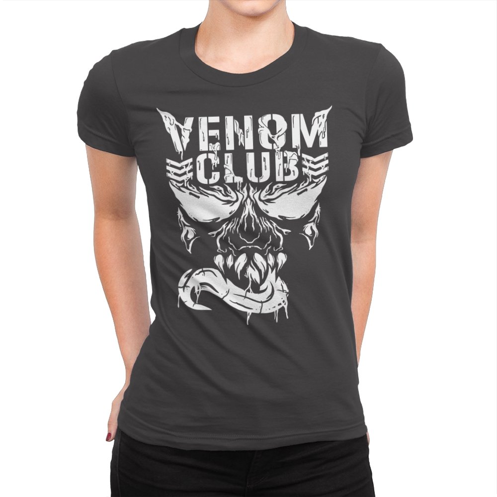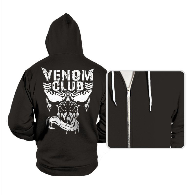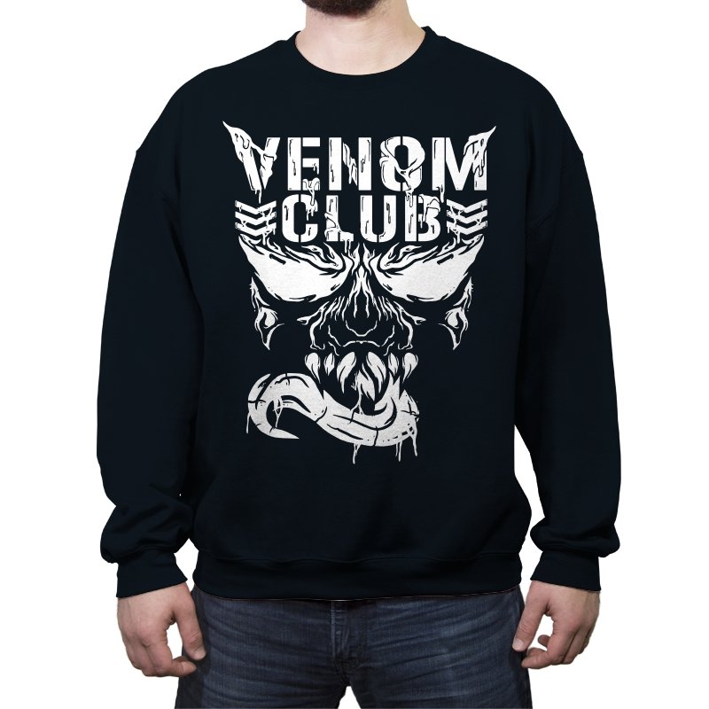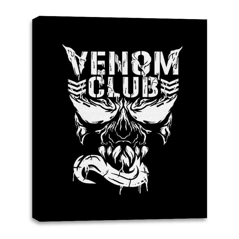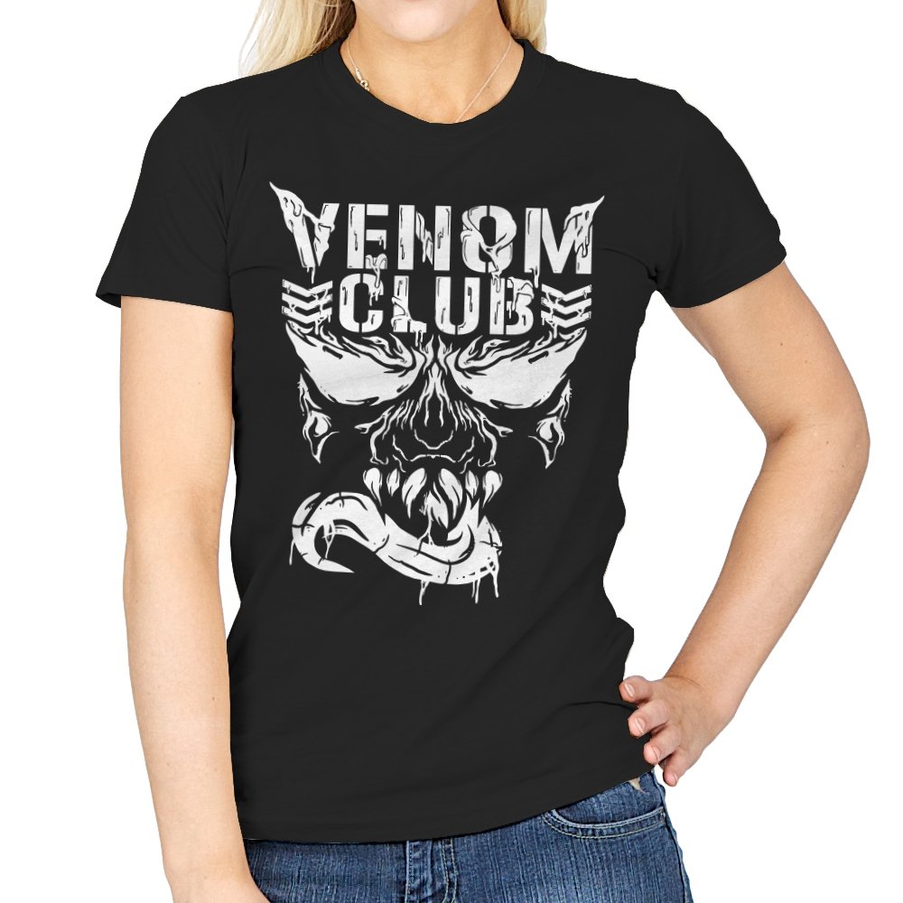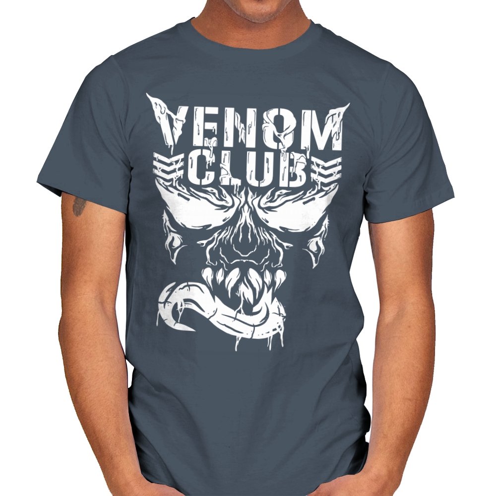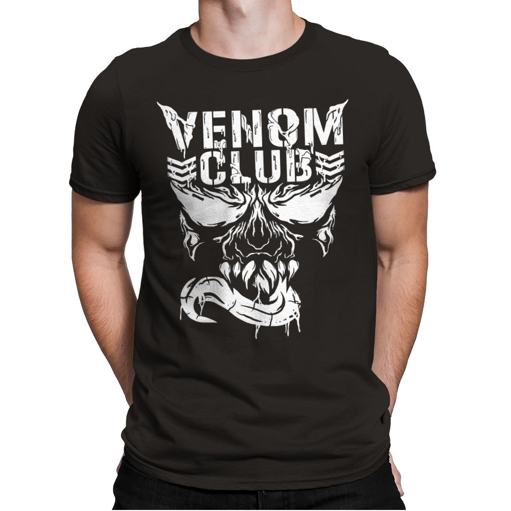 This design treats a certain toothy symbiote as the mascot of a gritty underground club. The skull like face stares forward with jagged eyes, rows of sharp teeth, and a long tongue curling out like a banner. The white artwork looks scraped and weathered, as if it were spray painted on concrete or printed on an old gig flyer. Fans already know the character and why a “club” built around him feels both funny and metal.