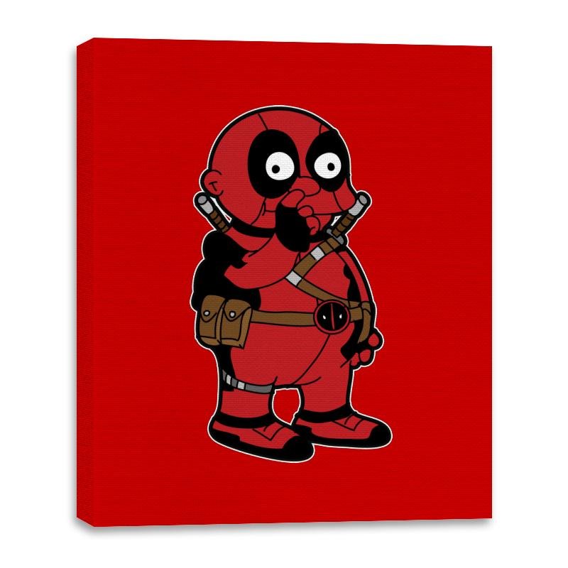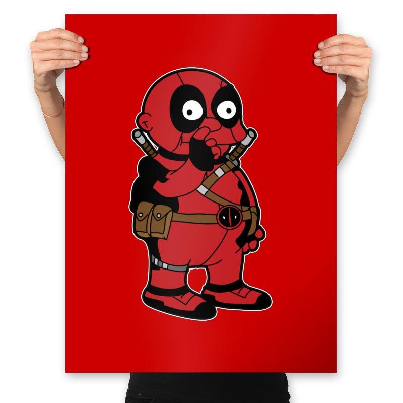 This design puts a unique twist on two iconic characters, merging Deadpool with the lovable Homer Simpson. The result is a chibi-style Deadpool, complete with his signature red suit and weapons, but with the charming, round shape of Homer. His mischievous grin and the classic “shush” gesture make it clear that this mash-up is all about fun and humor. The bold red background adds to the vibrant energy of the design, ensuring this playful character stands out.