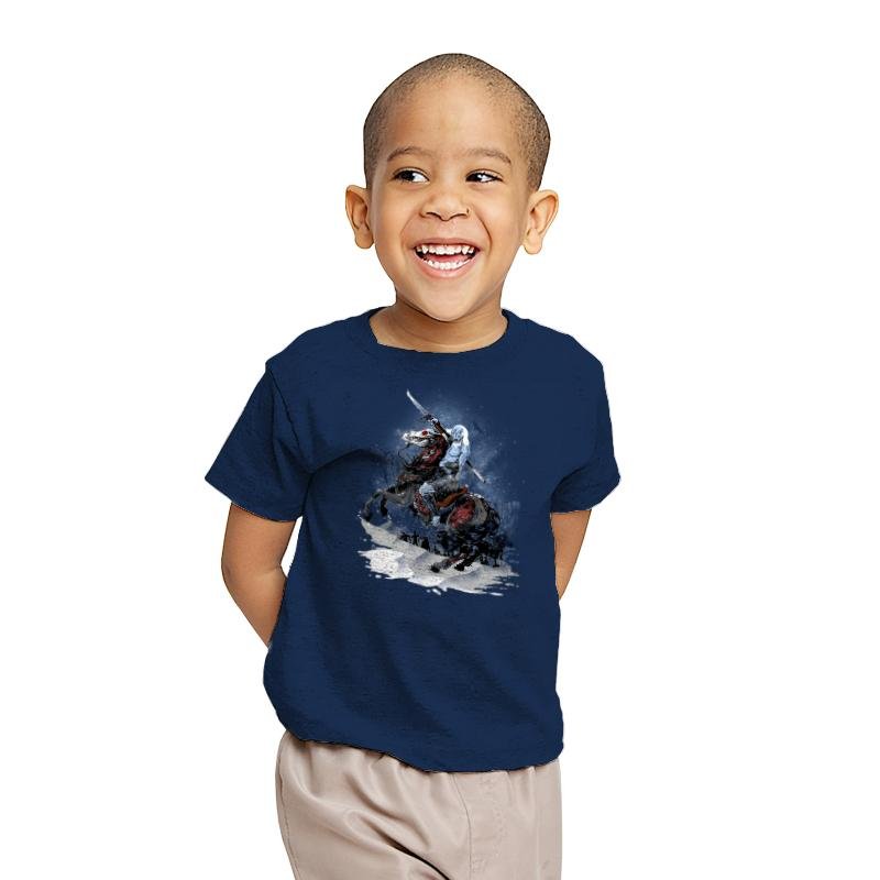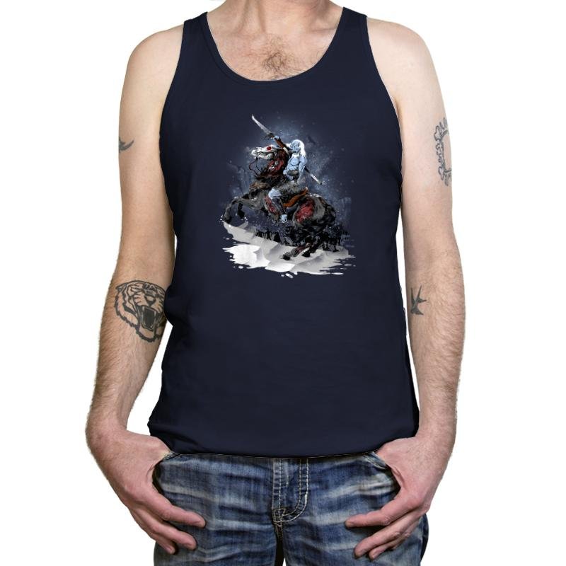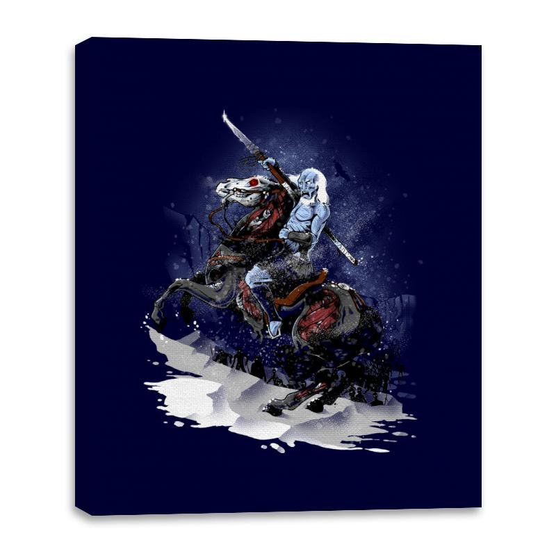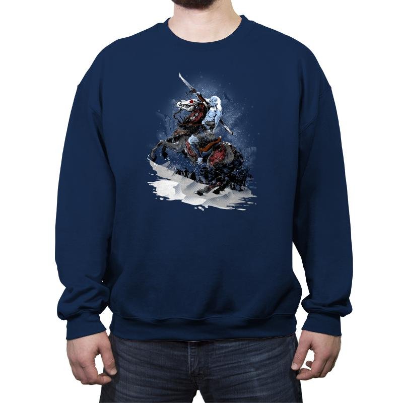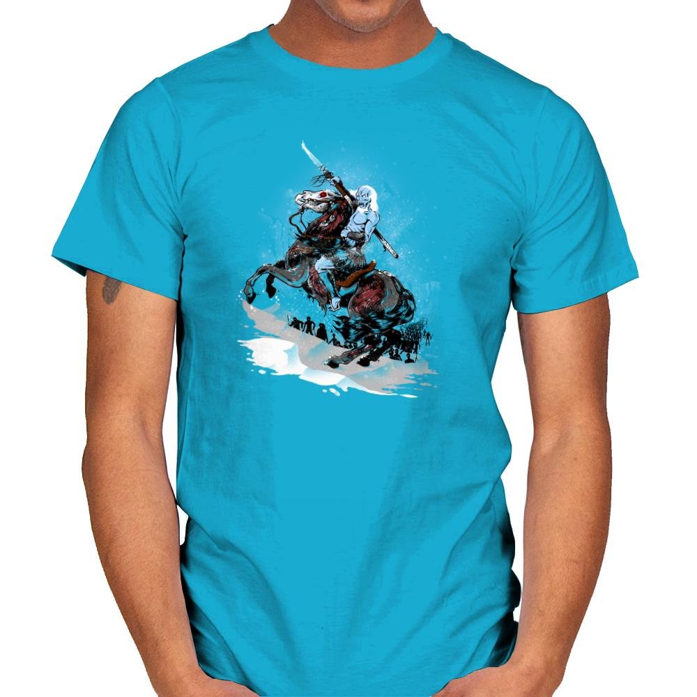 This design captures a lone warrior cutting through ice and legend in a moment that feels both ancient and cinematic. A pale swordsman rides hard through a frozen expanse, blade raised, horse mid-stride, with shadowy figures trailing behind like memories that refuse to die. The composition leans into stark contrast and motion, mixing mythic fantasy with grim survival energy. If you know the story, the image lands immediately without explanation.