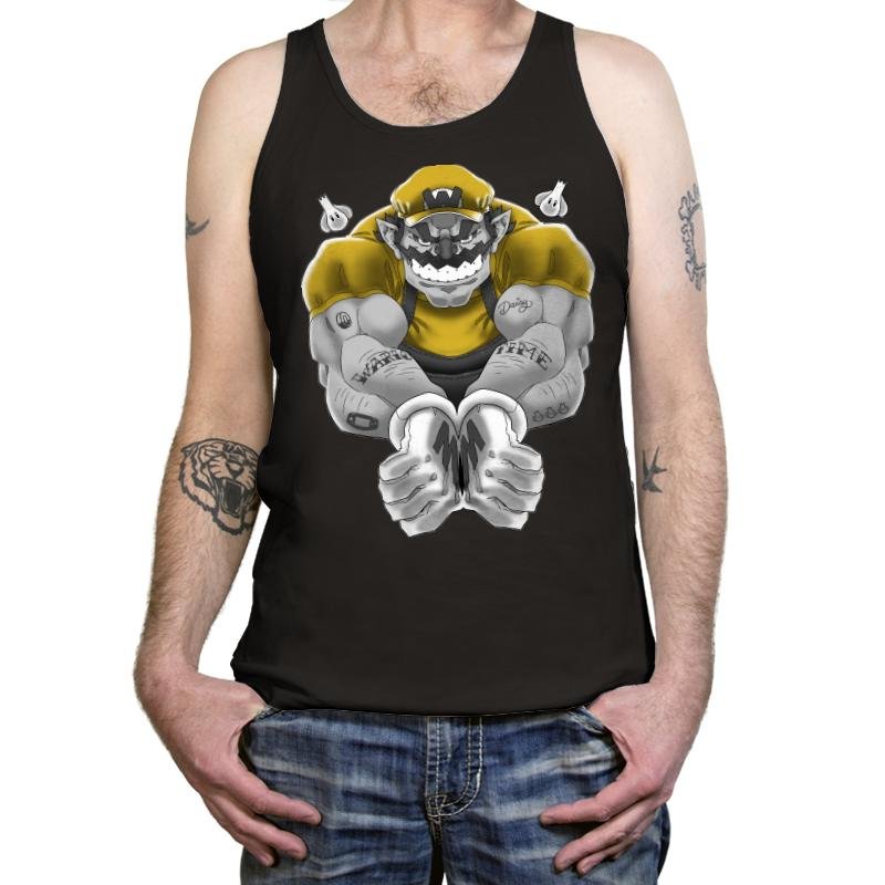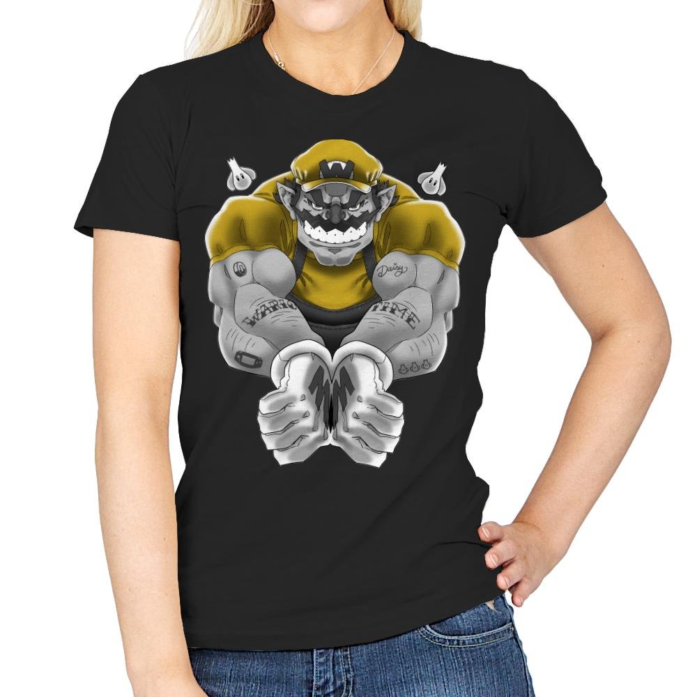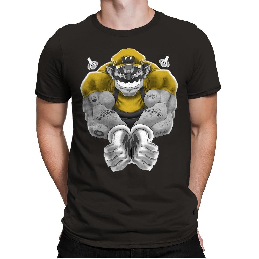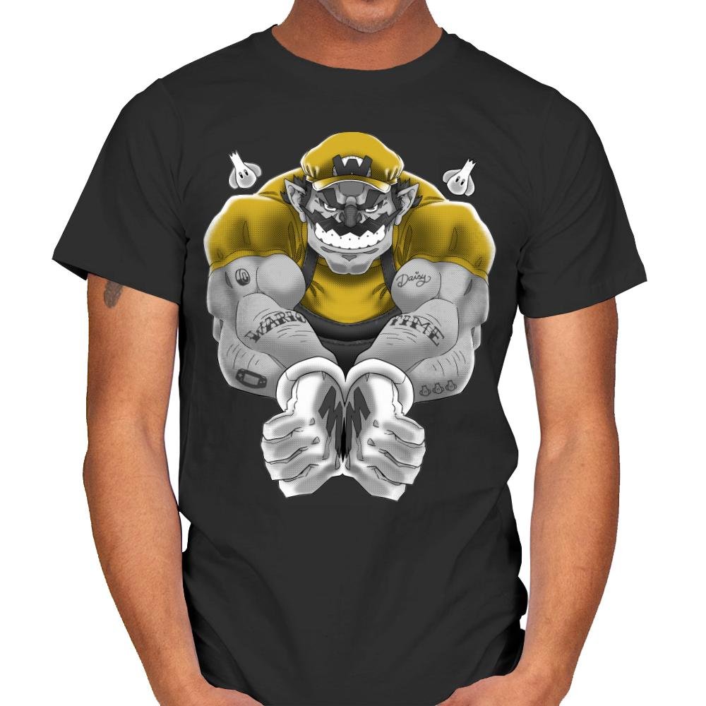 Wario Time presents a bold and intense reimagining of the iconic character, transforming him into a muscular powerhouse. This design captures Wario in a dynamic pose, showcasing his formidable strength and mischievous grin. With his yellow shirt and signature gloves, he exudes a confident, rebellious energy, while the tattooed arms add an edgy touch to his already brash persona. The gritty, comic-book style artwork emphasizes the raw power behind this beloved character, creating a unique and memorable visual.