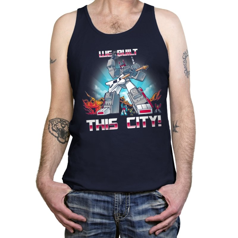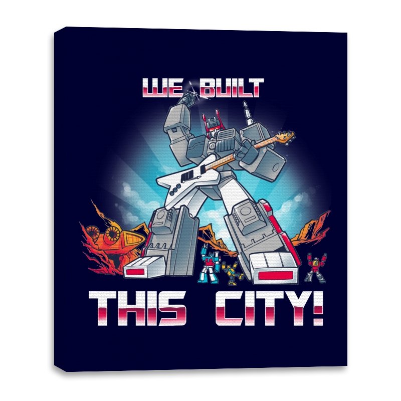 This design puts a towering robot front and center, posed like a rock god mid anthem while the city burns behind him. One hand grips a guitar, the other plants firmly like he owns the skyline, with flames and wreckage framing the scene. The typography sells the punchline without subtlety, leaning into the absurdity of scale and ego. If you know the reference, the joke lands somewhere between triumph and parody.