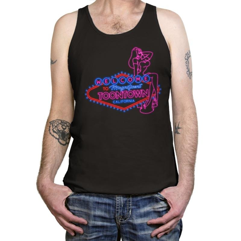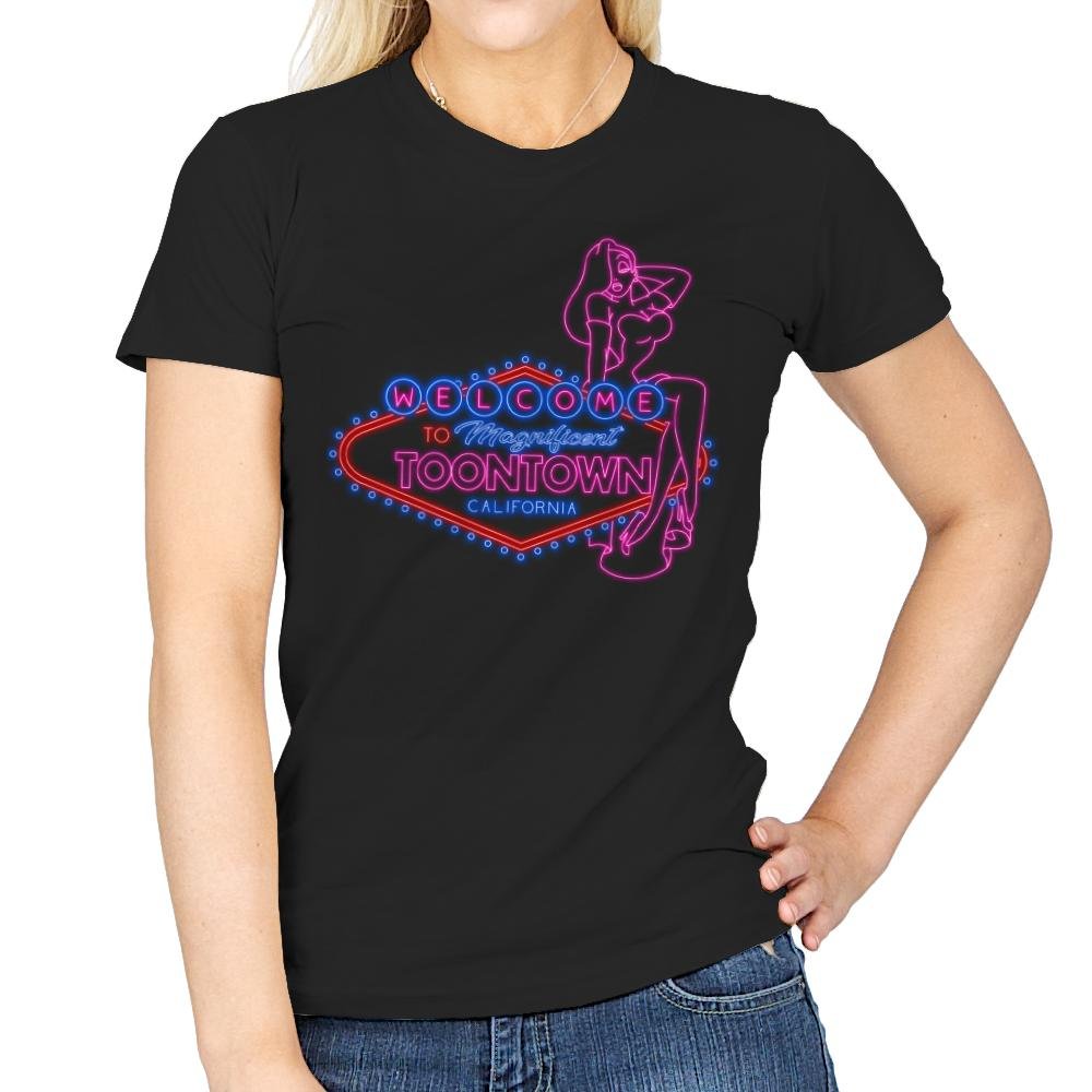 This design recreates a neon roadside welcome sign with unmistakable cartoon glamour and late-night energy. Bright pink and blue tubing frame a classic city greeting, while a confident animated figure lounges against the sign like part of the skyline. The glow, curves, and lettering pull straight from vintage Vegas aesthetics filtered through animated irreverence. It feels like a postcard from a place that plays by its own rules.
