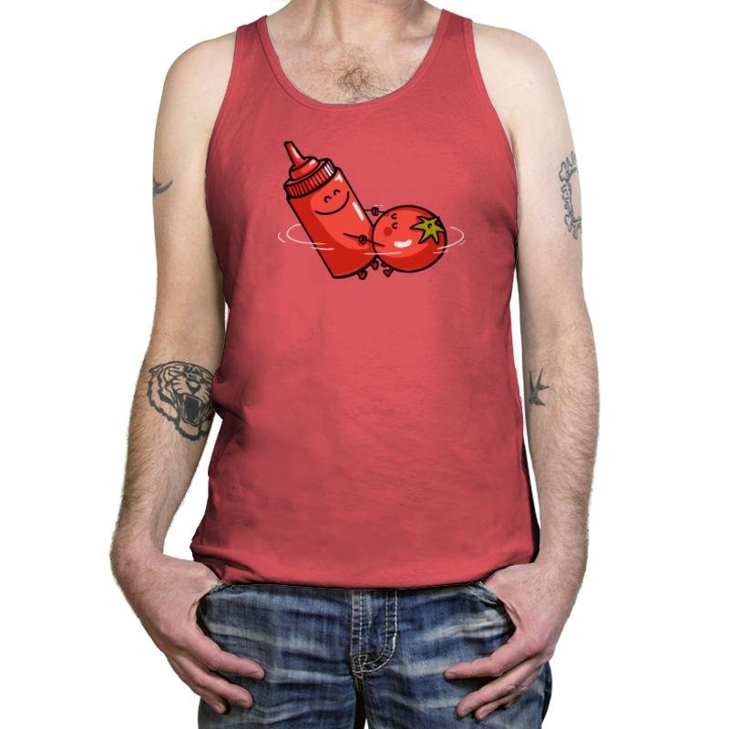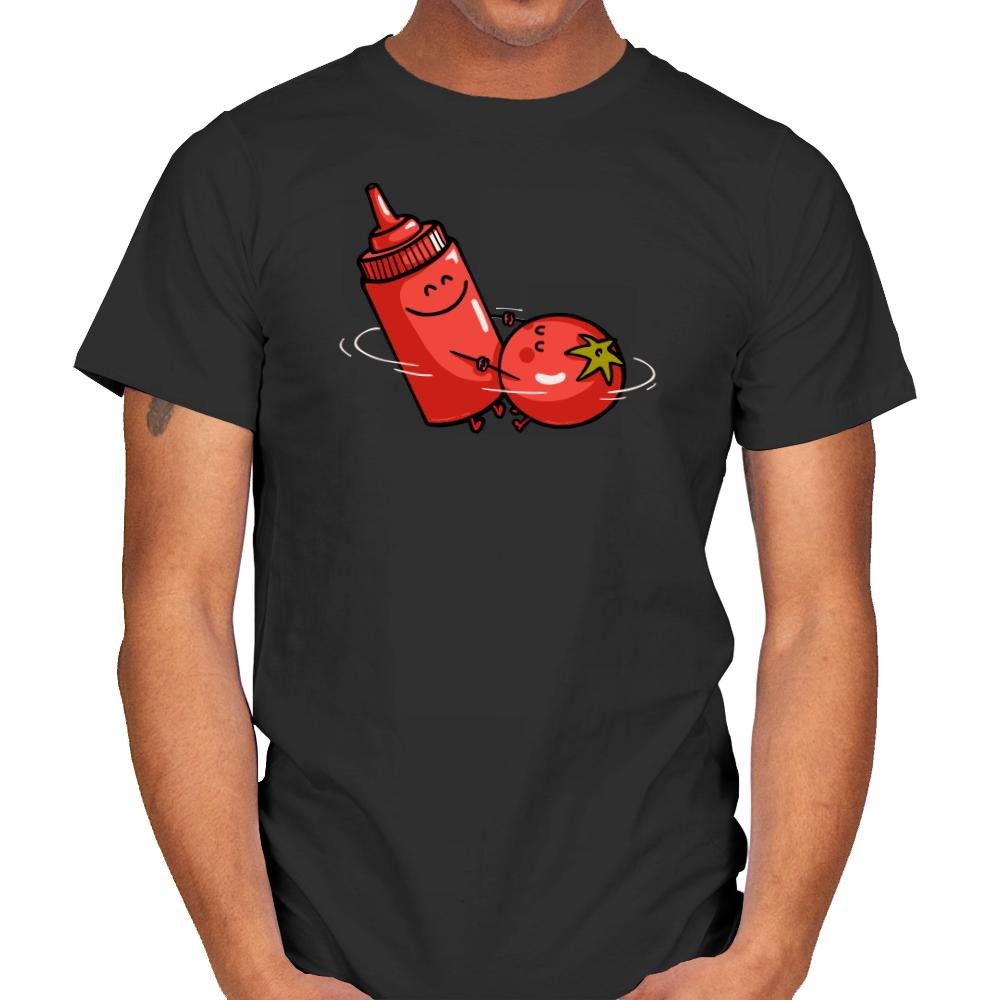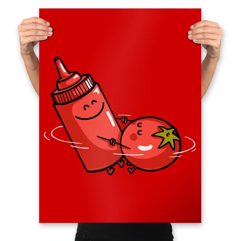 This design turns a messy, debated pairing into something oddly sincere. A smiling squeeze bottle and a tomato spin together like they have settled an argument that never needed words. The expressions are simple, the motion is playful, and the joke lands because it treats an everyday controversy as mutual respect. If you already know why this pairing sparks opinions, the image says enough.