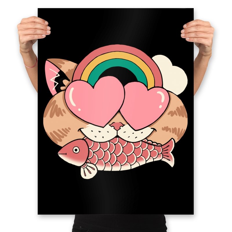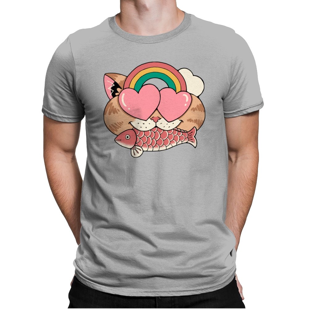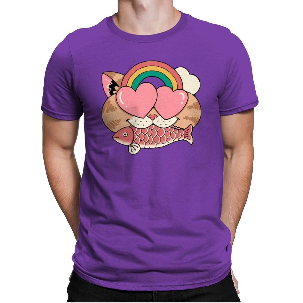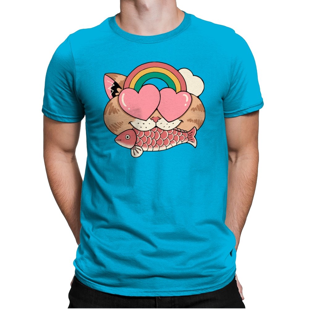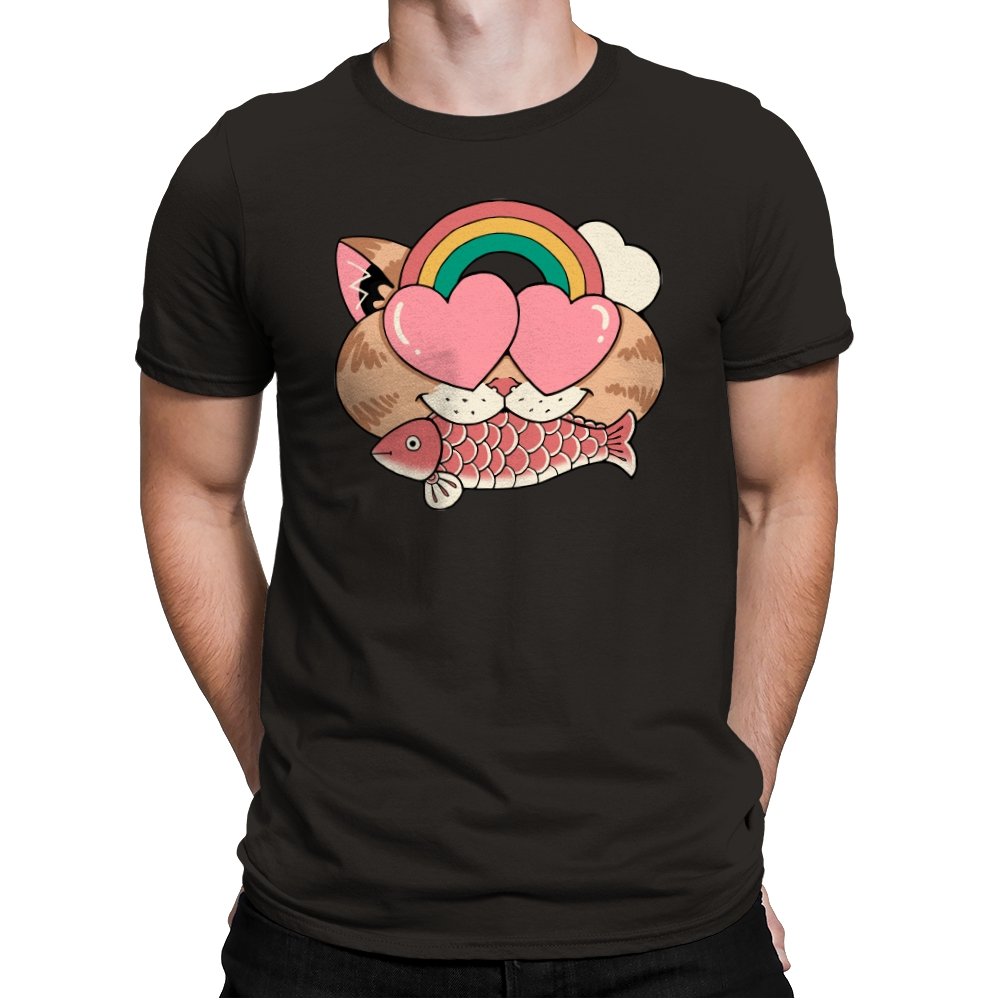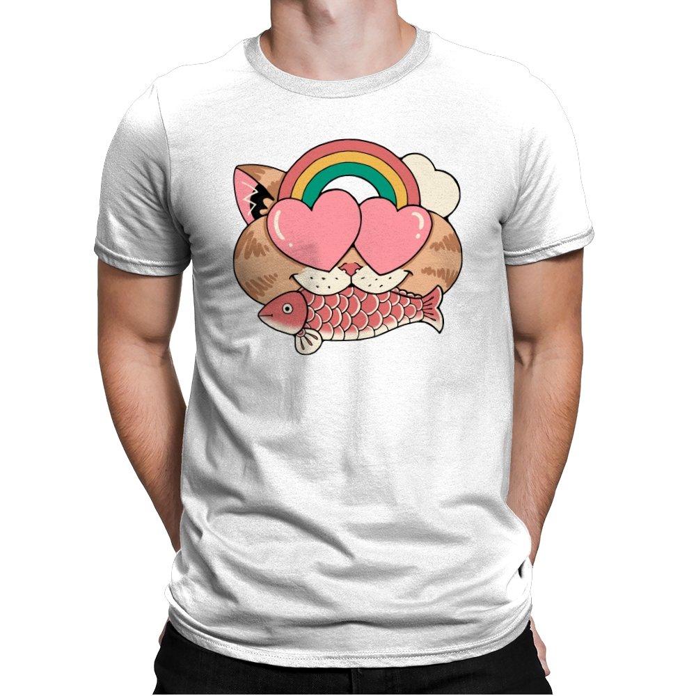 Whimsical Whiskers I captures the playful spirit of a cat with heart-shaped eyes, rainbow dreams, and a fish in tow. The design combines cute and quirky elements—like the cat’s love-struck expression and the vibrant colors of the rainbow—with a soft, retro aesthetic. It’s a fun and lighthearted tribute to the unexpected joys of life, all wrapped up in an adorable, animal-inspired design.