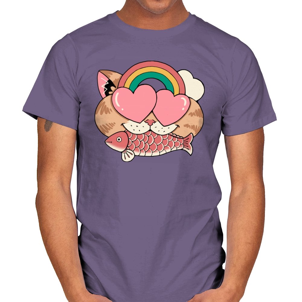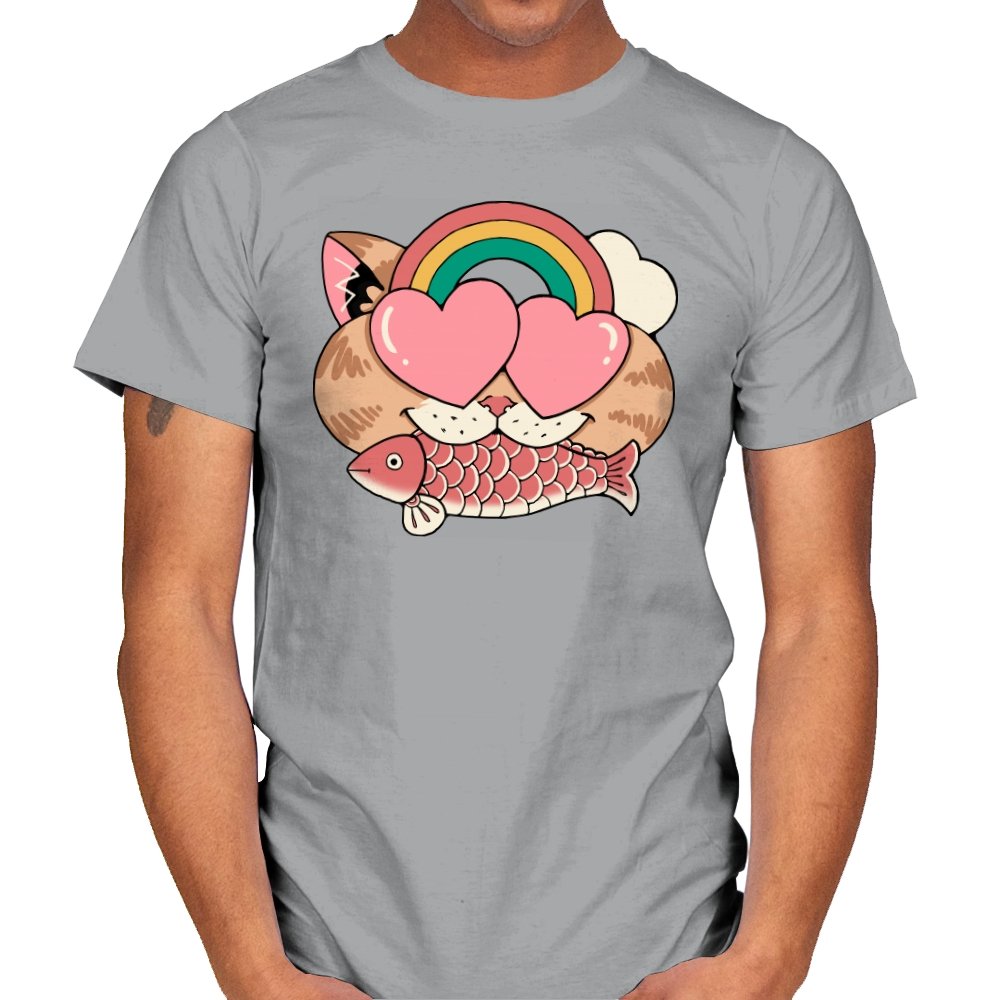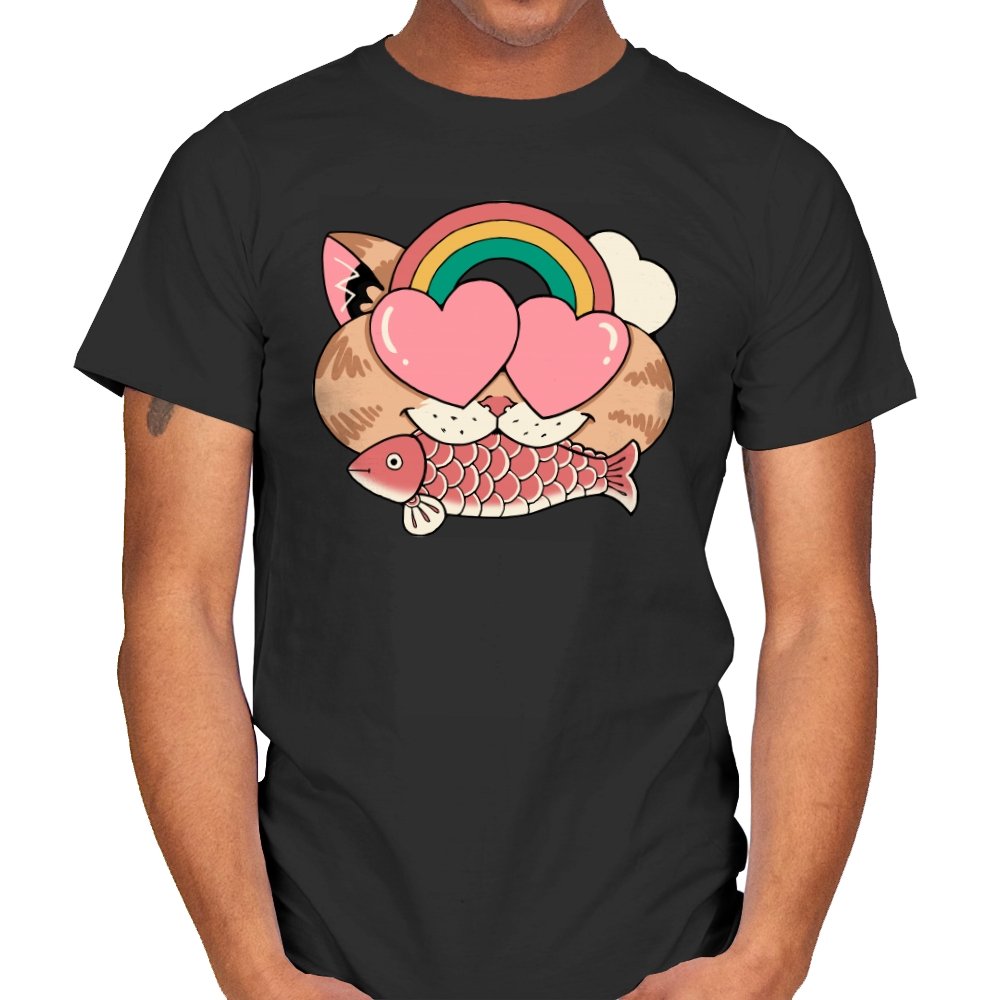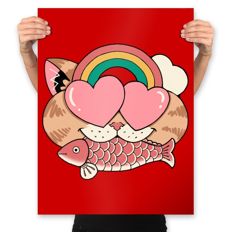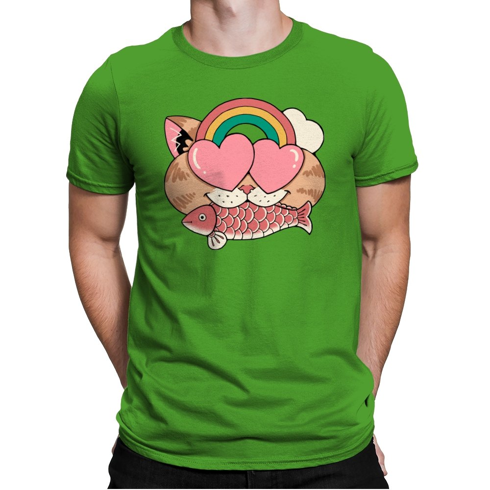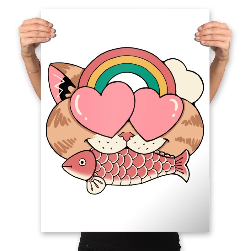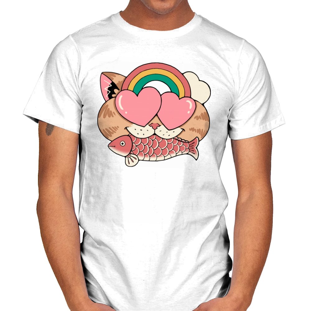 Whimsical Whiskers I captures the playful spirit of a cat with heart-shaped eyes, rainbow dreams, and a fish in tow. The design combines cute and quirky elements—like the cat’s love-struck expression and the vibrant colors of the rainbow—with a soft, retro aesthetic. It’s a fun and lighthearted tribute to the unexpected joys of life, all wrapped up in an adorable, animal-inspired design.