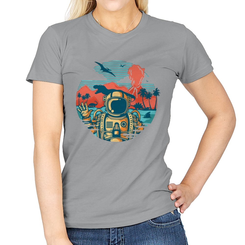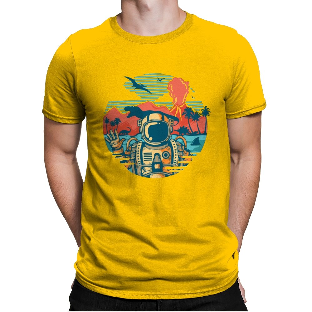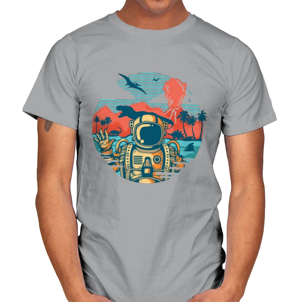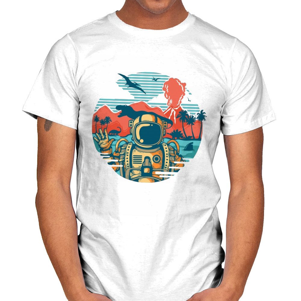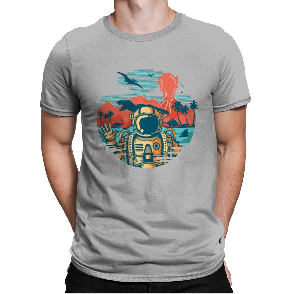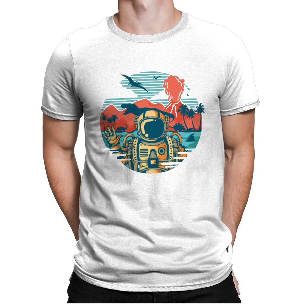 This design captures the moment when your tropical getaway turns out to be a prehistoric nightmare. The astronaut throws up a casual peace sign while palm trees sway and something large and definitely carnivorous lurks in the background. The retro sunset color palette and vintage travel poster aesthetic make it look like a destination brochure, except the destination wants to eat you. It’s the visual equivalent of checking into paradise and realizing you’ve landed somewhere several million years and one evolutionary era off target.