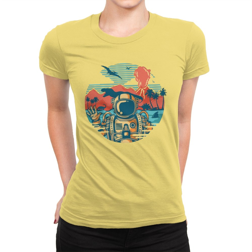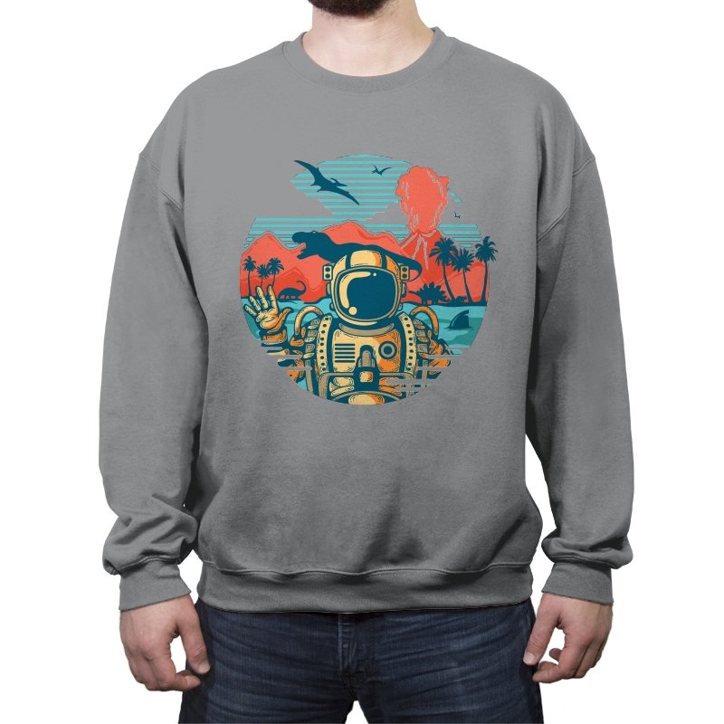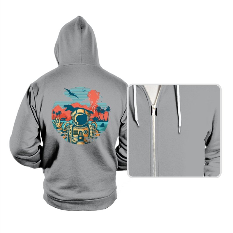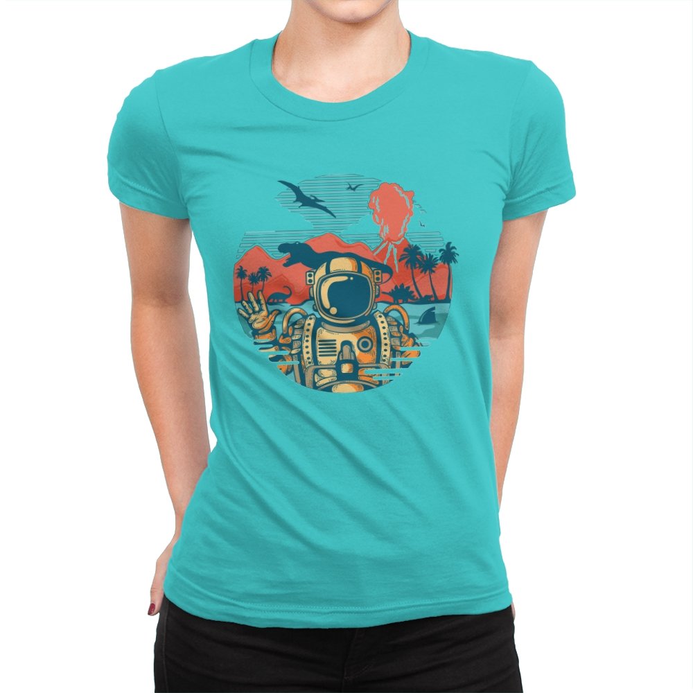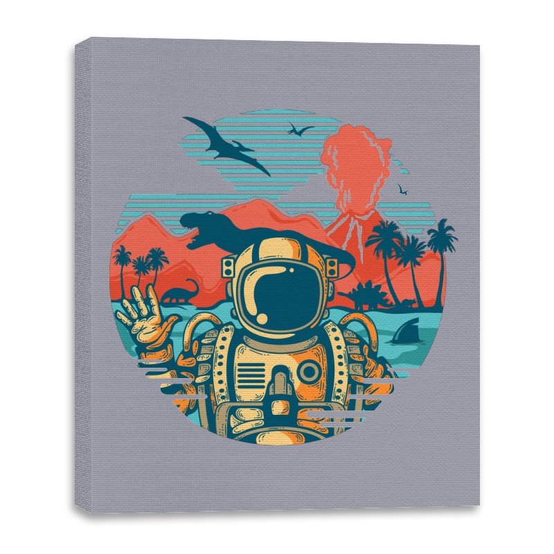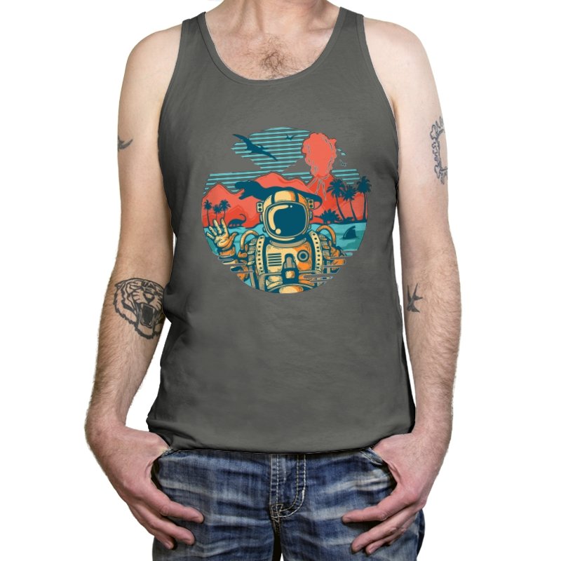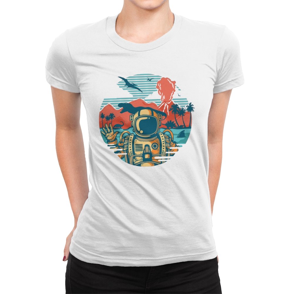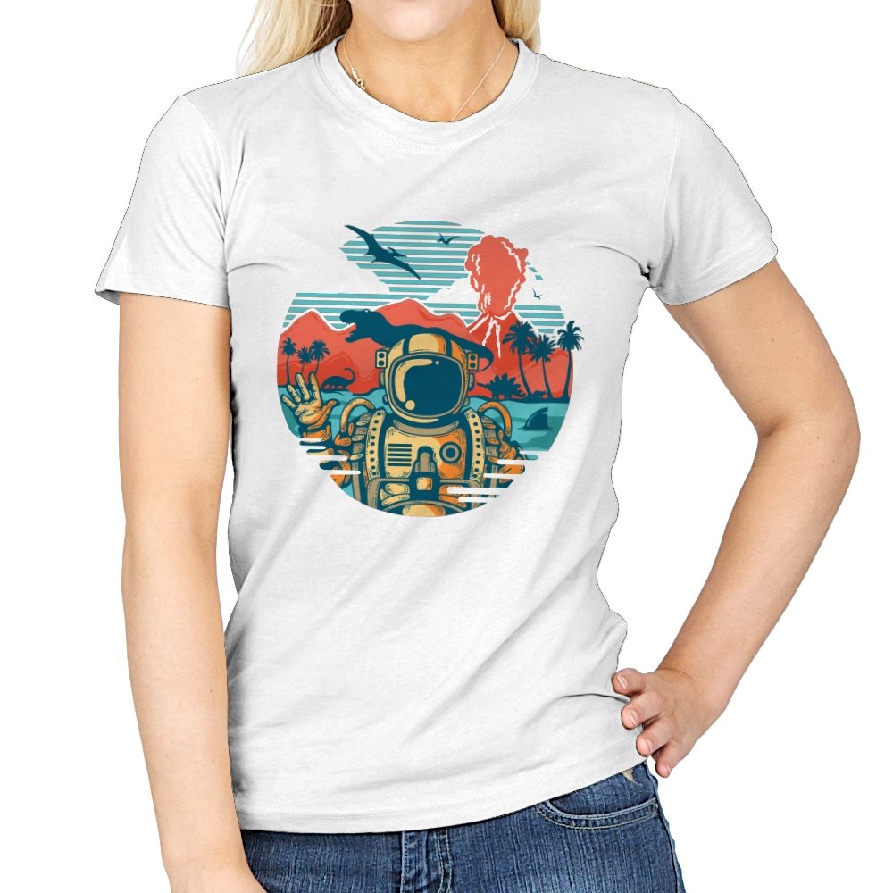 This design captures the moment when your tropical getaway turns out to be a prehistoric nightmare. The astronaut throws up a casual peace sign while palm trees sway and something large and definitely carnivorous lurks in the background. The retro sunset color palette and vintage travel poster aesthetic make it look like a destination brochure, except the destination wants to eat you. It’s the visual equivalent of checking into paradise and realizing you’ve landed somewhere several million years and one evolutionary era off target.