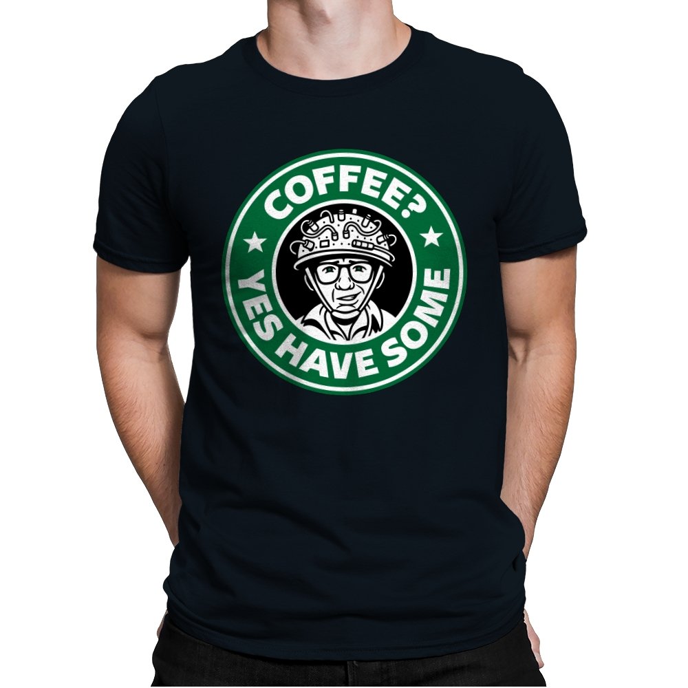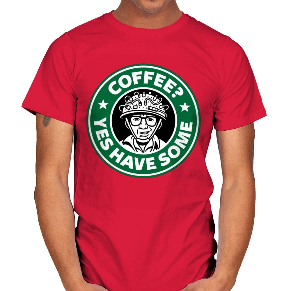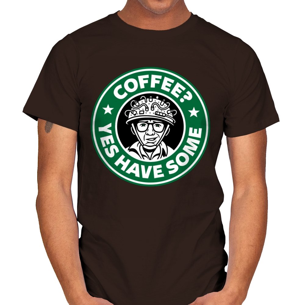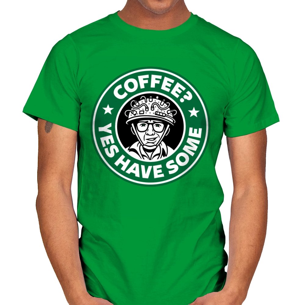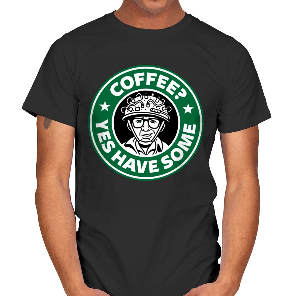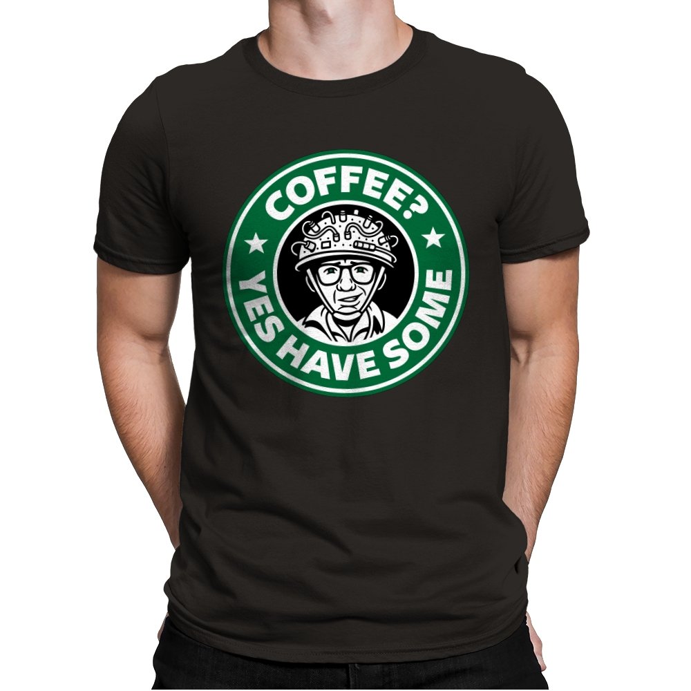 This design leans into a familiar coffee logo, then swaps in a calm, brilliant figure who knows exactly what he wants. The circular badge, bold green palette, and knowing expression sell the joke immediately. It is a quiet nod to caffeine rituals and sharp minds, made for people who caught the reference the first time they heard it. Nothing is explained because it does not need to be.