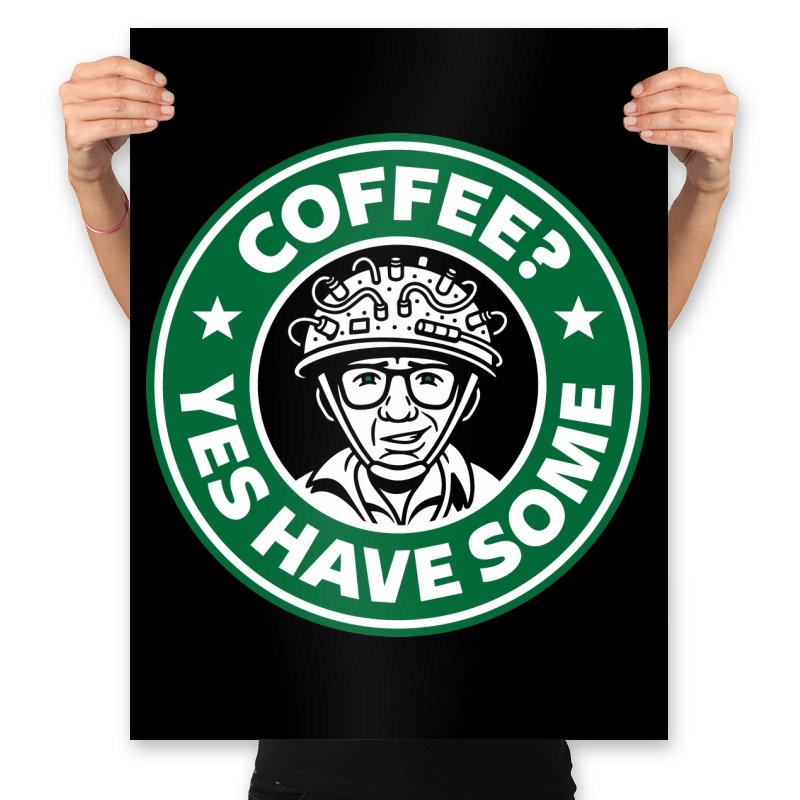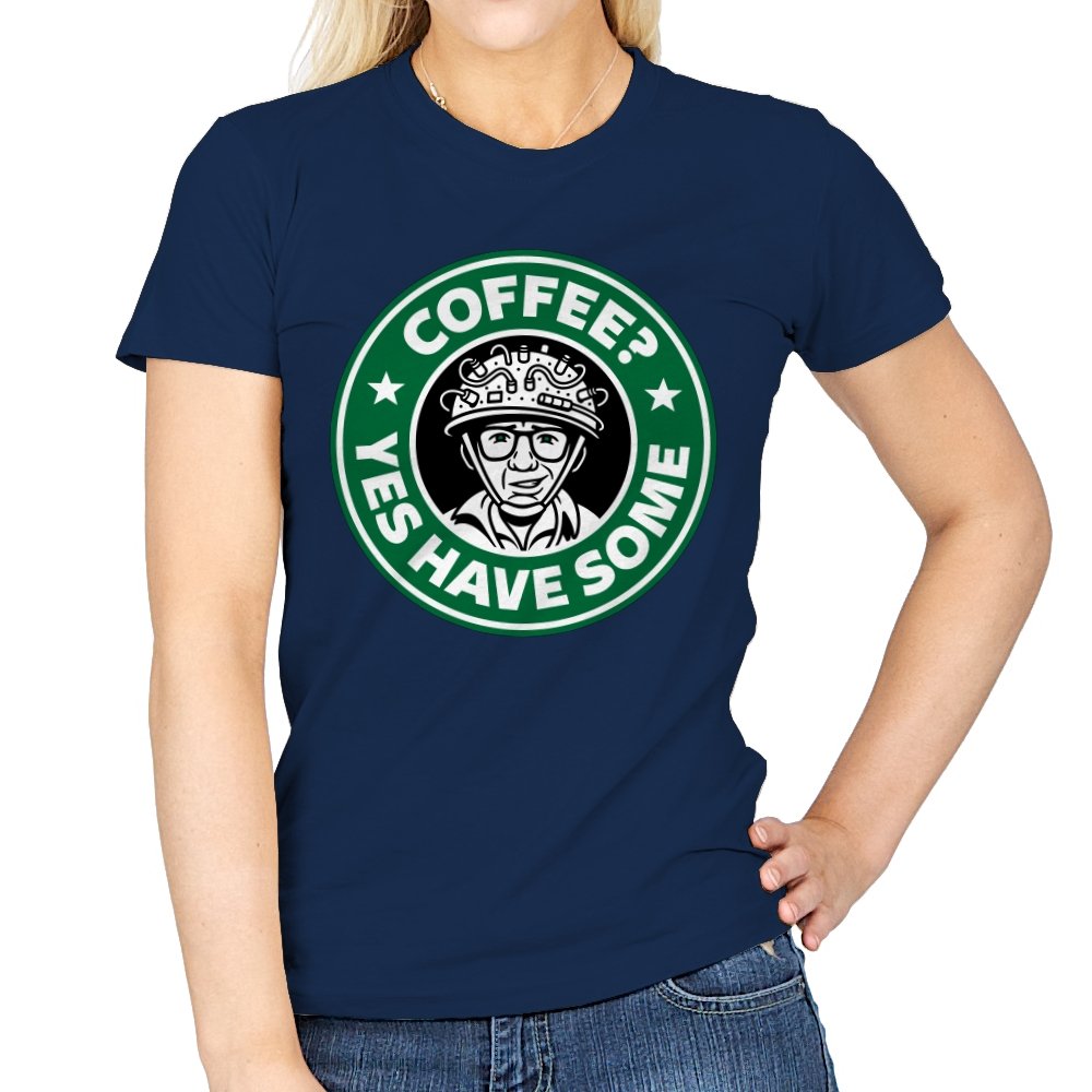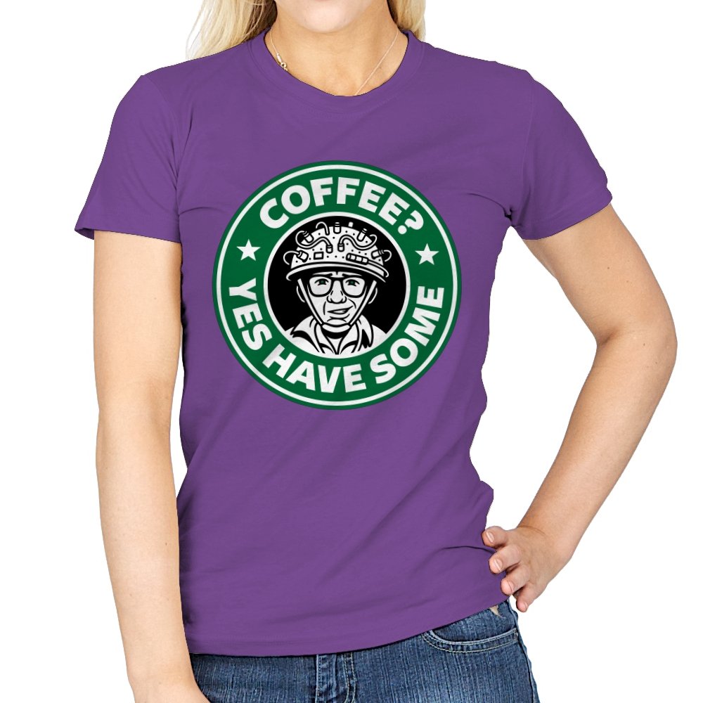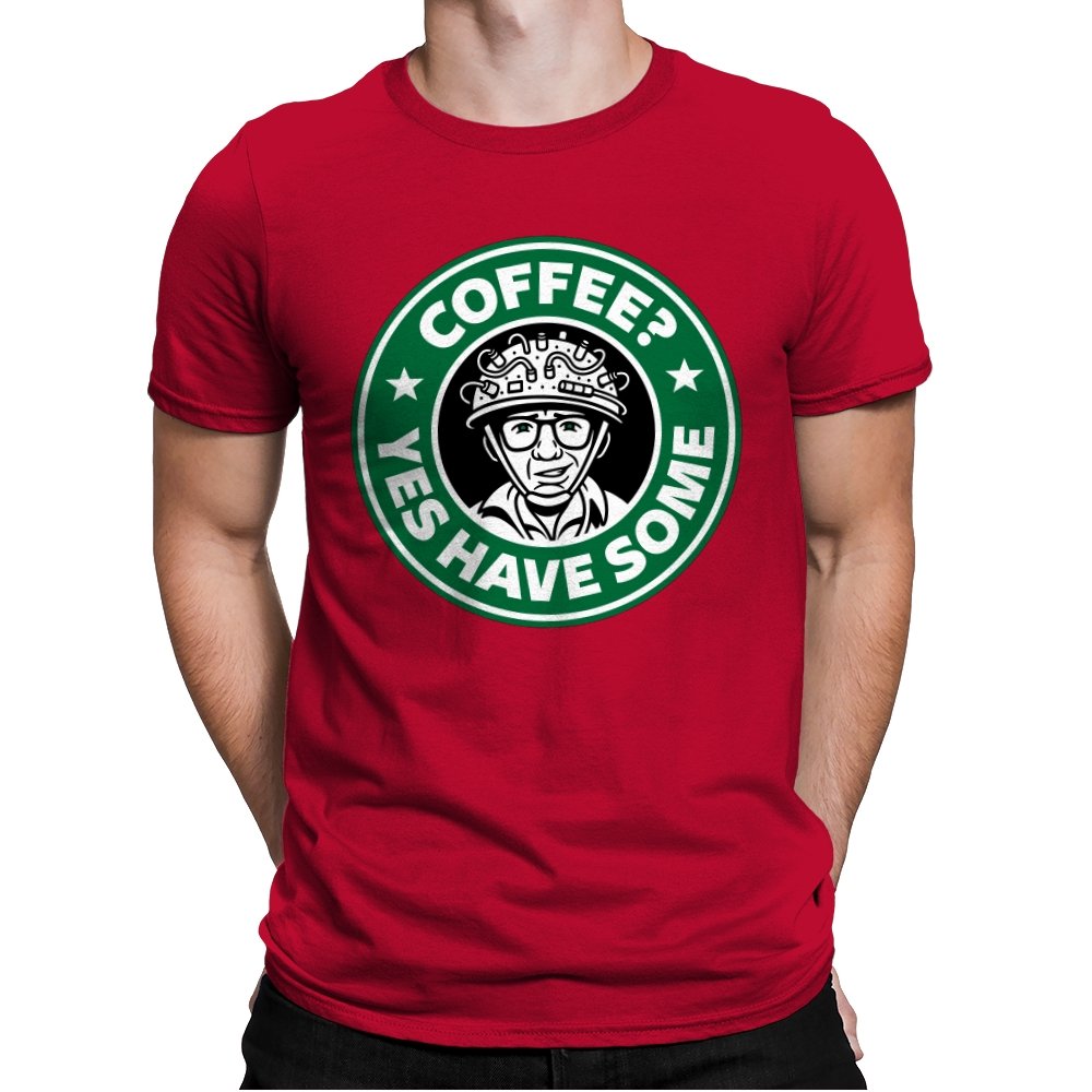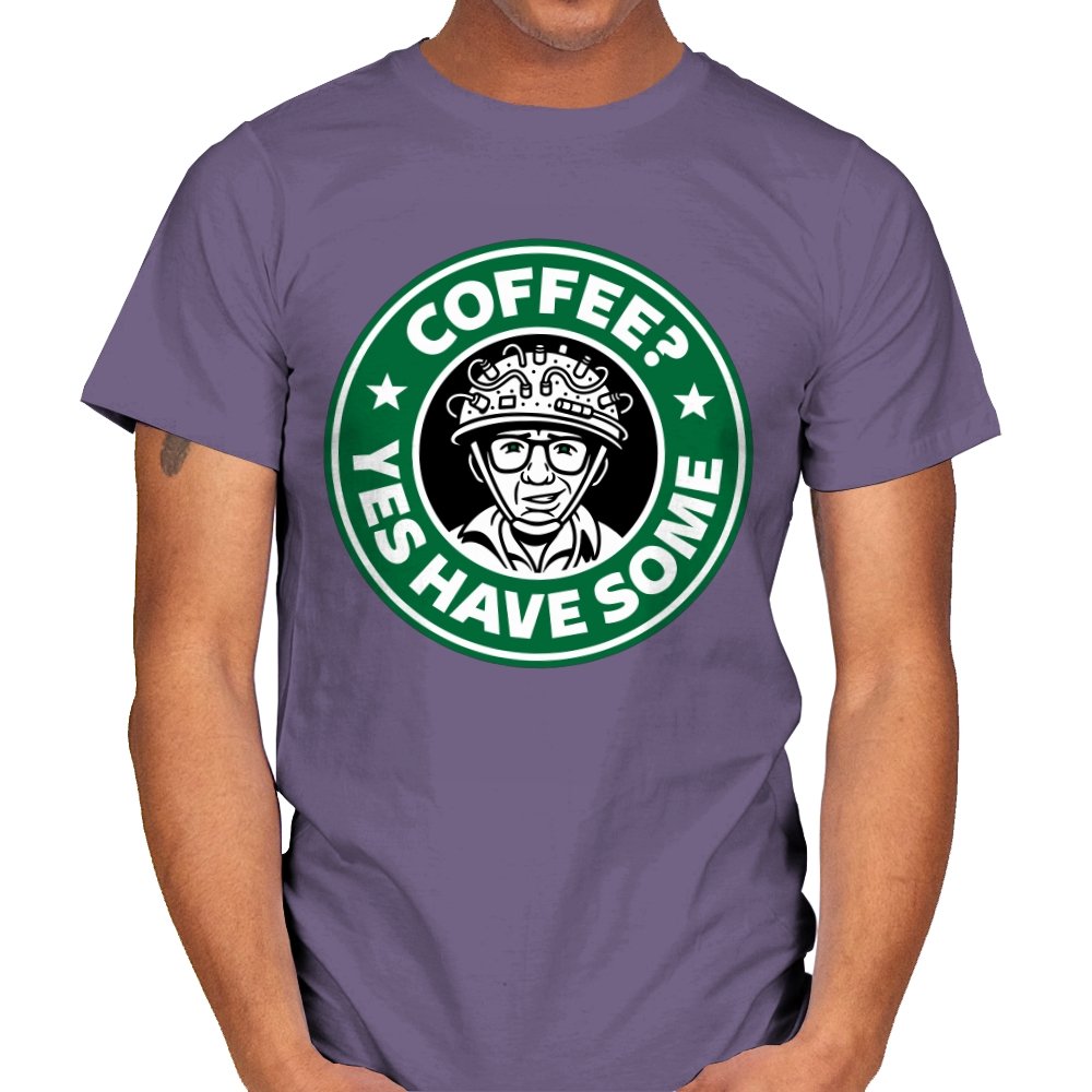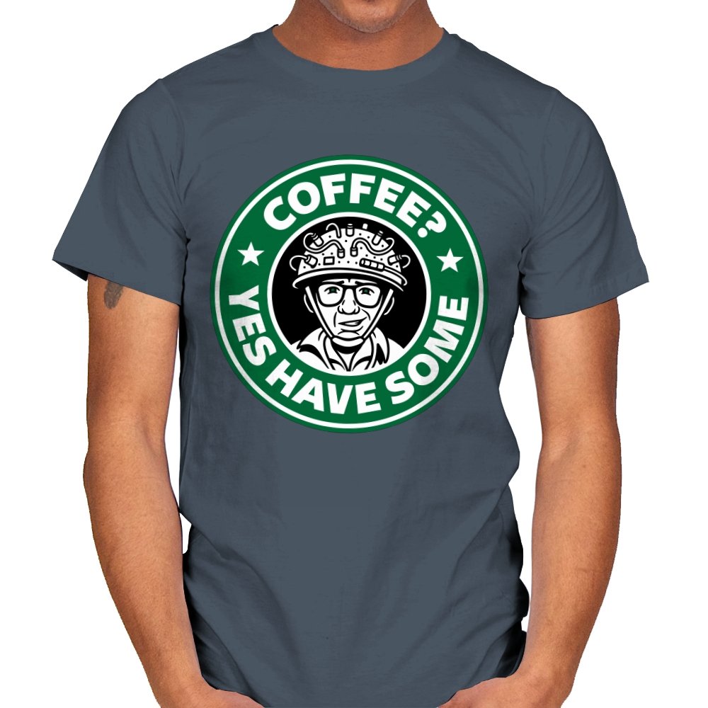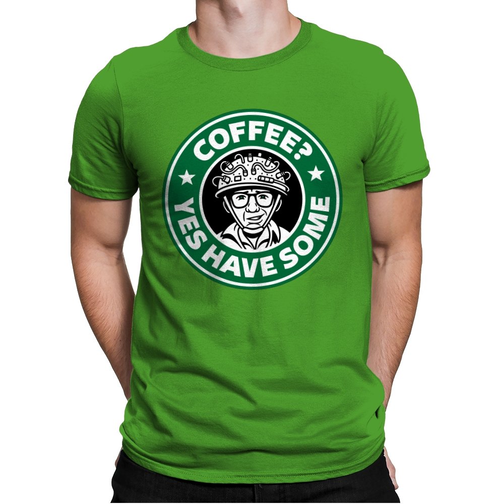 This design leans into a familiar coffee logo, then swaps in a calm, brilliant figure who knows exactly what he wants. The circular badge, bold green palette, and knowing expression sell the joke immediately. It is a quiet nod to caffeine rituals and sharp minds, made for people who caught the reference the first time they heard it. Nothing is explained because it does not need to be.